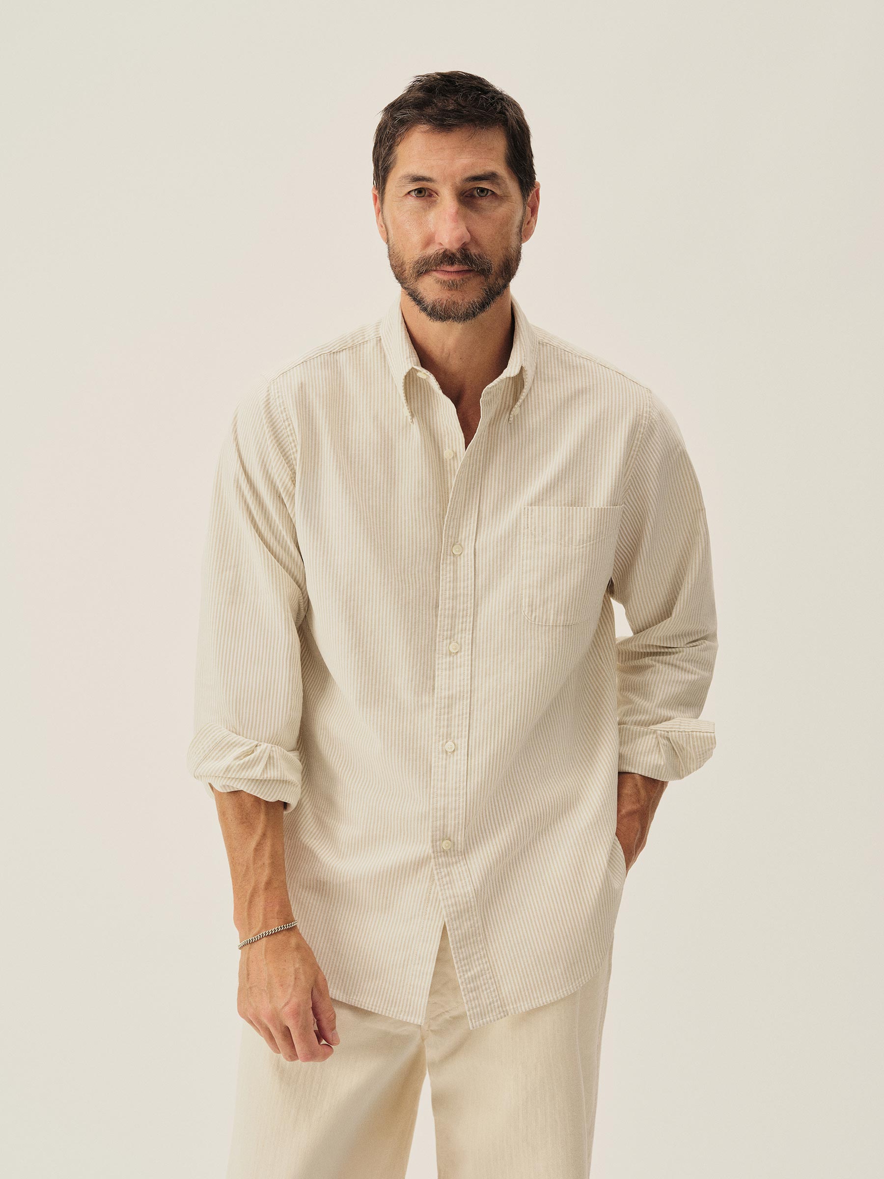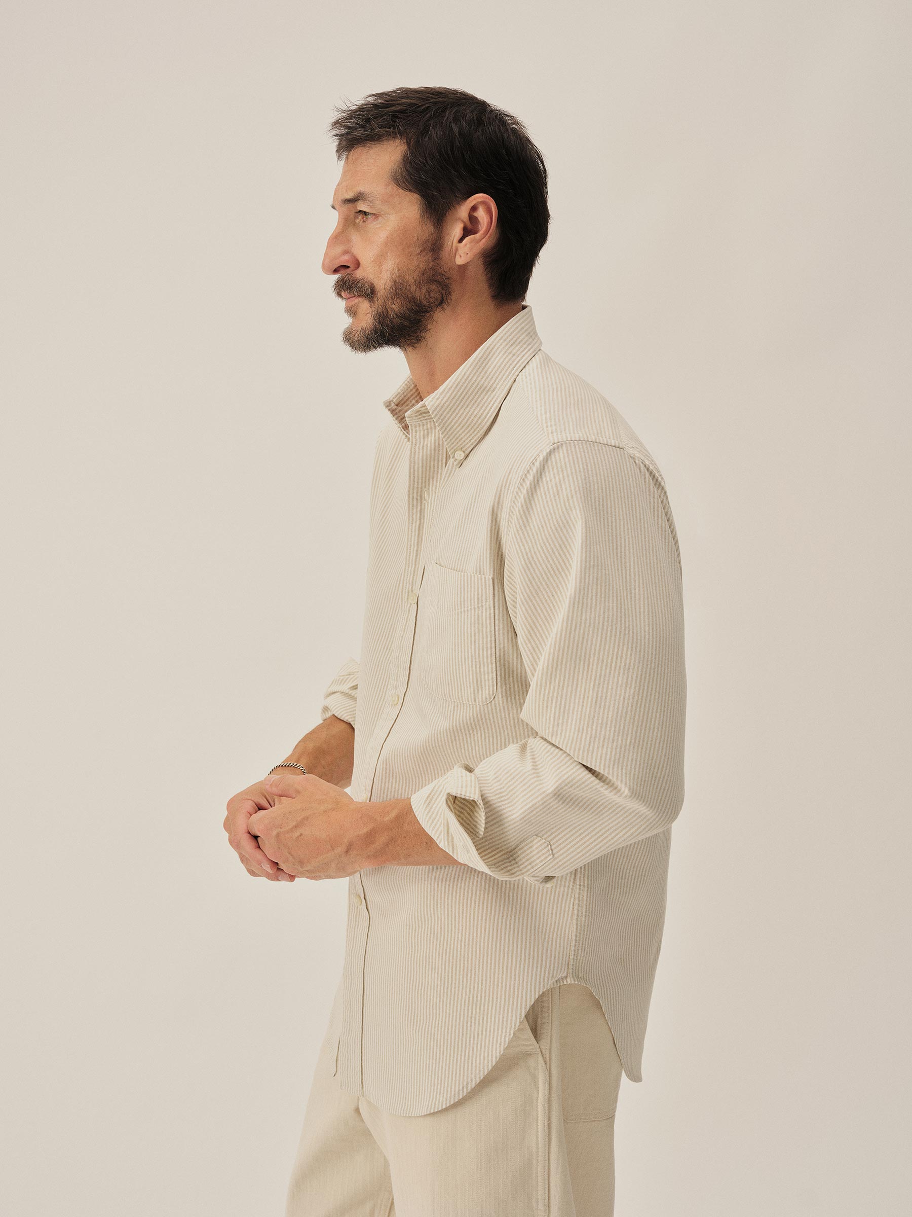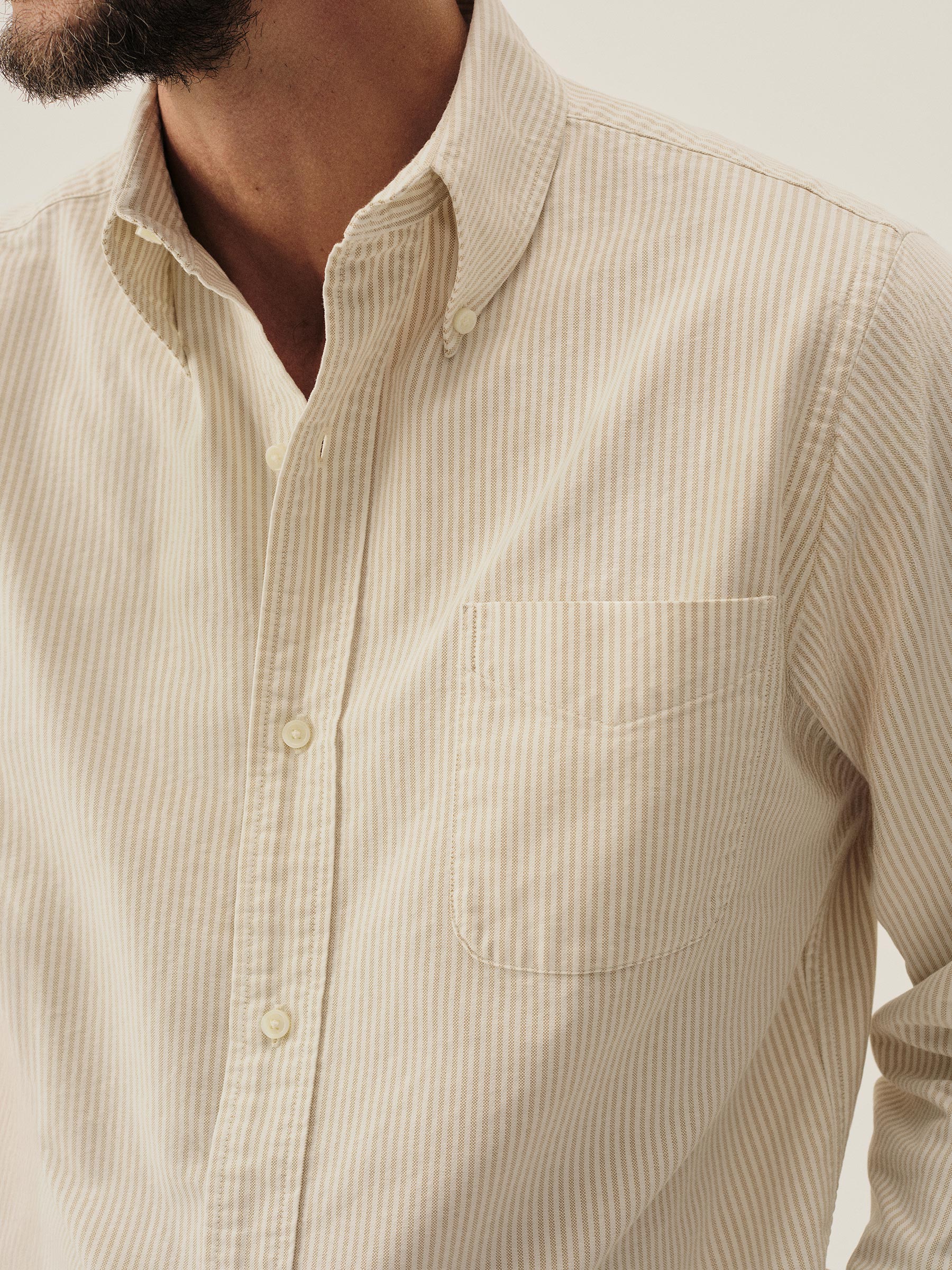 The Big Oxford is a subtle nod to vintage Ivy League tailoring with a gently oversized fit — referencing the proportions of archival American Oxfords. Built from 100% cotton in a 175 GSM heavyweight Oxford weave, using fine combed yarn in the warp and durable carded yarn in the weft. Finished with slightly thicker troca shell buttons.