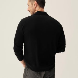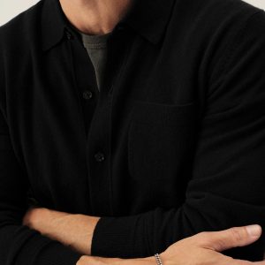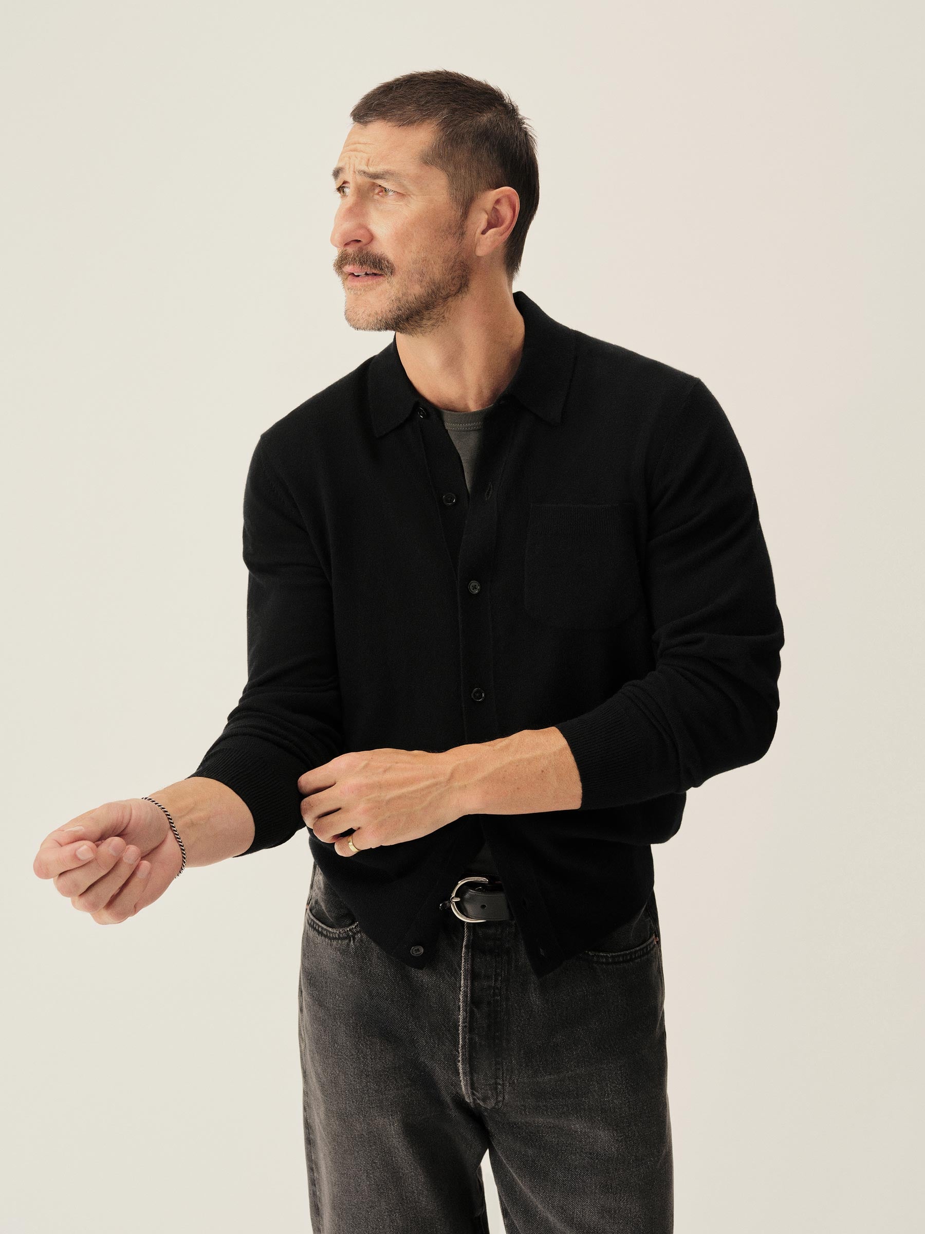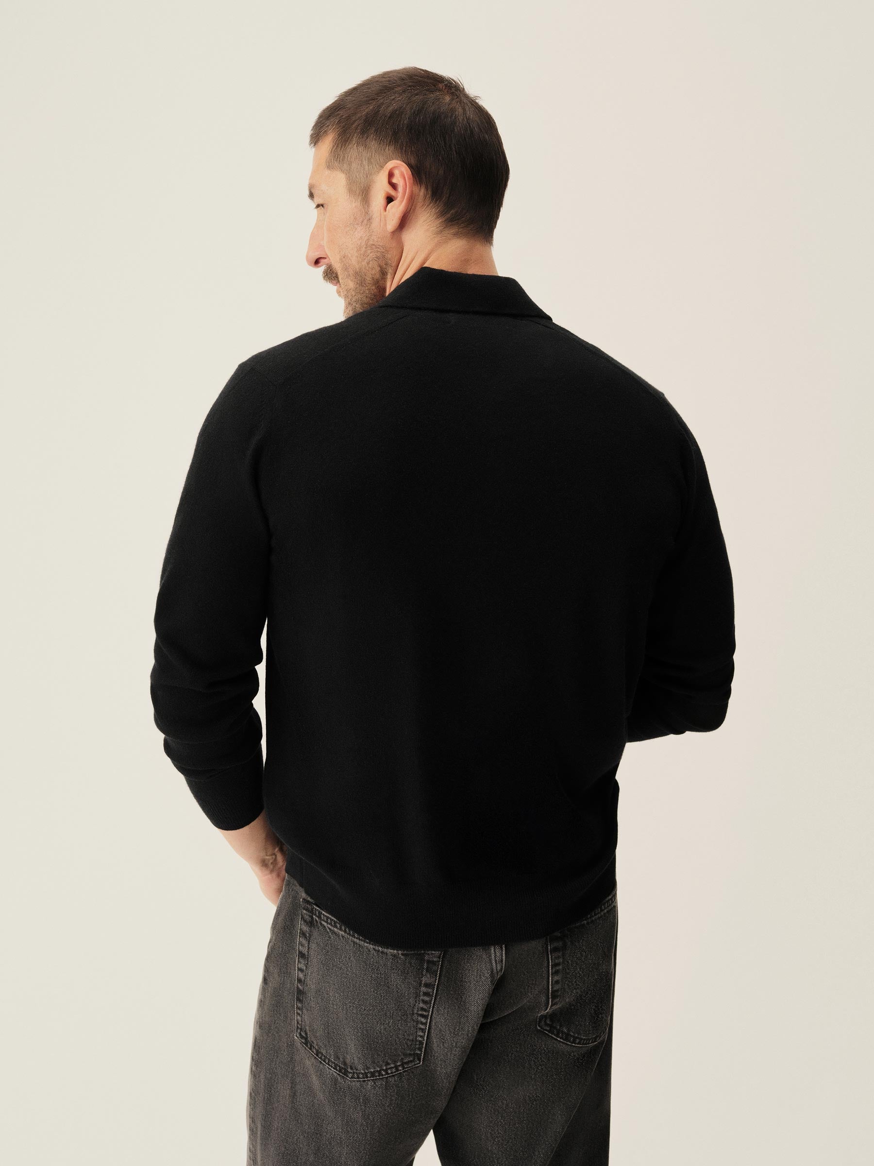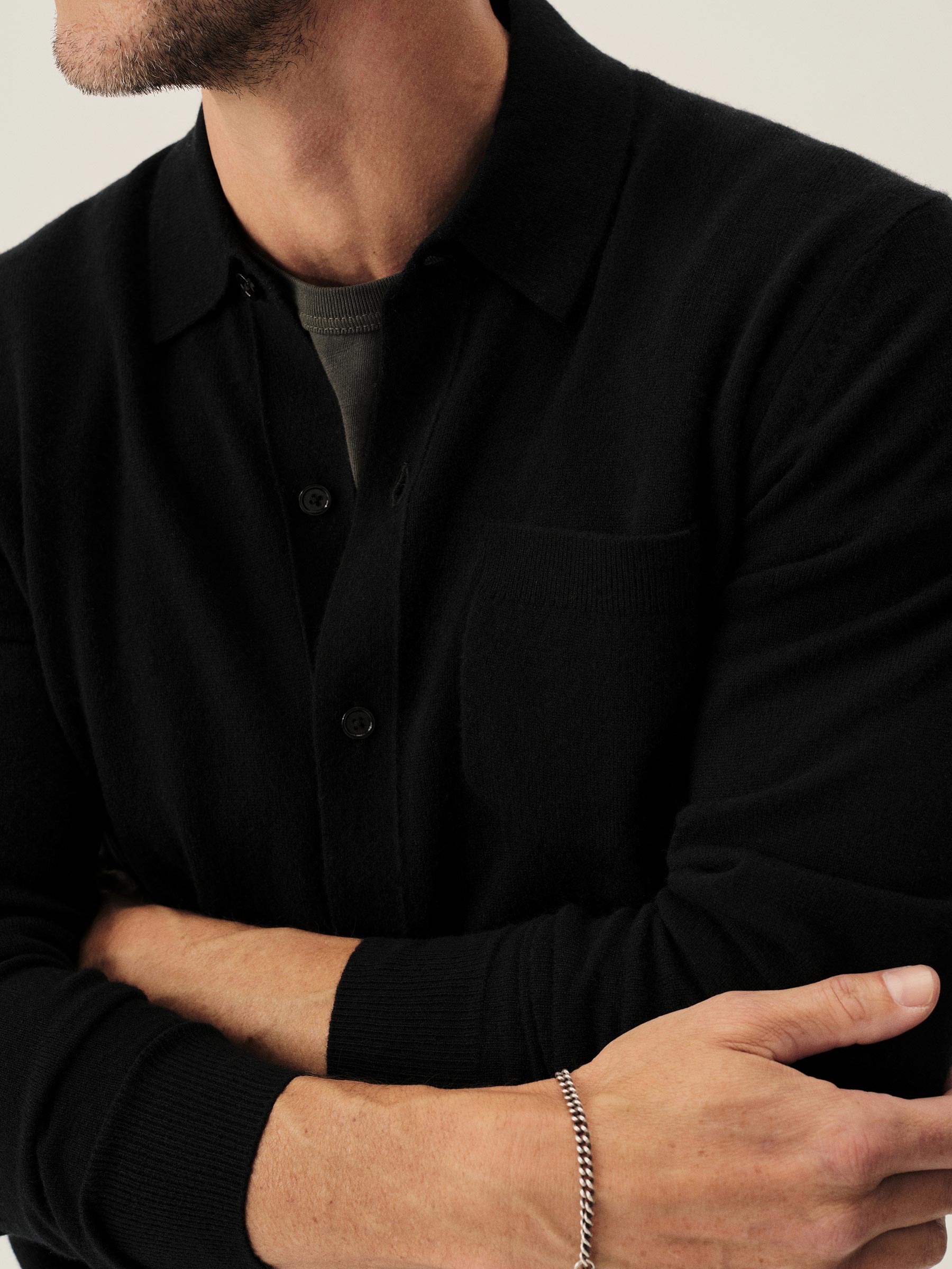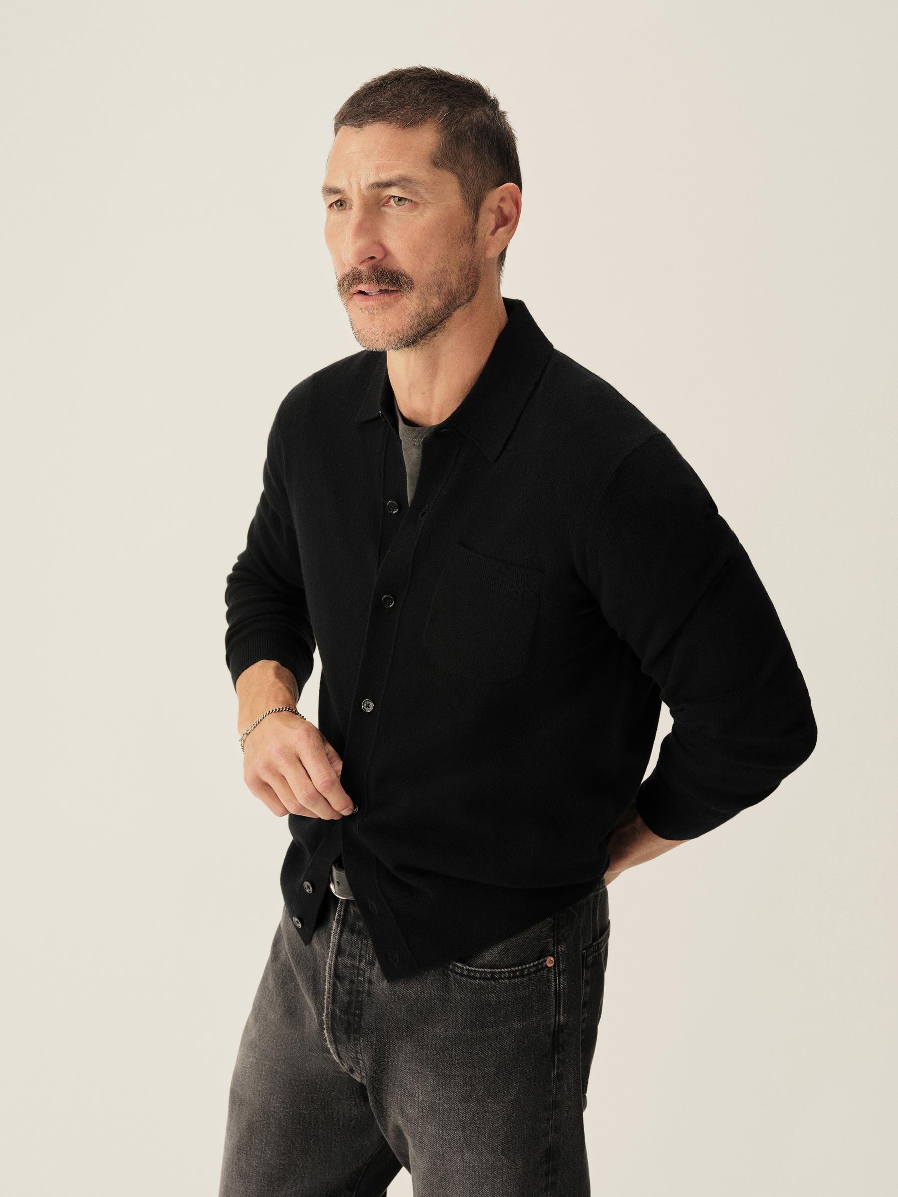 Classic fit long sleeve button-front sweater in a 12 gauge jersey knit from yarn-dyed long staple cashmere. Details include a three-button placket with shell buttons and ribbing at the cuffs and hem. Constructed with hand-linked seams for durability.