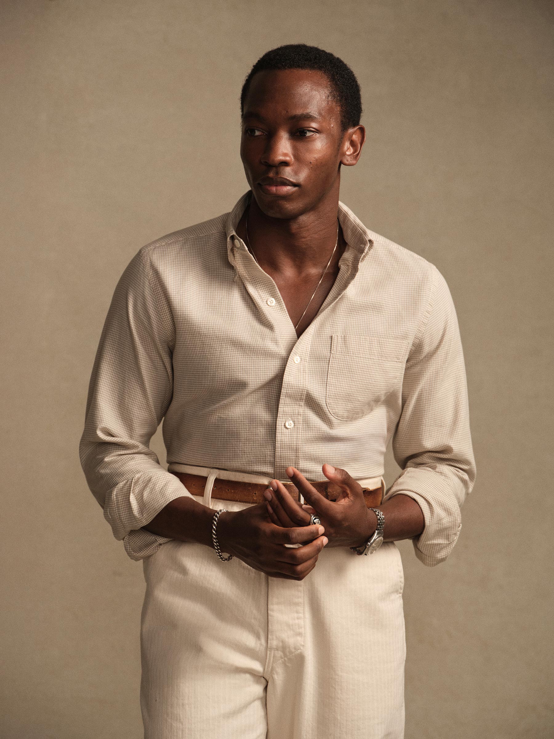 Classic fit button down collar shirt cut from a proprietary 3 oz blend of cotton and tencel. Details include mother of pearl buttons, a single scallop pocket, and a box pleat at the back. Constructed with clean finished seams. Garment washed for a lived-in look and feel.