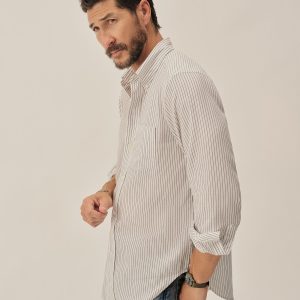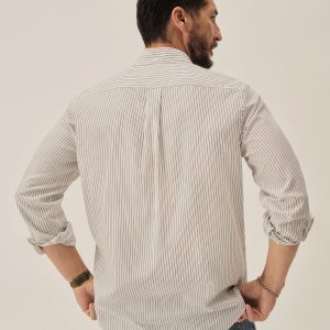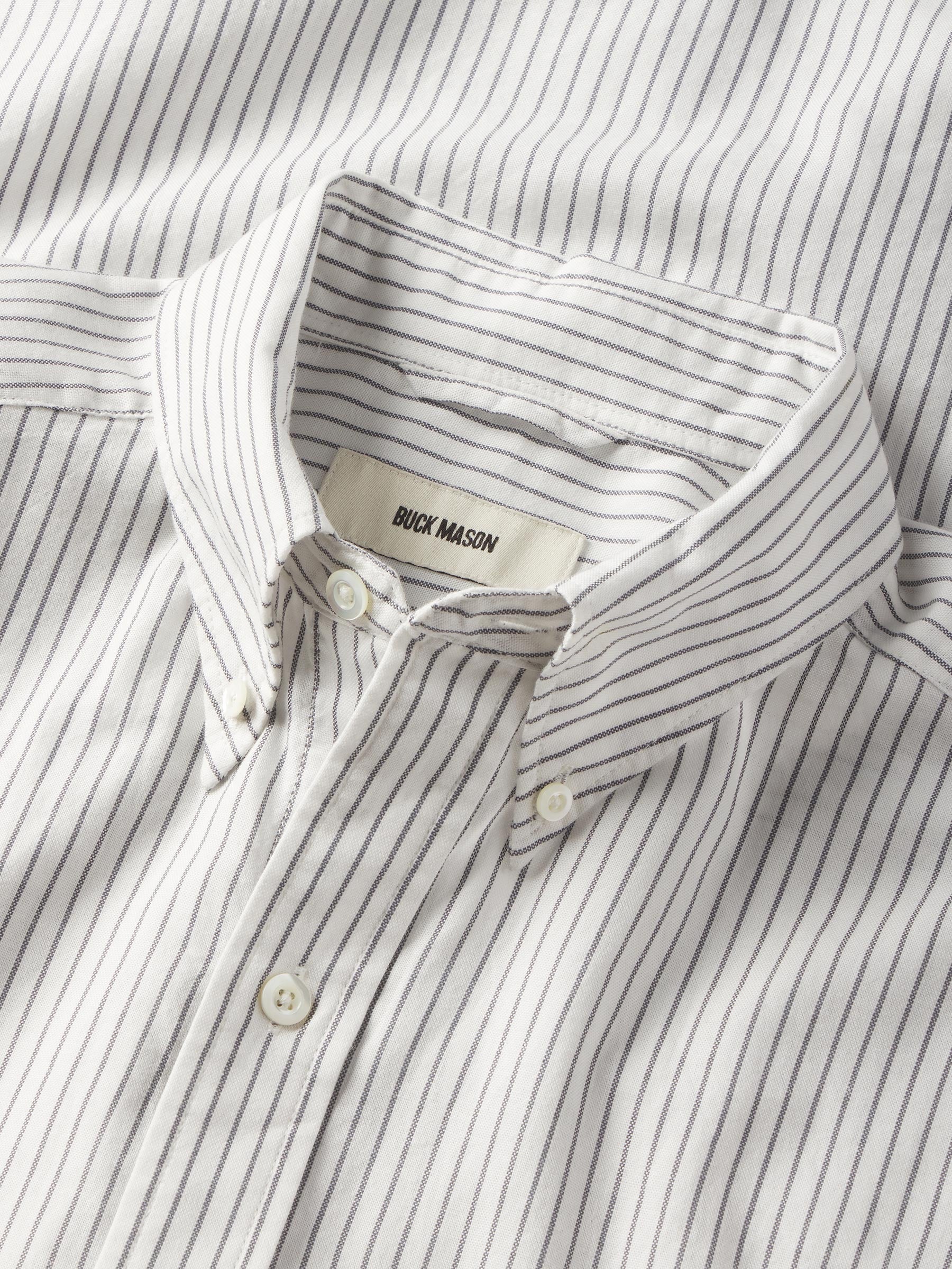 Classic fit button down collar shirt cut from a proprietary 3 oz blend of cotton and tencel. Details include mother of pearl buttons, a single scallop pocket, and a box pleat at the back. Constructed with clean finished seams. Garment washed for a lived-in look and feel.