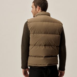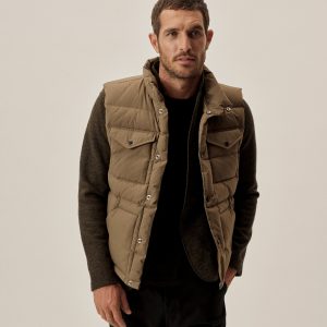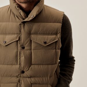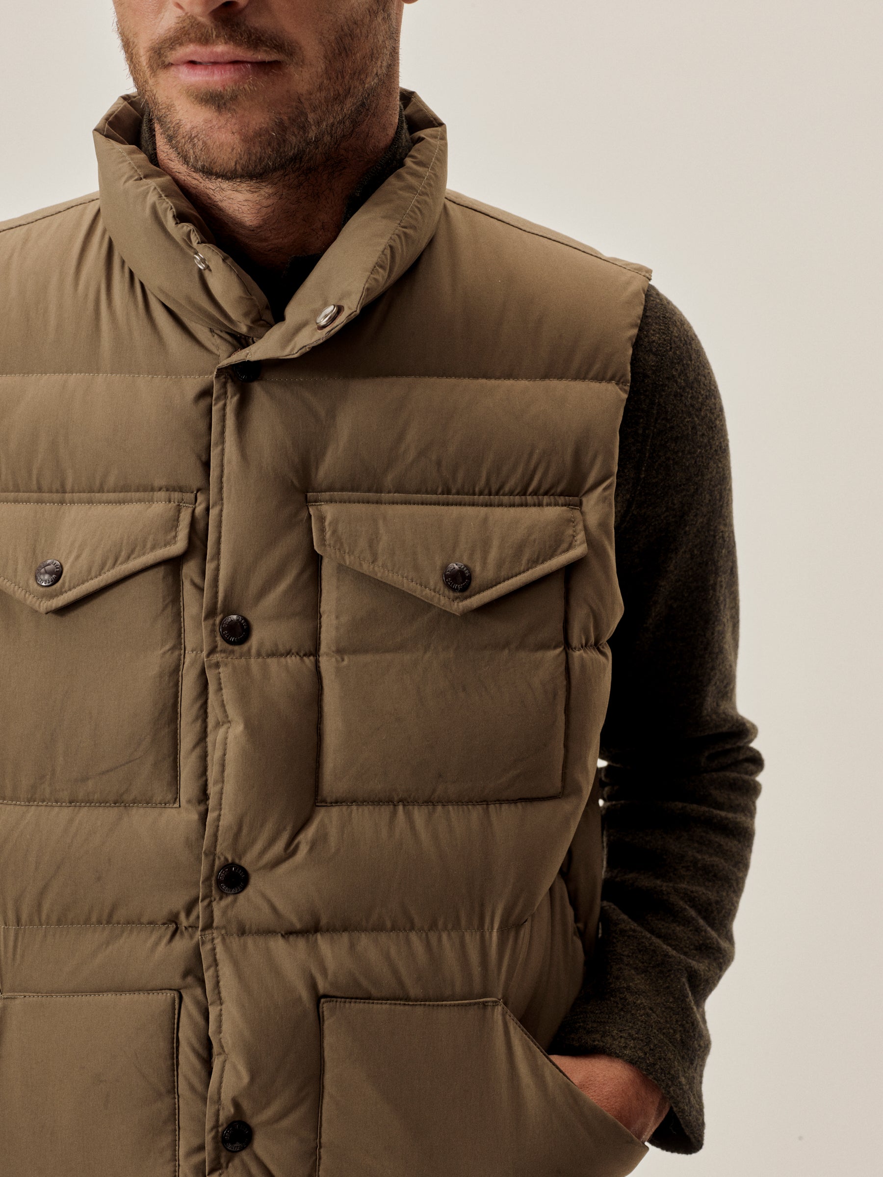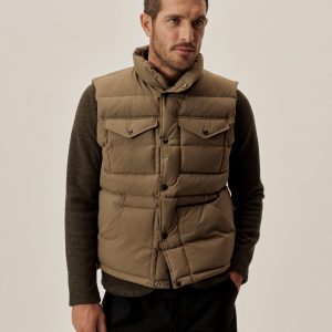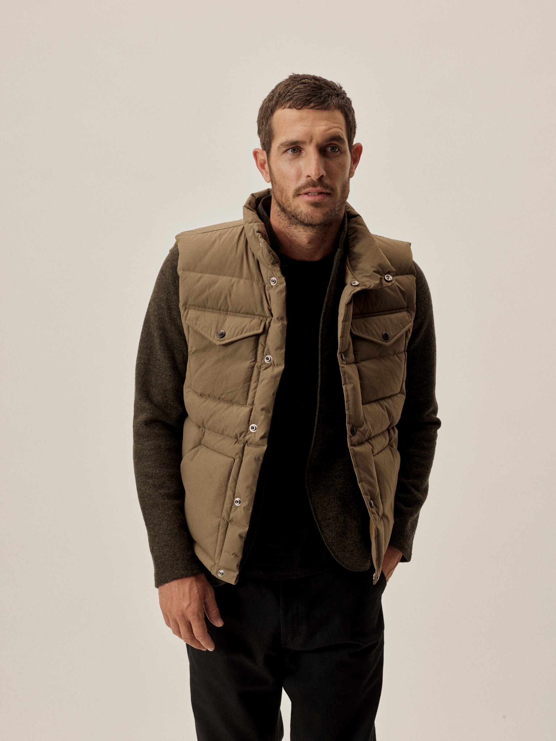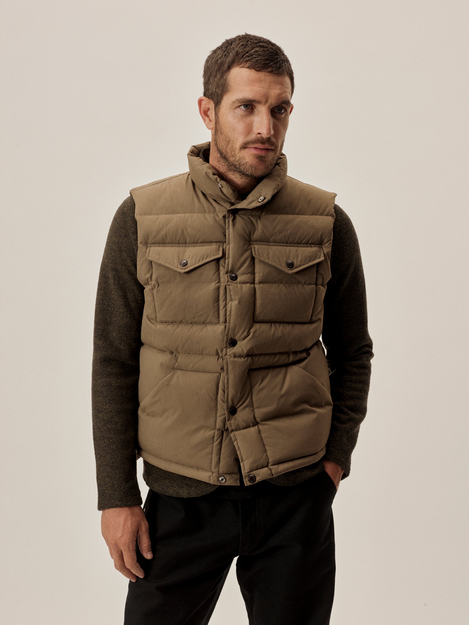 Vintage-inspired down vest cut from a recycked nylon shell with a durable water resistant coating. 650 fill-power traceable duck down. Relaxed through the chest and sleeves, with a slightly slimmer waist. Features quilted channels, hand-warmer pockets lined in cozy fleece, patch and flap chest pockets with snap closure, and a stepped hem.