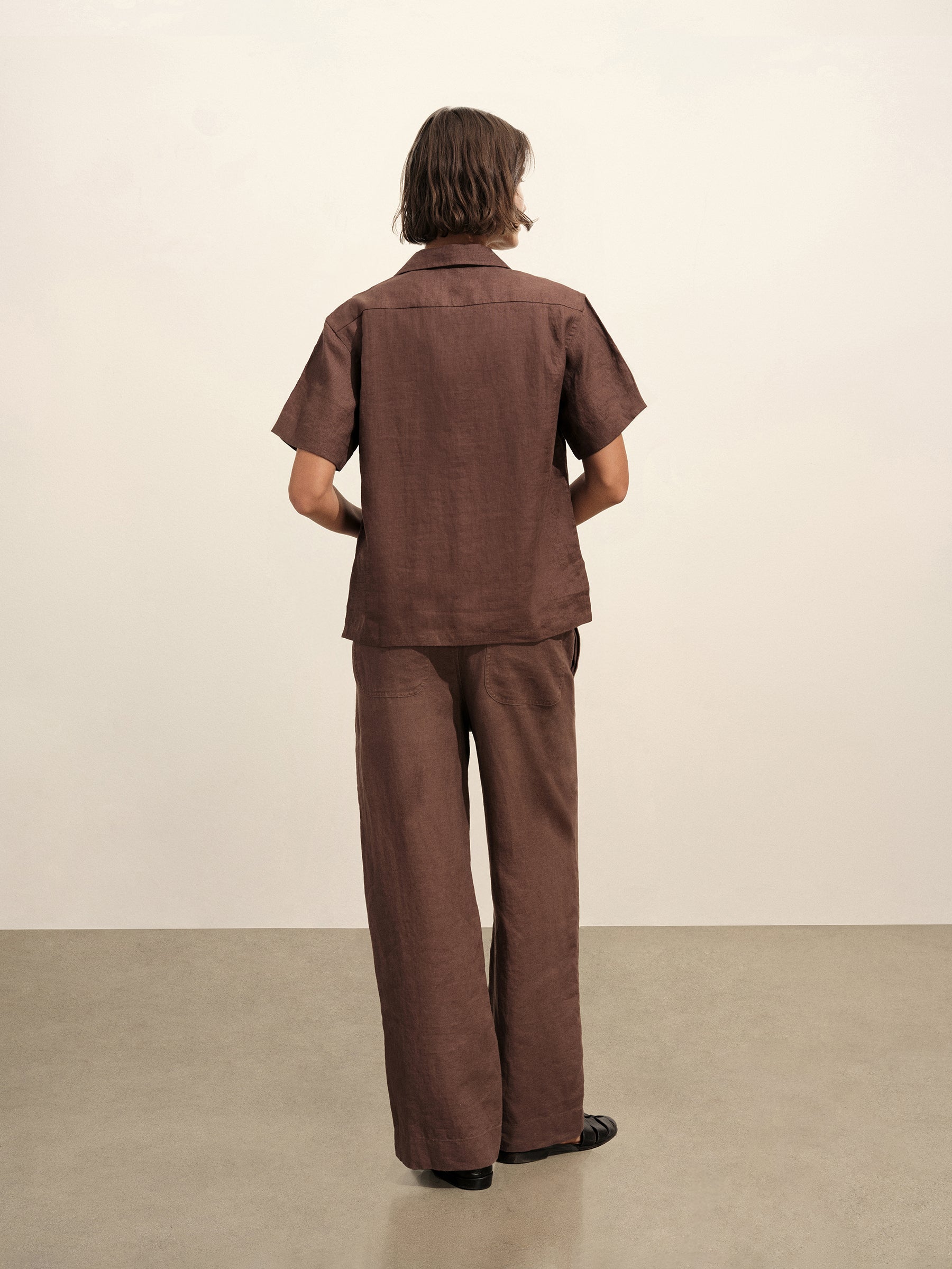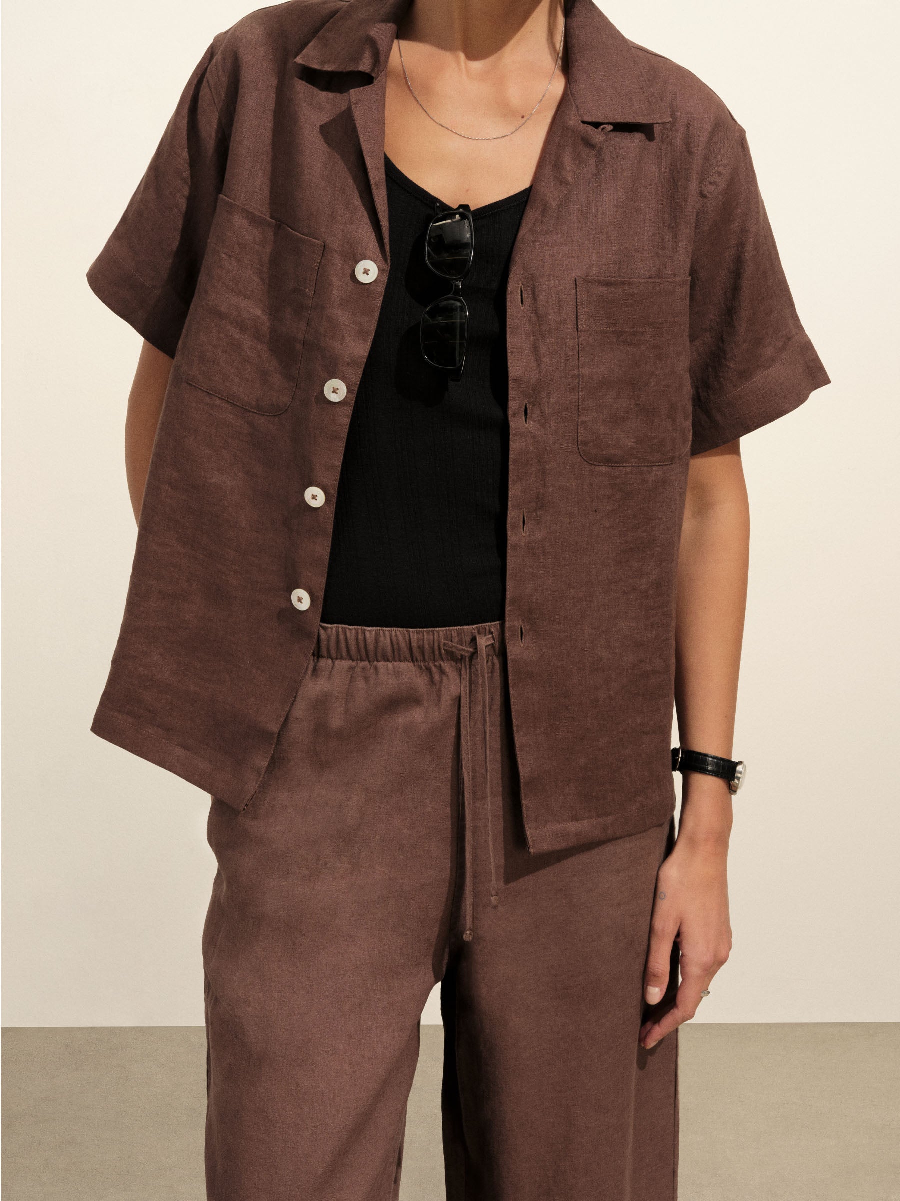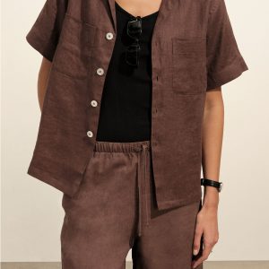 Oversized short-sleeve camp collar shirt with a cropped body, cut from a 100% linen weave. Featuring a low neckline, two front chest pockets, notched vents at sides, and a back yoke to box pleat. Finished with oversized mother of pearl buttons for a luxe, polished summer look. Garment washed for a lived-in look and feel.