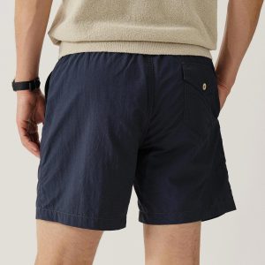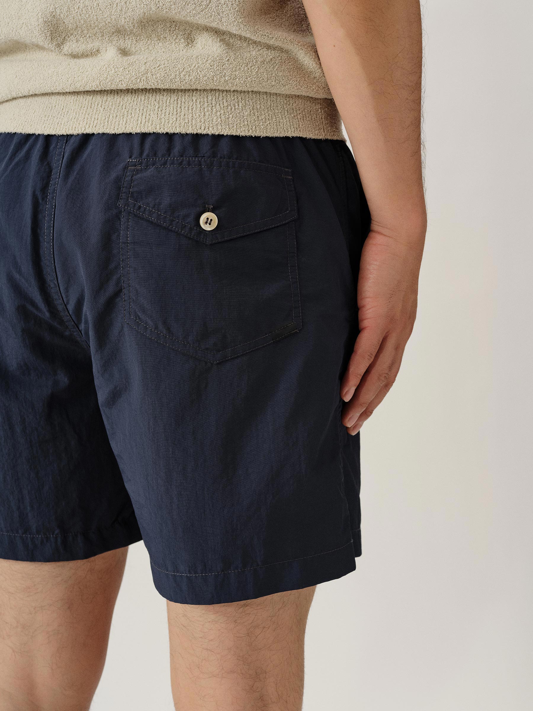 Classic swim shorts are made from lightweight woven nylon using recycled plastic waste found in the ocean. They feature an elastic waistband with an added drawstring for the perfect fit. A small front buttoned pocket and button flapped back pocket help you stow your necessaries in addition to two front slash pockets. 5.5-inch inseam.