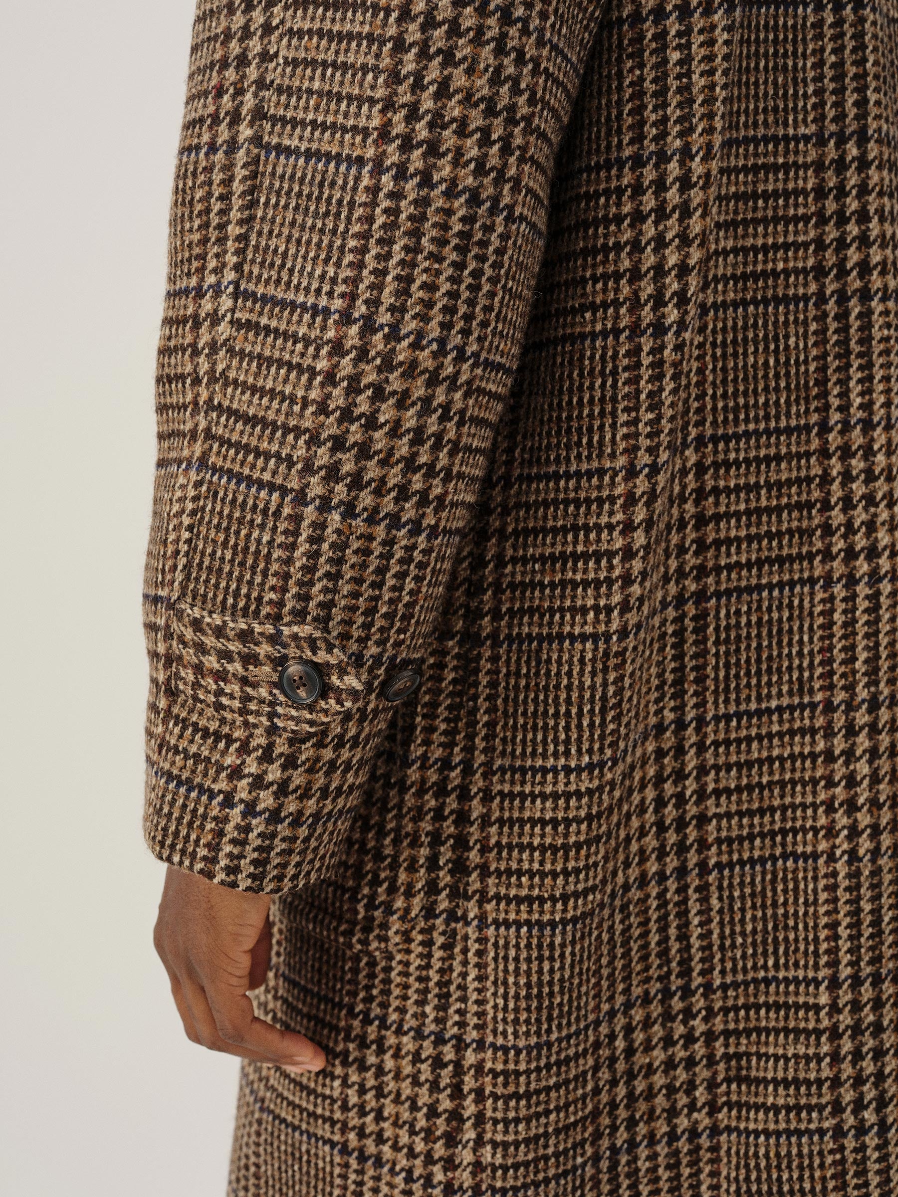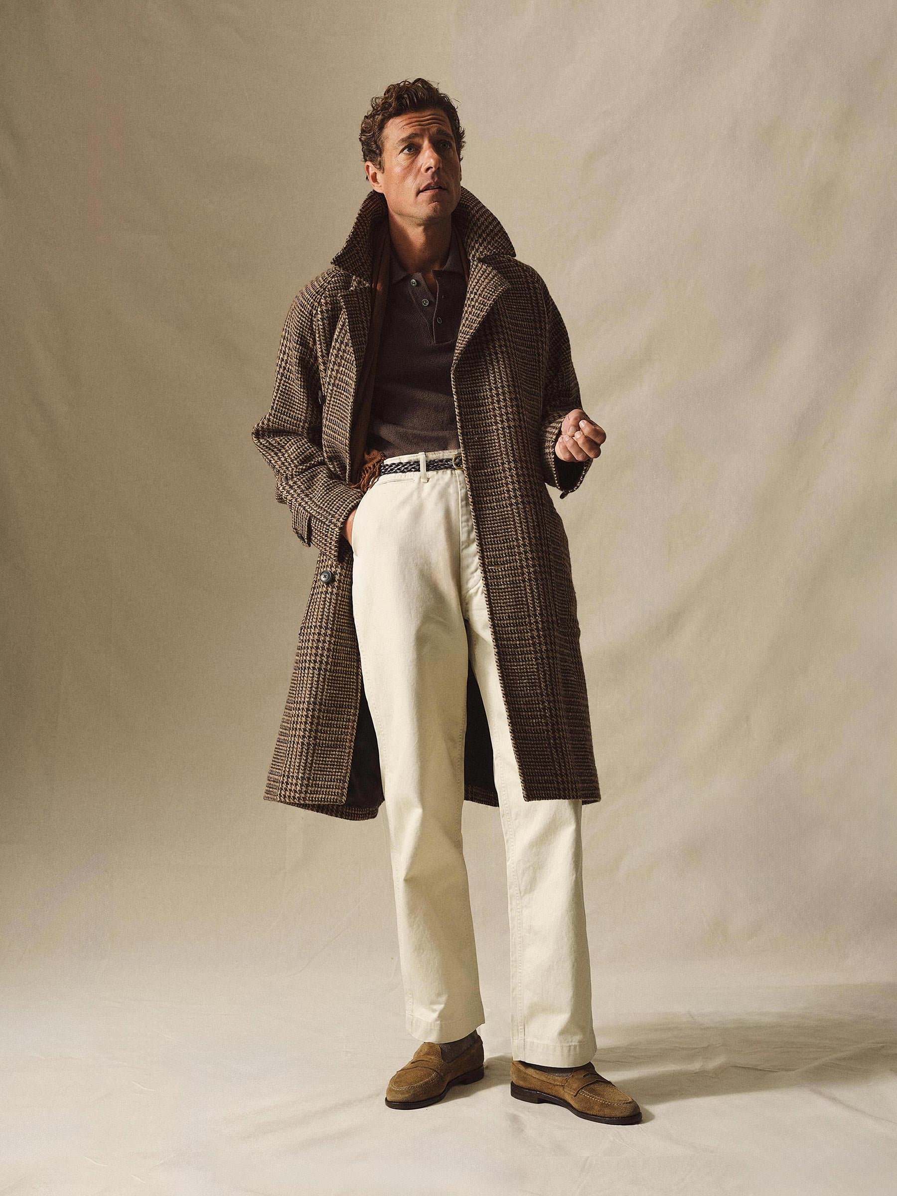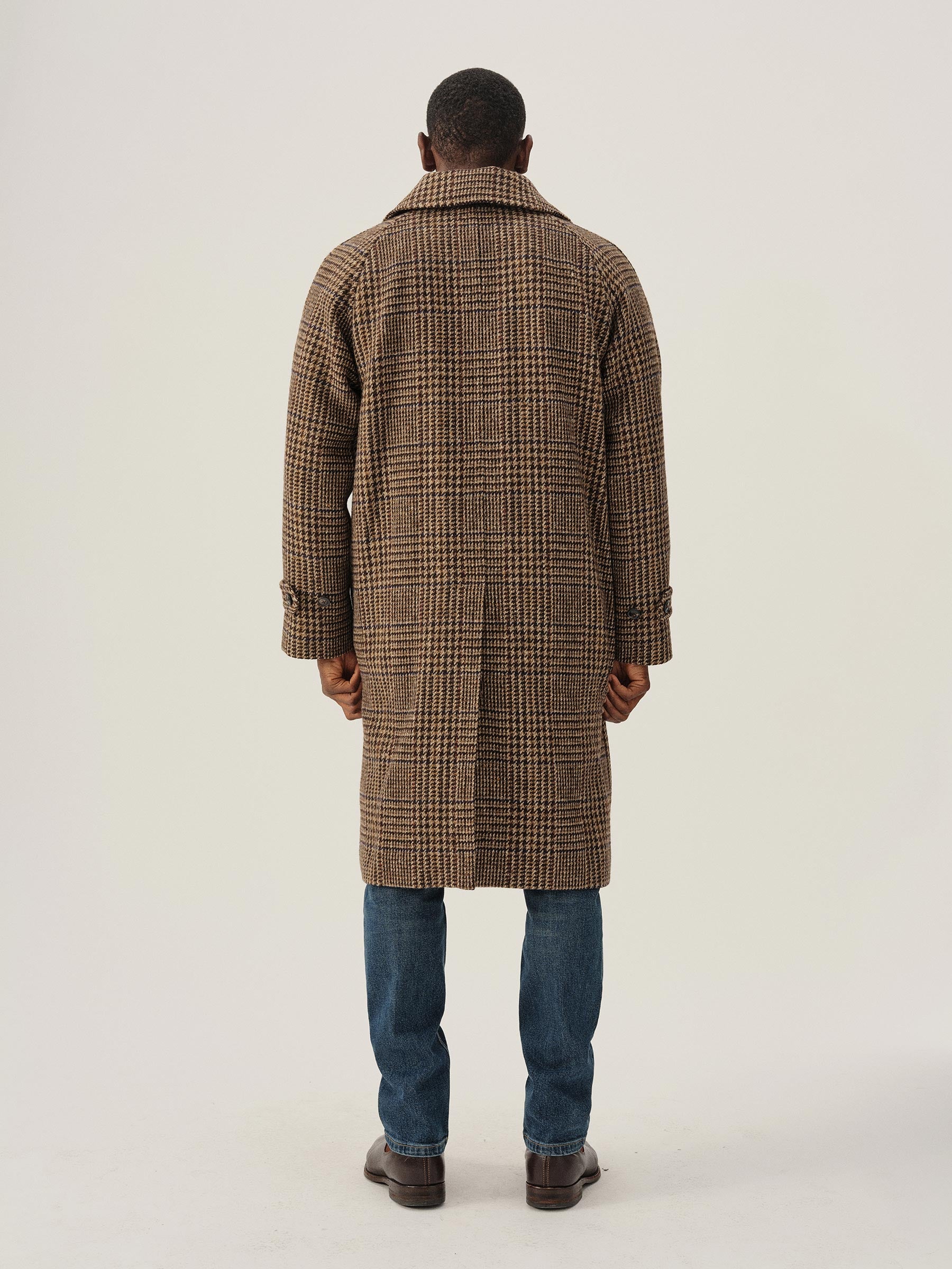 Raglan-sleeved overcoat inspired by WW2 military trench coats with full canvas construction in a classic fit designed for layering and engineered to fit a wide range of body types. This rich textured handwoven Donegal tweed is hearty and resilient, providing substantial warmth while remaining breathable and moisture-wicking. Details include full bemberg lining and genuine horn buttons, two patch-and-flap pockets at hip, two interior welt pockets, a button front closure, a button-through center back vent and buttoned sleeve tabs.