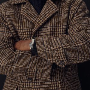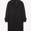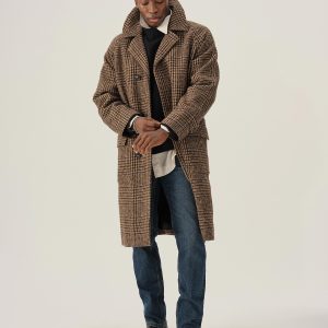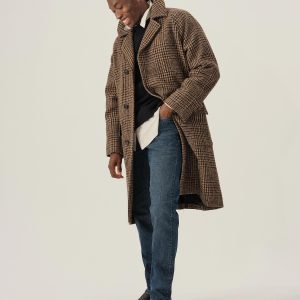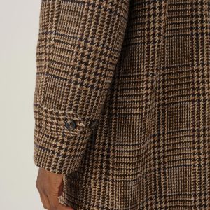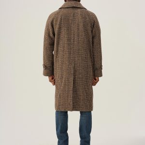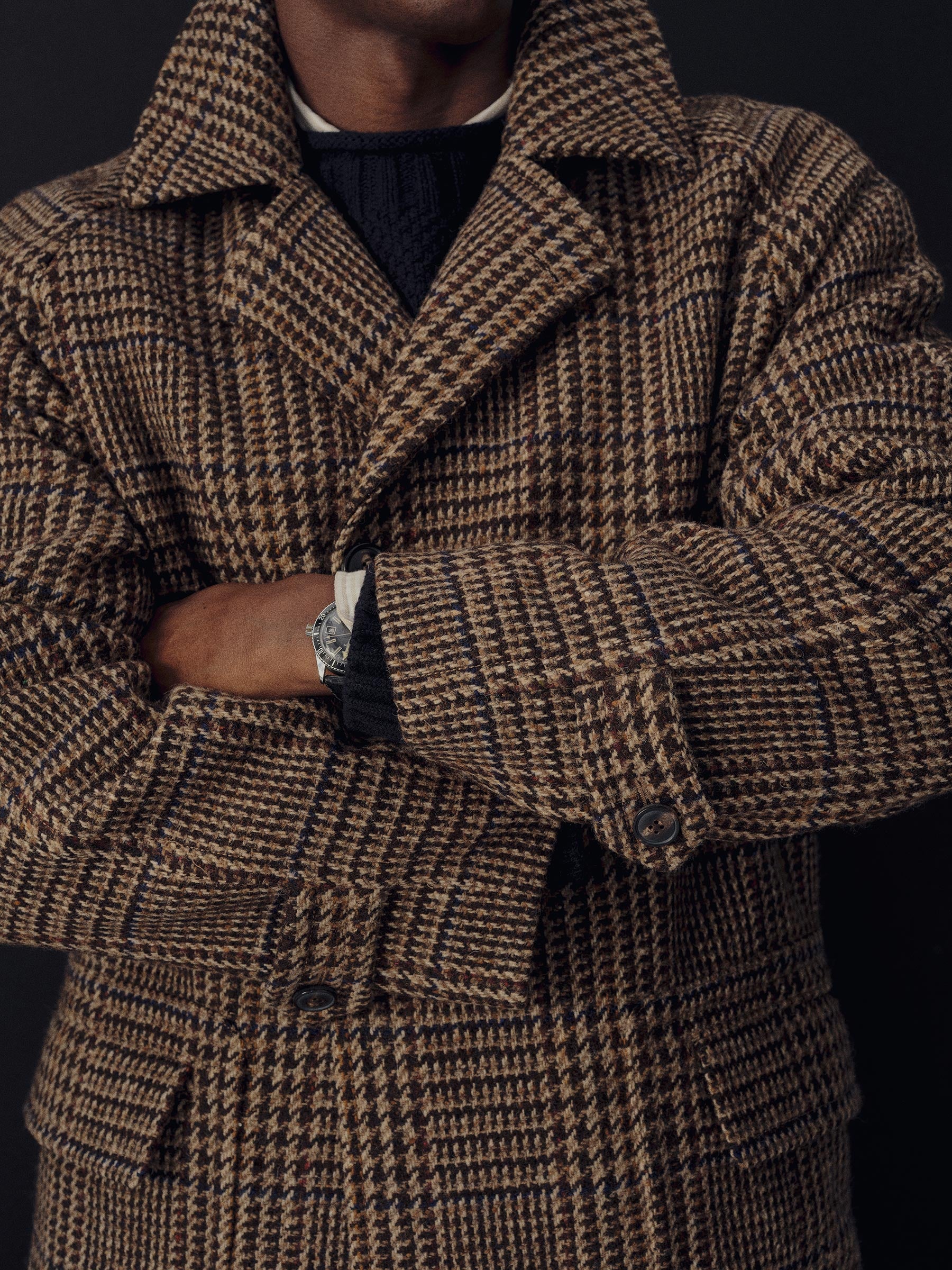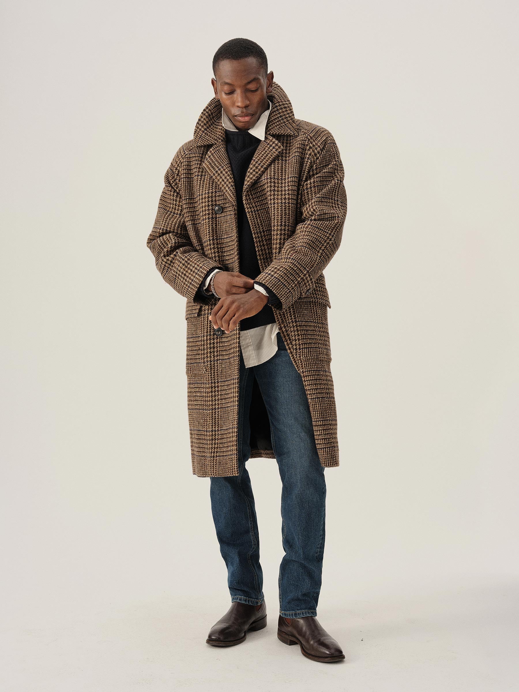 Raglan-sleeved overcoat inspired by WW2 military trench coats with full canvas construction in a classic fit designed for layering and engineered to fit a wide range of body types. This rich textured handwoven Donegal tweed is hearty and resilient, providing substantial warmth while remaining breathable and moisture-wicking. Details include full bemberg lining and genuine horn buttons, two patch-and-flap pockets at hip, two interior welt pockets, a button front closure, a button-through center back vent and buttoned sleeve tabs.