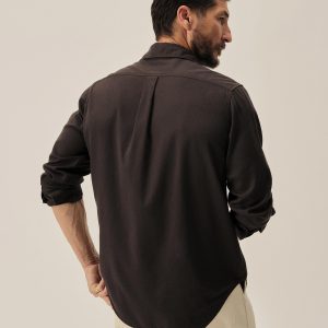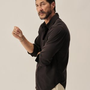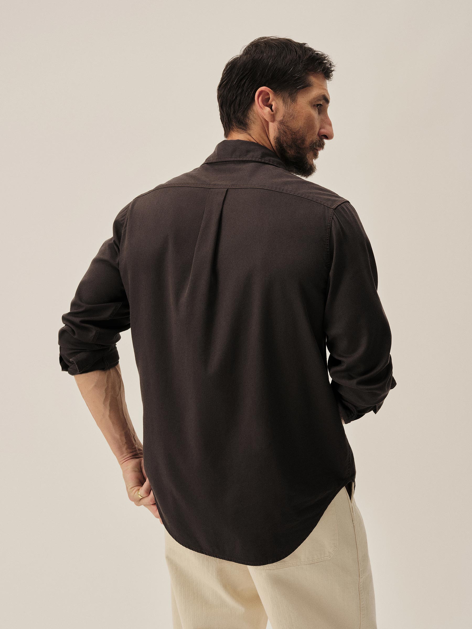 Slim fit long sleeve button up shirt in 5.25 oz. cotton/rayon twill with a subtle luster and an easy drape. Details include mother of pearl buttons, a single spade pocket at the chest, and a box pleat at the back yoke. Constructed with single needle topstitch detailing with double needle stitching at the collar and cuffs. Garment washed with softener for a lived-in feel.