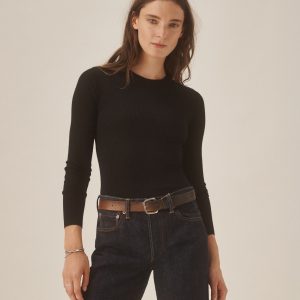 Slim fit crewneck sweater in a 24″” length, elevated in a 14 gauge variegated rib knit from a blend of merino wool, silk, and cashmere. Luxe, easy, and ideal for layering. Constructed with self-starting hem and sleeve trim and fashioning at the neckline and back shoulder for durability.