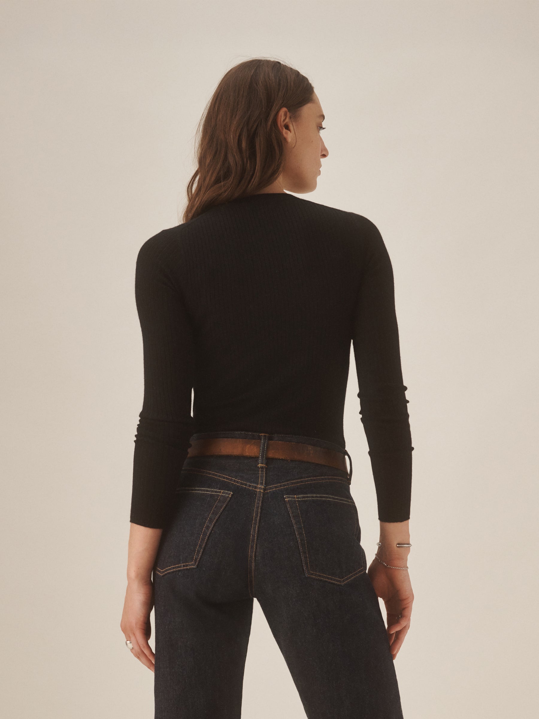 Slim fit crewneck sweater in a 24″” length, elevated in a 14 gauge variegated rib knit from a blend of merino wool, silk, and cashmere. Luxe, easy, and ideal for layering. Constructed with self-starting hem and sleeve trim and fashioning at the neckline and back shoulder for durability.