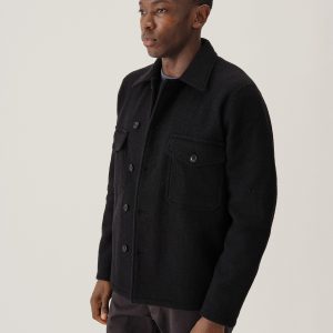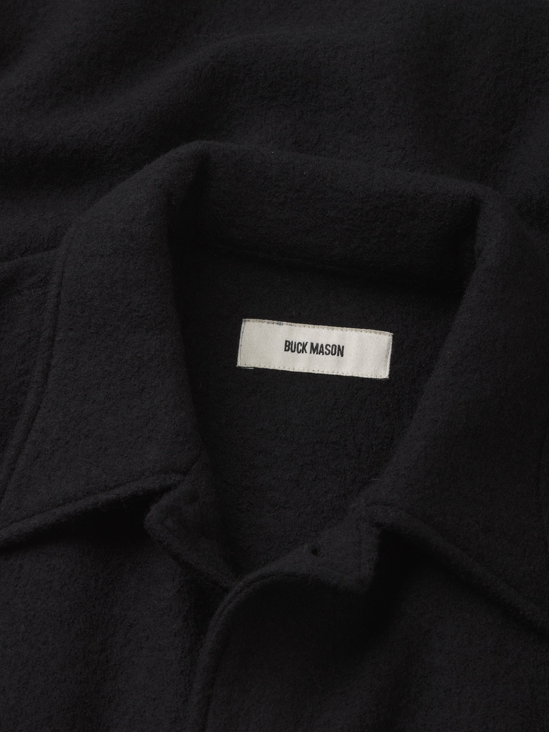 Classic fit field shirt in 340 GSM felted merino wool, twice boiled for improved insulation and durability. Details include patch-and-flap chest pockets and a button front closure. Constructed with hand-sewn facings and cover-stitching with flat seams for comfort.