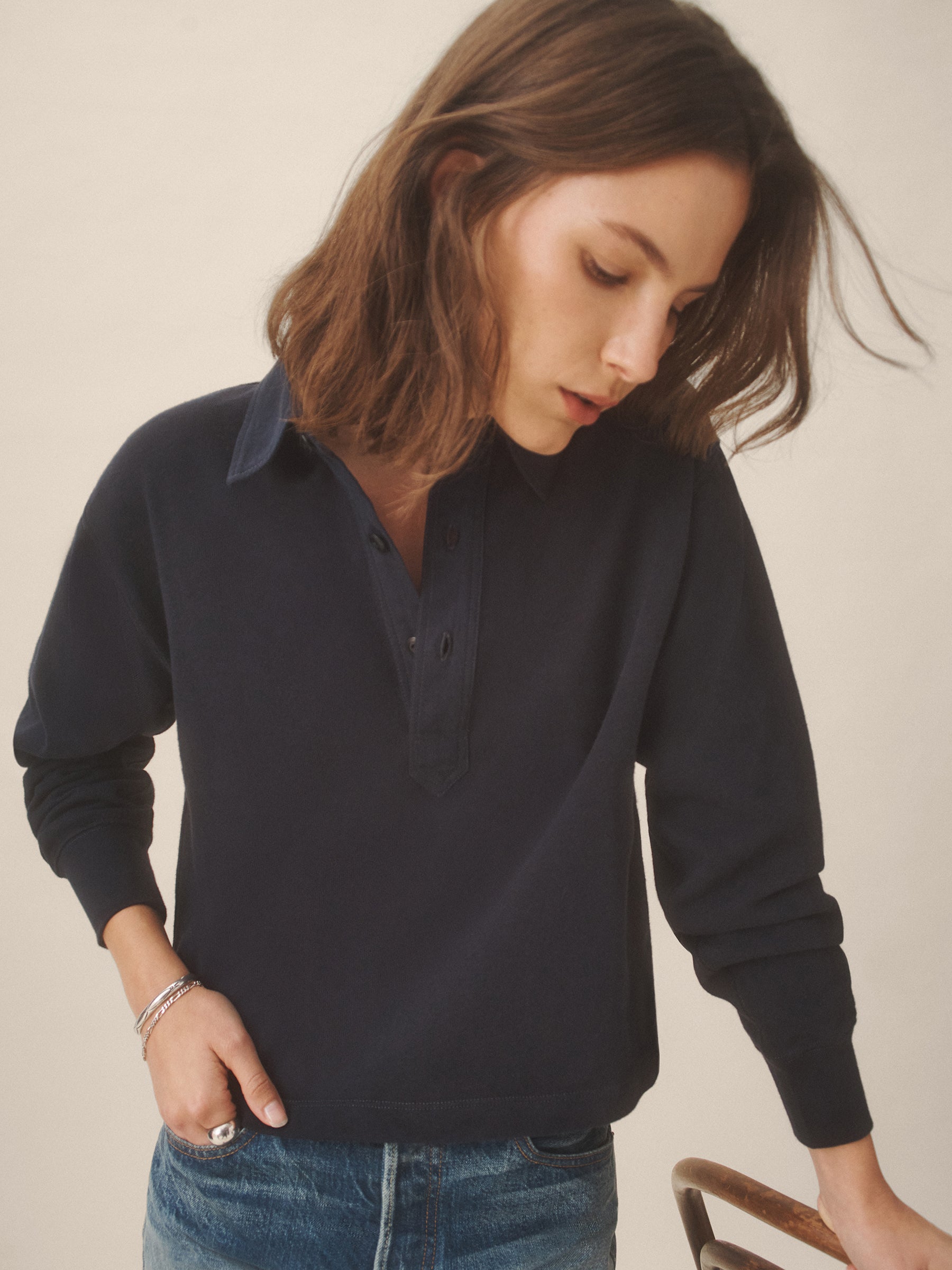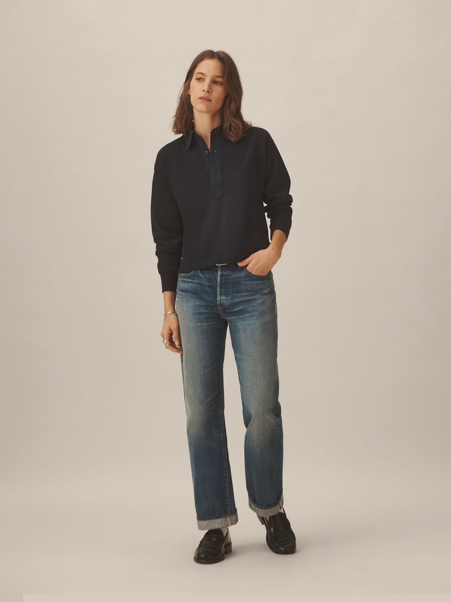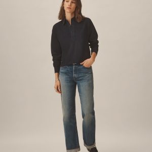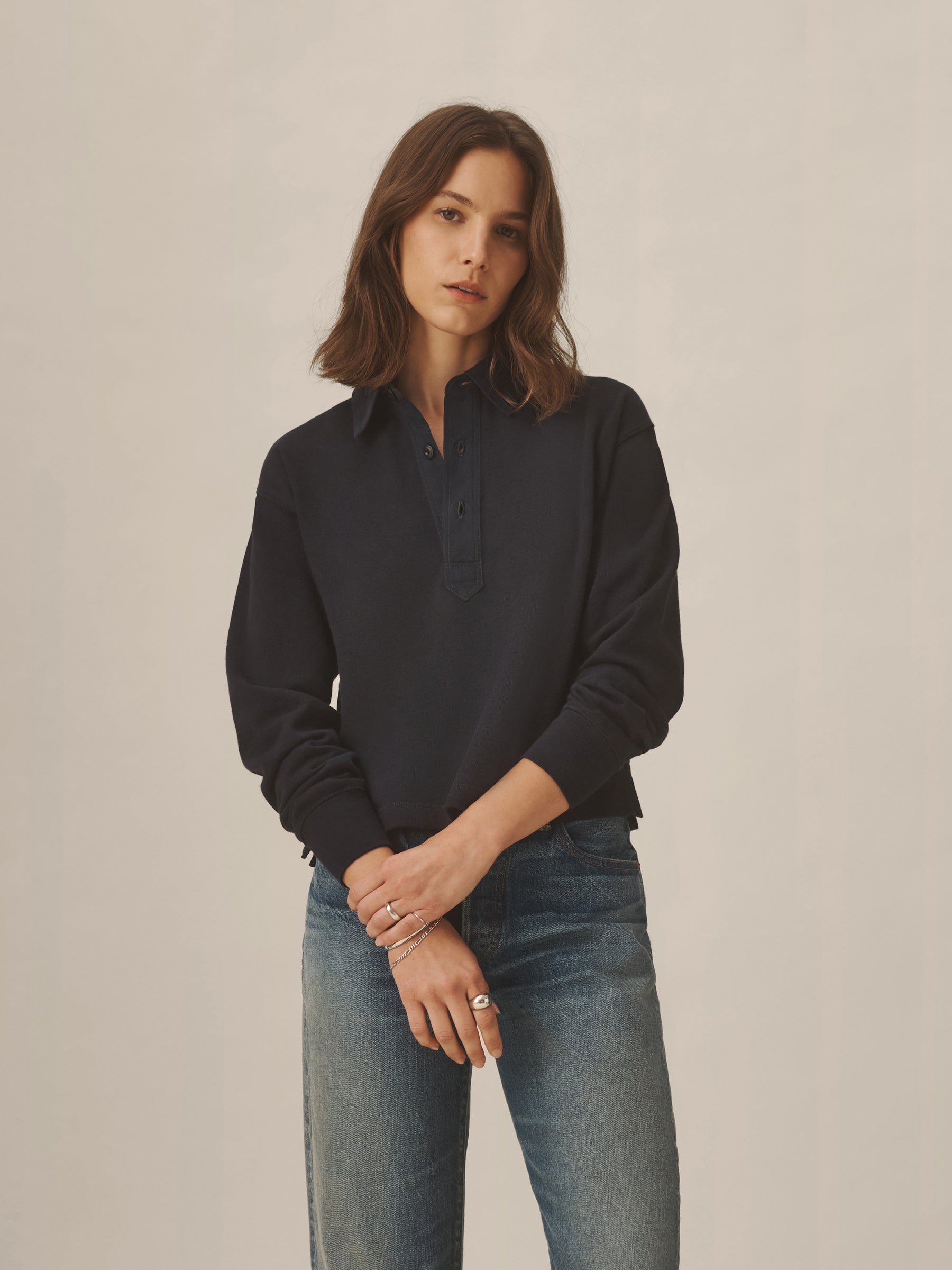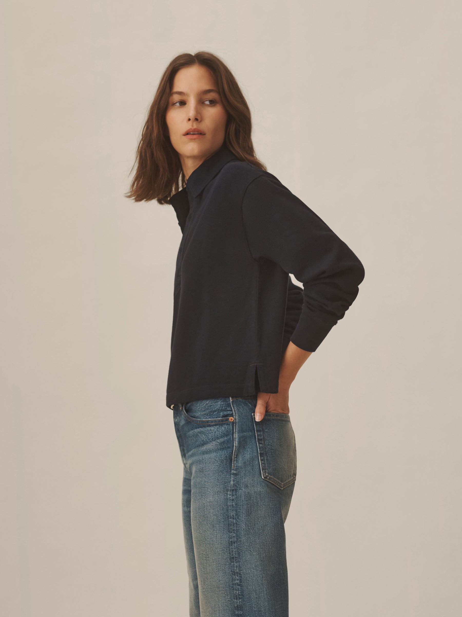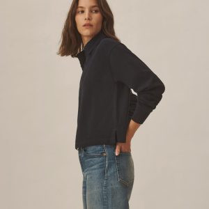 Inspired by the men’s Field-Spec Rugby, the women’s version is cut from 100% cotton in a dense slub jersey with a structured hand. Cut with a cropped, boxy fit and long sleeves, it’s designed with a woven twill collar and placket, tonal poly buttons at the center front, and herringbone-trimmed side slits.