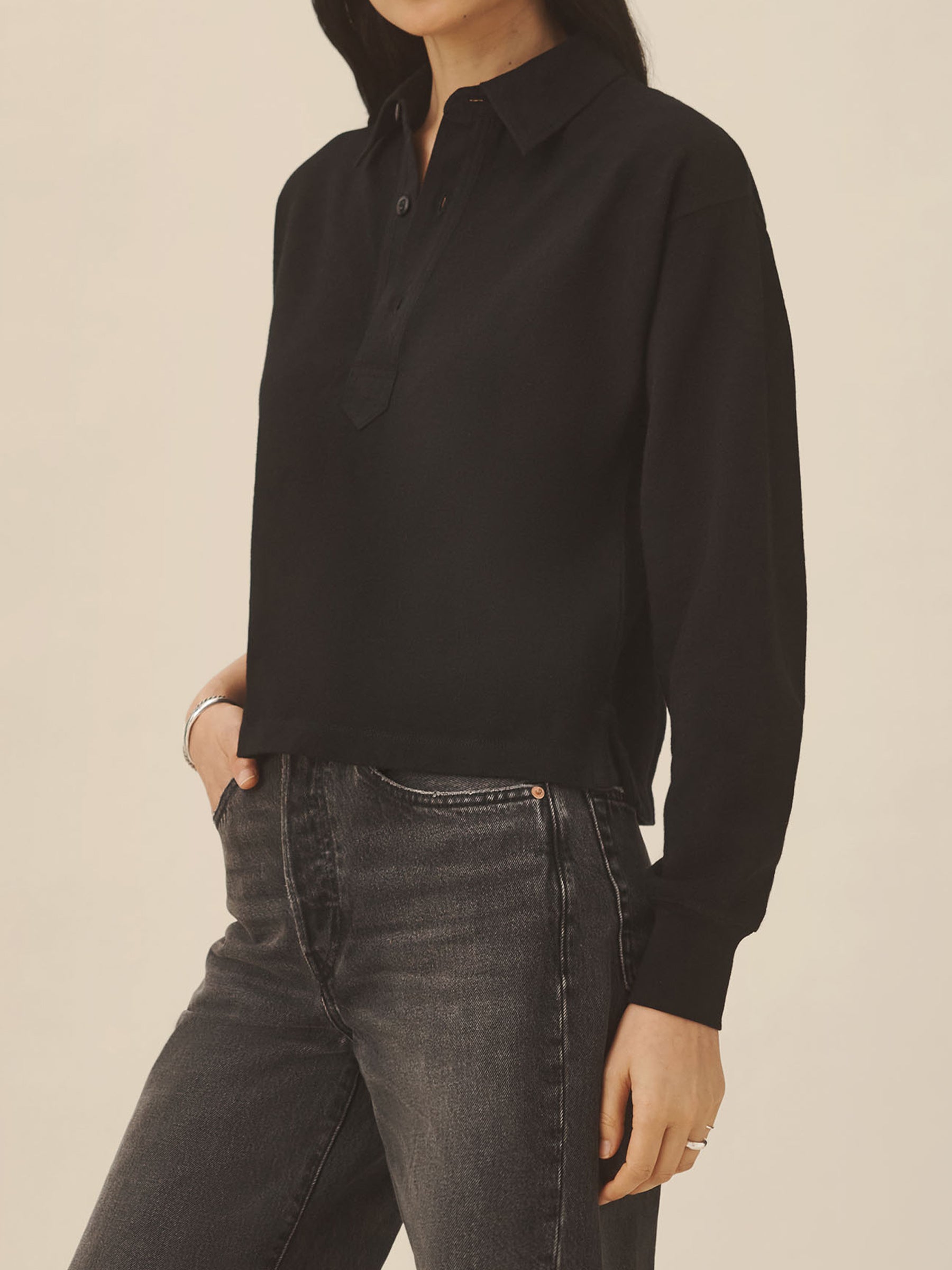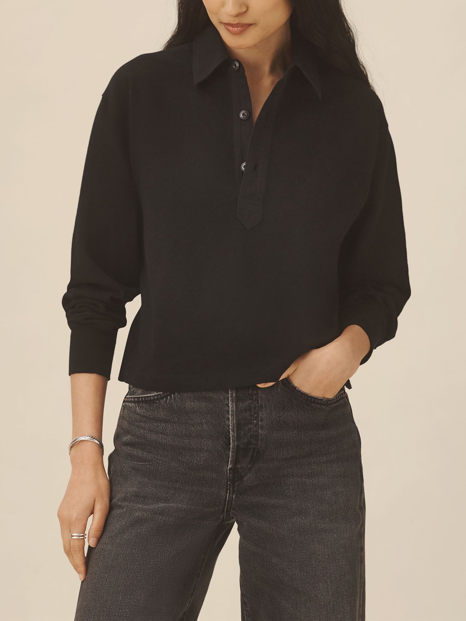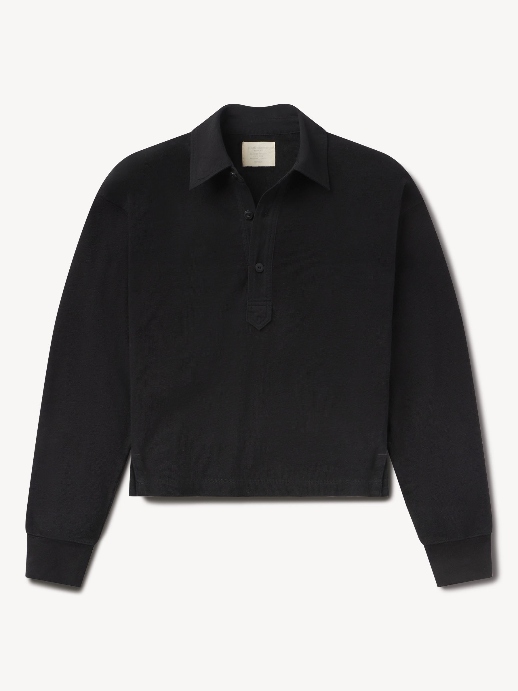 Inspired by the men’s Field-Spec Rugby, the women’s version is cut from 100% cotton in a dense slub jersey with a structured hand. Cut with a cropped, boxy fit and long sleeves, it’s designed with a woven twill collar and placket, tonal poly buttons at the center front, and herringbone-trimmed side slits.