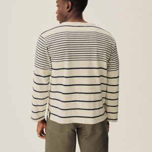 Nautical-inspired boxy fit short sleeve wide neck tee with a straight hem, longer sleeve length, drop shoulder, high neck, and wide ribbed collar. The soft cotton jersey, yarn-dyed in indigo and black sulfur stripe pattern, is about twice as heavy as our Pima tees, with tiny vertical ribs that gently glide across the skin. This is a solid, substantial stand-alone tee for cold weather that will pick up a ton of character over time.