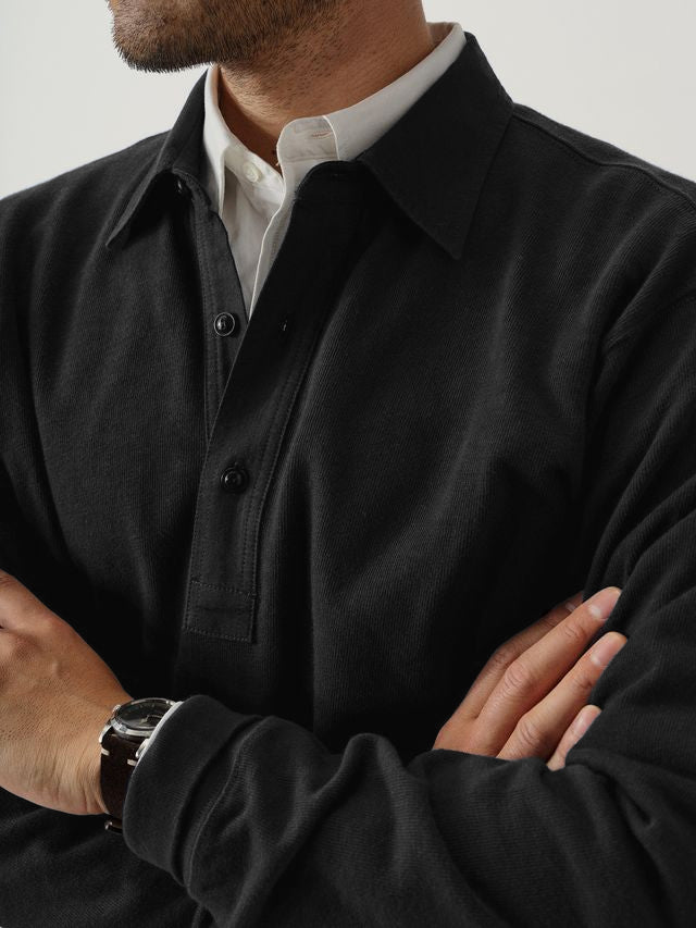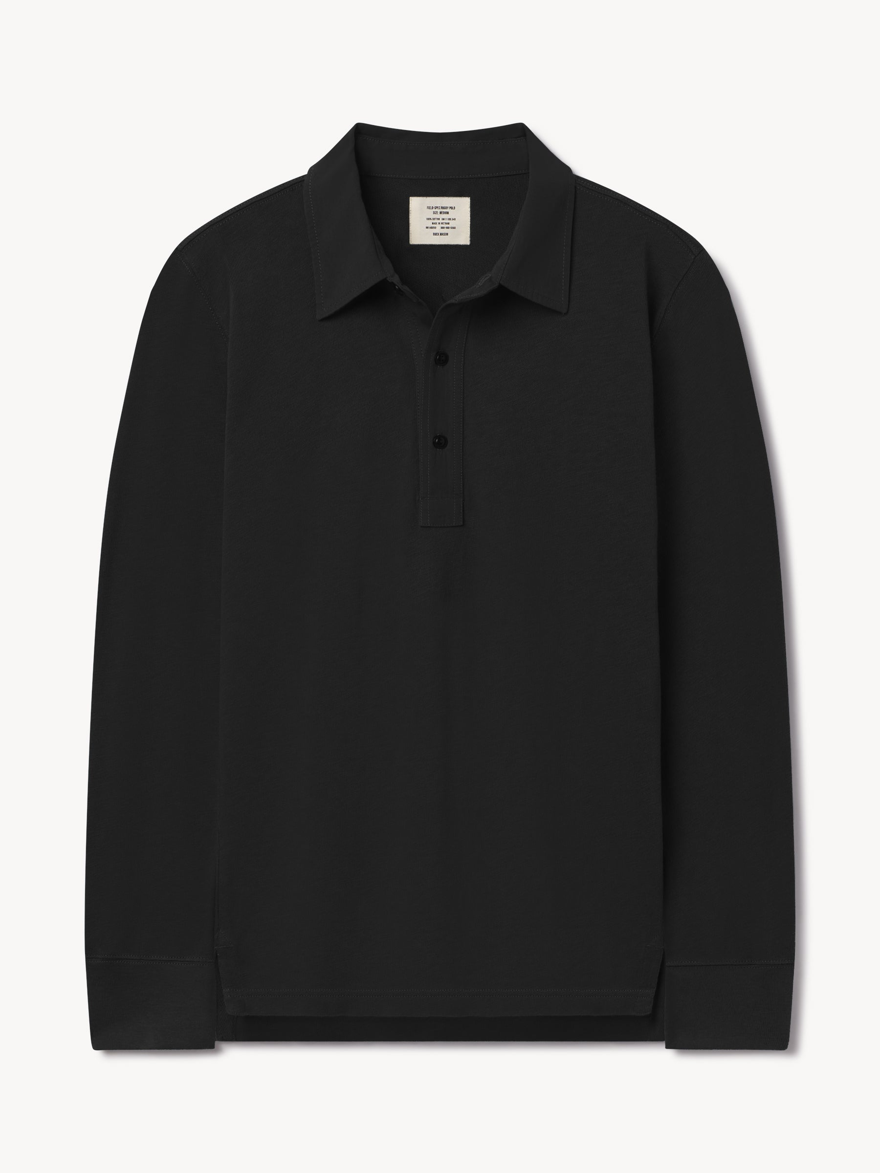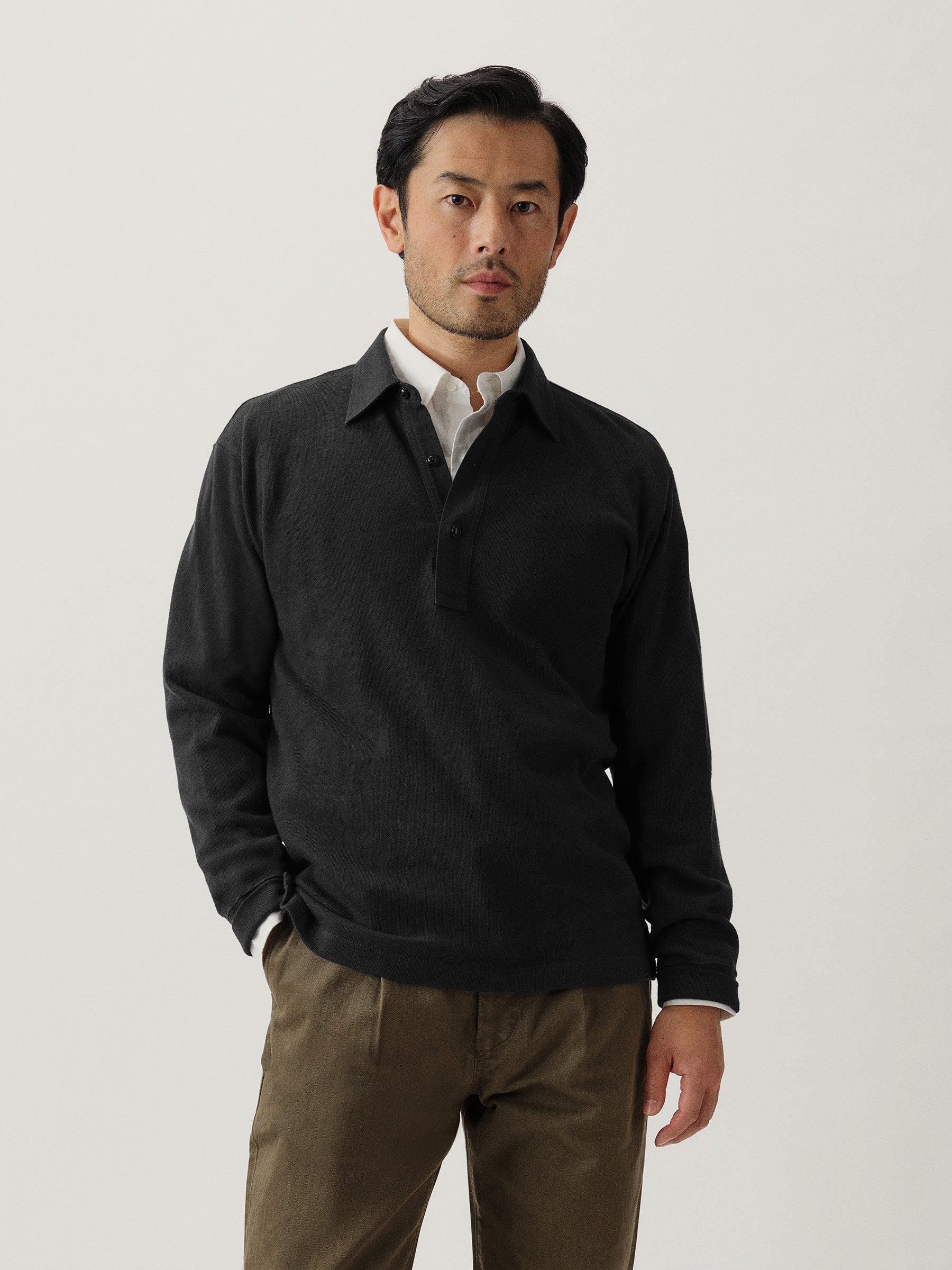 Classic fit long sleeve polo cut from yarn-dyed 310 GSM cotton jersey with the weight and durability of vintage rugby cloth. Details include a stepped hem with side seam vents, a three-button placket with shell buttons, and ribbing at the cuffs. Garment washed for a lived-in feel.