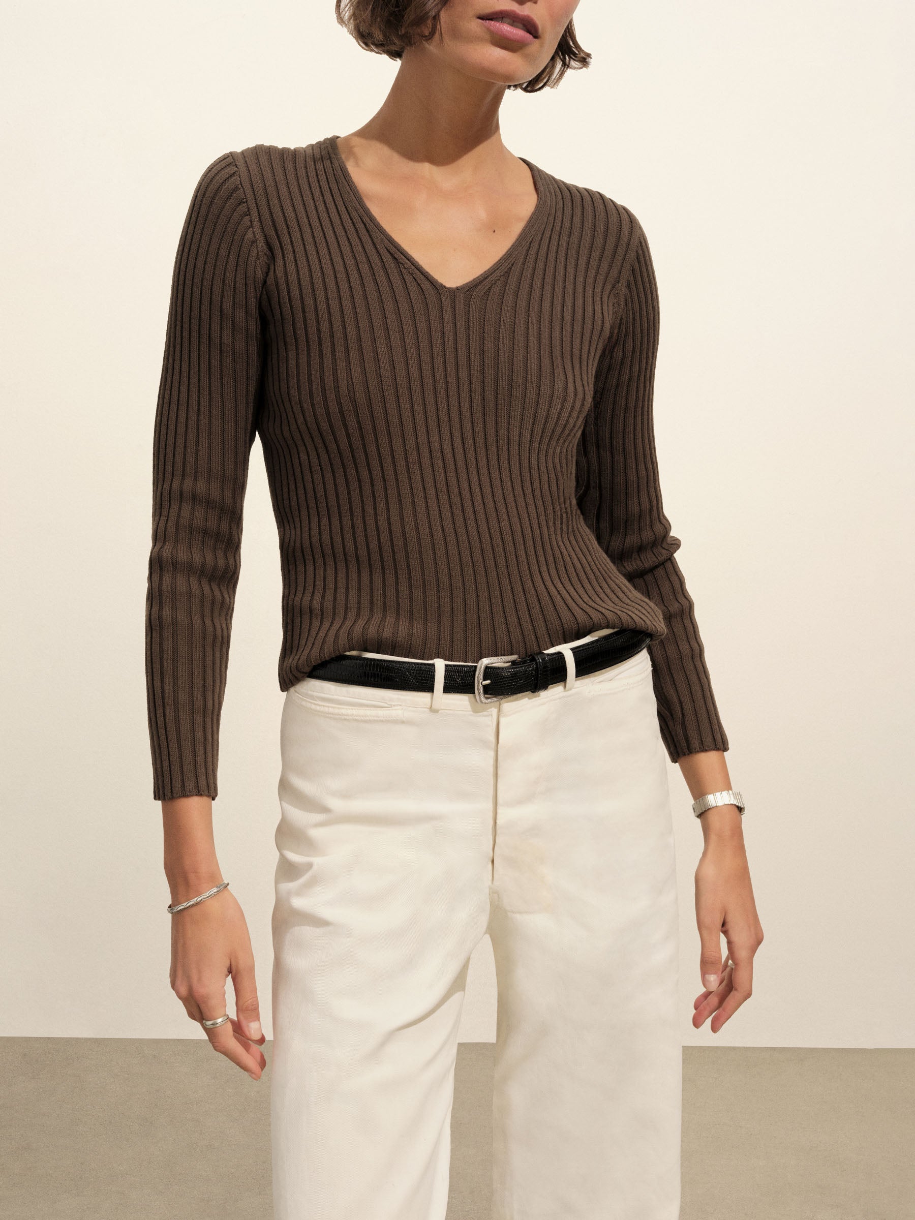 A vintage-inspired V-neck sweater with bracelet-length sleeves, crafted from premium Italian cotton yarn with a 3×3 ribbed structure for added stretch and a snug, flattering fit. Garment-washed for a truly authentic, worn-in feel.