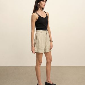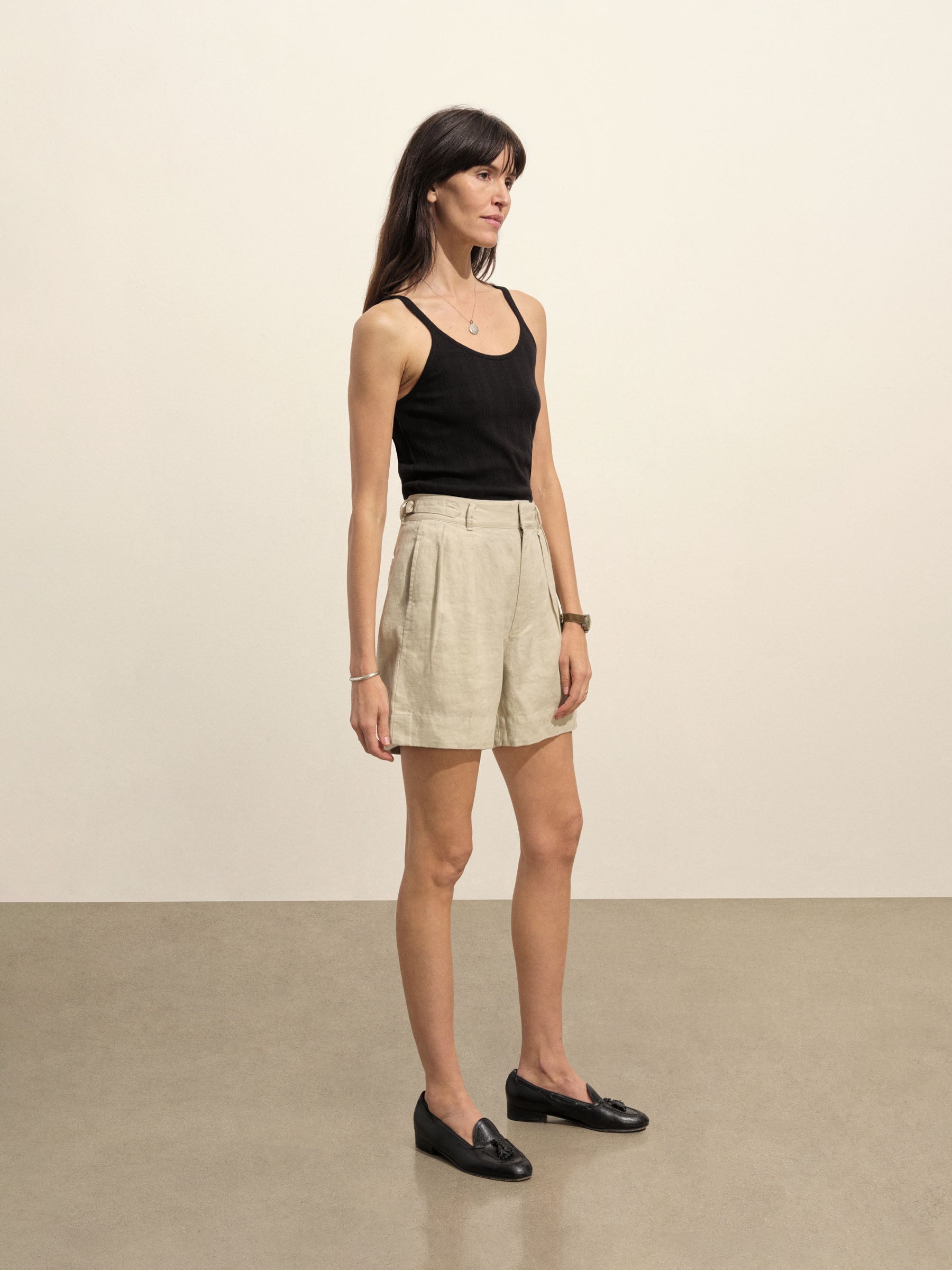 Slim-fit, vintage-inspired base tank made from a textured blend of 60% recycled cotton and 40% cotton. Features a scalloped scoop neckline, contrast rib binding, and discreet baby snaps at the shoulders to keep bra straps in place.