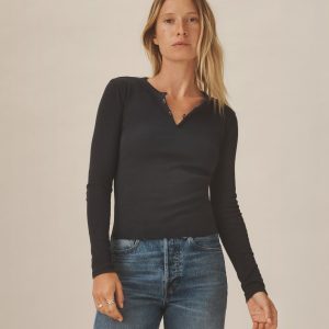 “Slim fit long sleeve henley cut from extra fine 170 GSM cotton with recycled content that holds its shape. Details include a a three-button loop placket with corozo fish eye buttons, and straight, clean finished hem and cuffs. Garment washed for a lived-in feel.