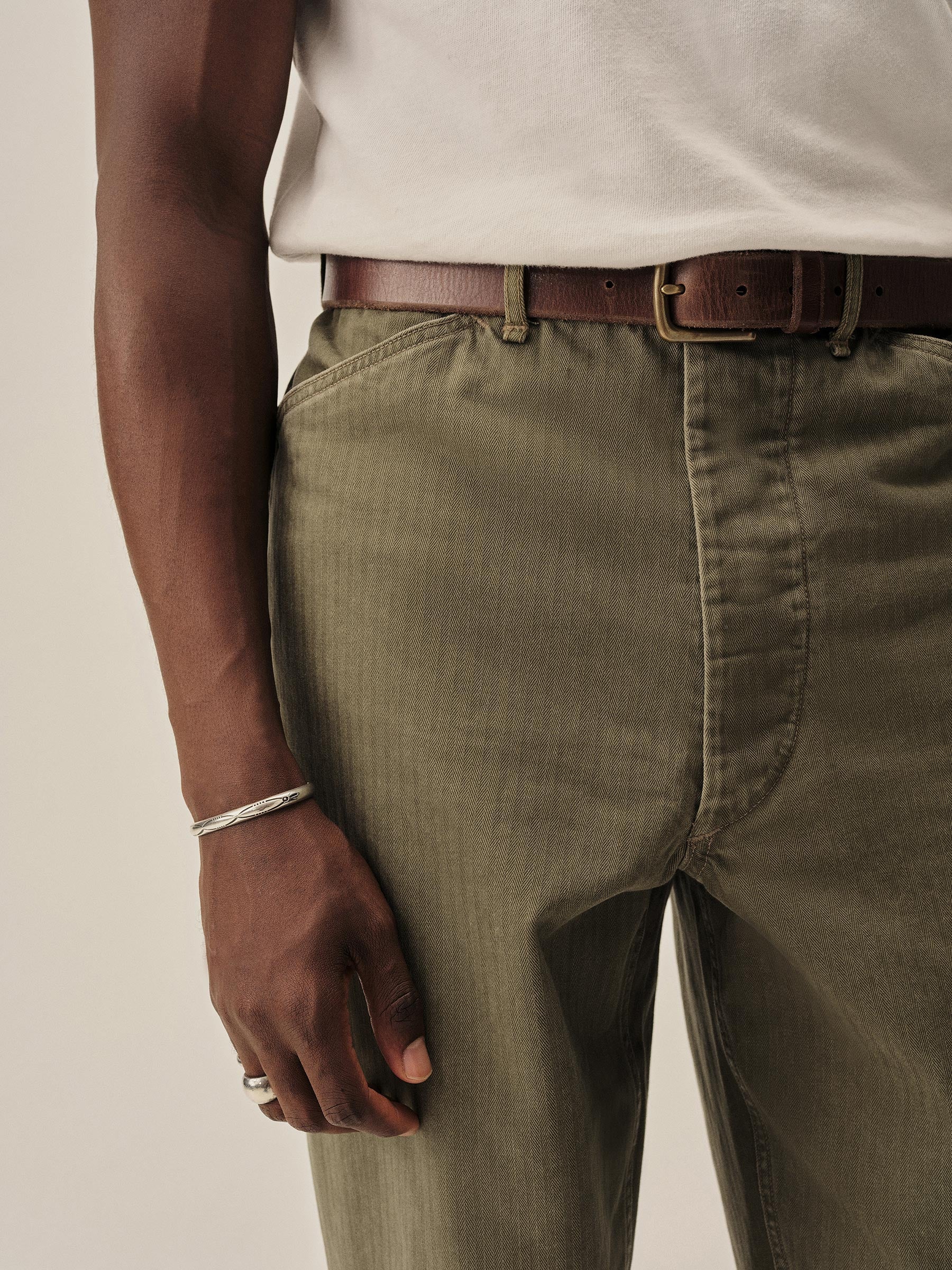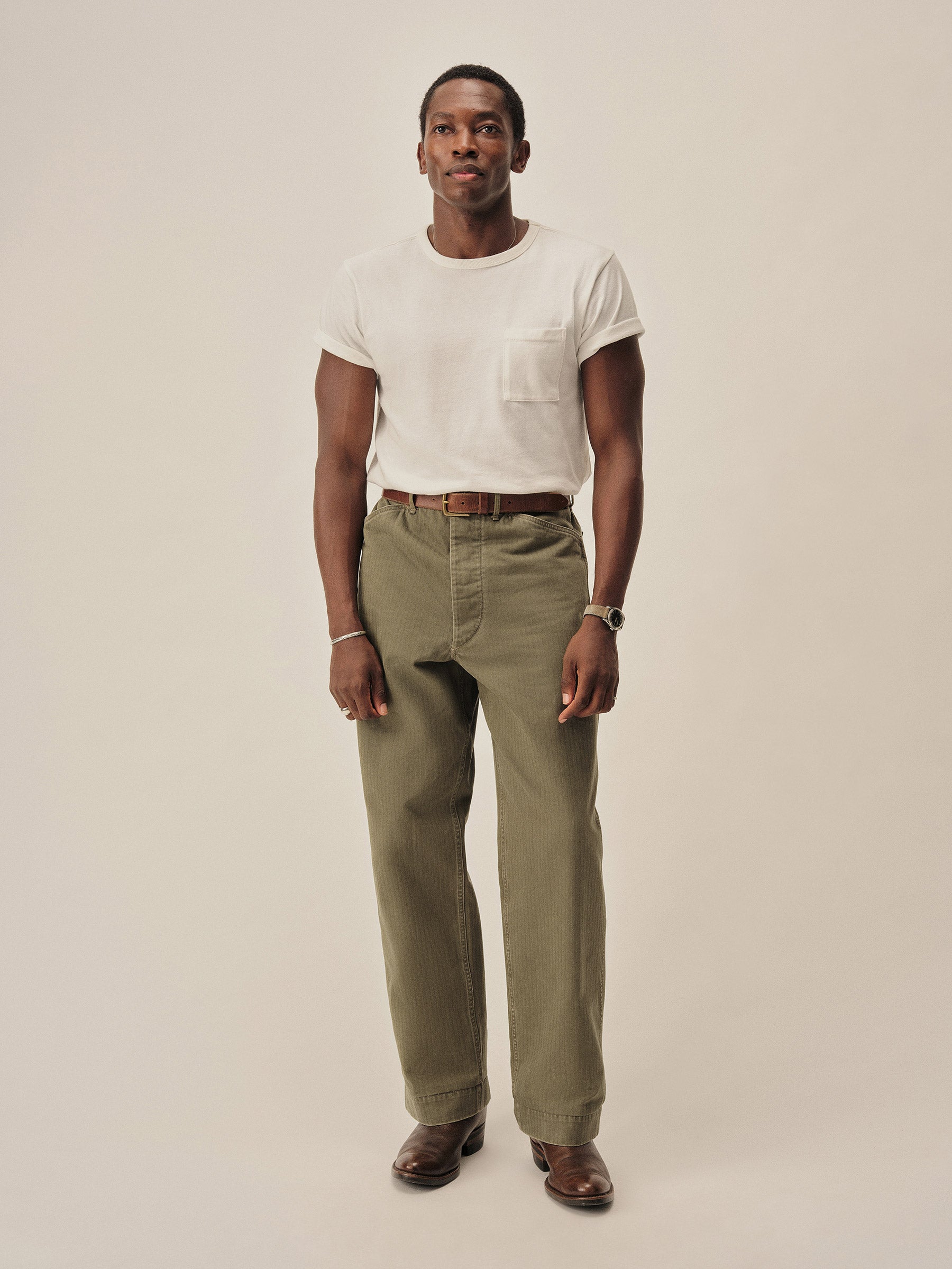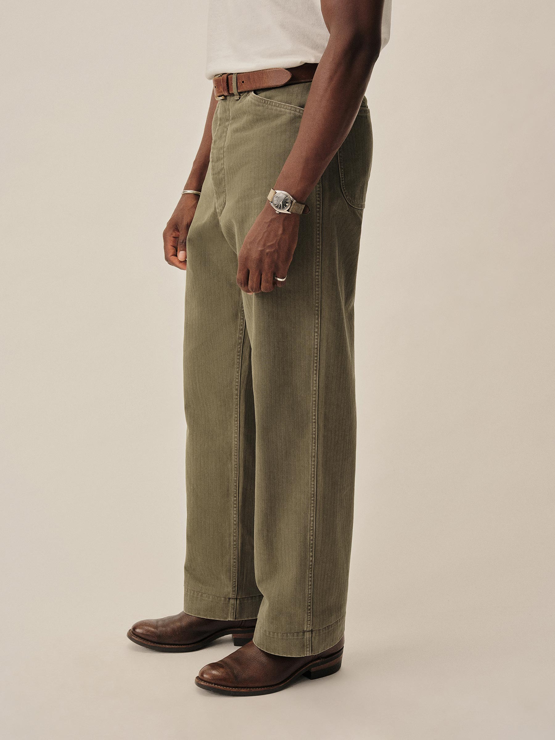 Our Herringbone Twill Field Pant pays tribute to the USMC work trouser turned WWII combat uniform, the P-41. “Repro” style fit with a high rise and full leg, cut from lightweight, 100% cotton HBT. Construction details include felled seams, 2 open back patch pockets, and bar tacks at points of stress. Stonewashed for a broken-in, vintage feel.