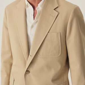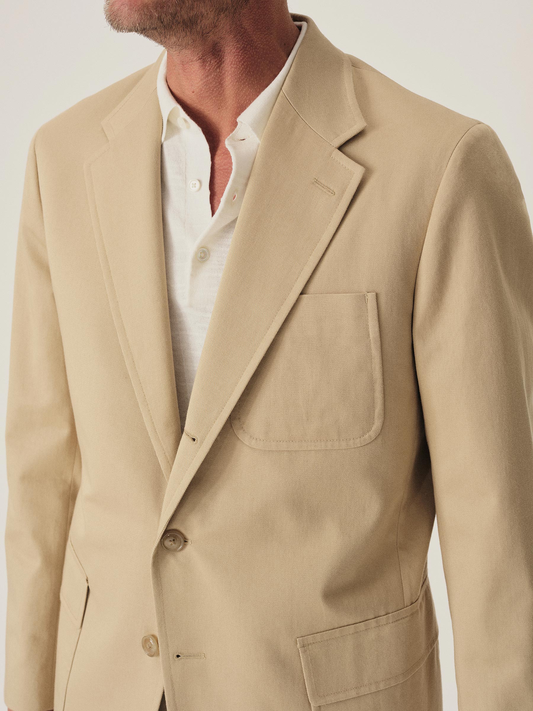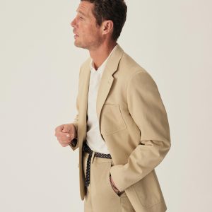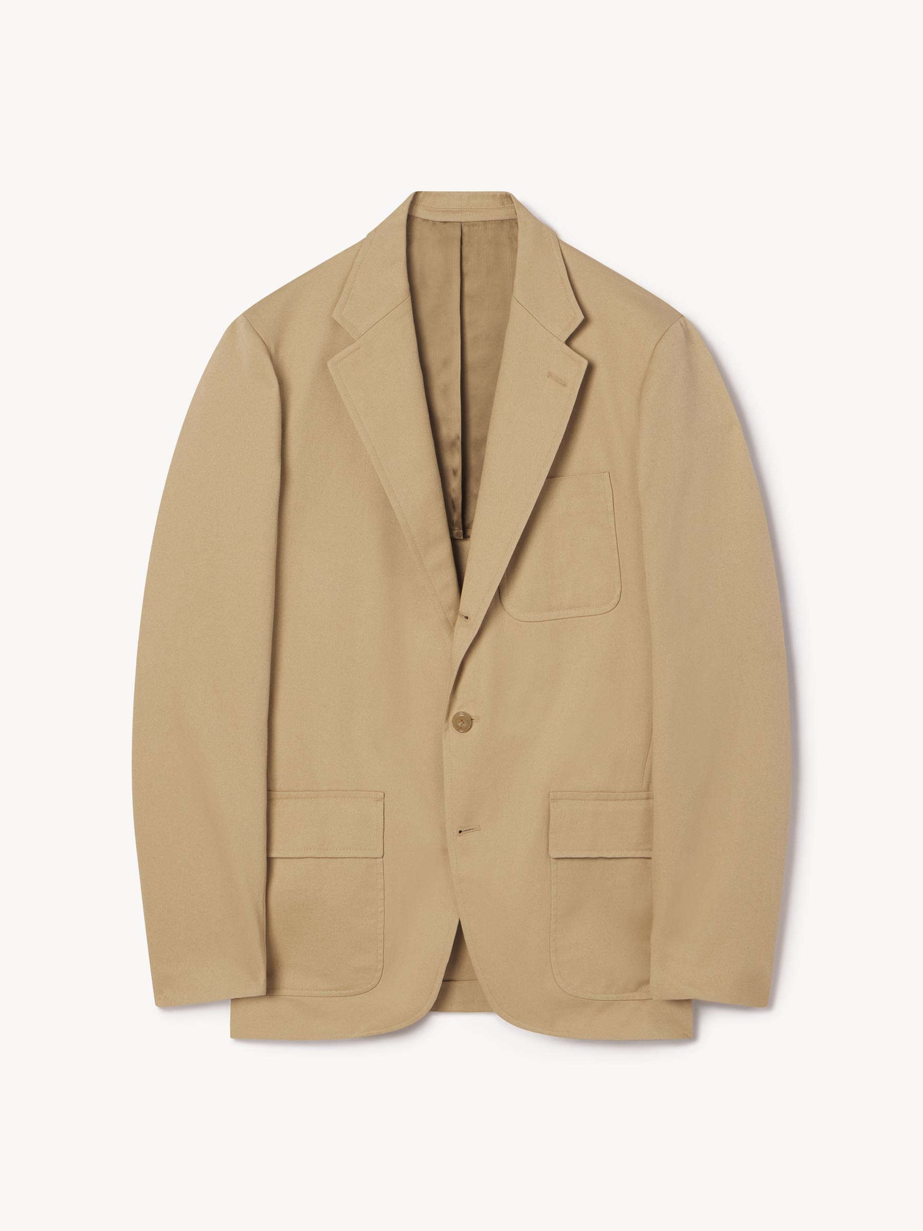 Tailored 3-roll-2 button blazer, Bemberg-lined with full canvas construction. Details include three patch pockets, three internal welt pockets, notch lapel, and a hook center vent.