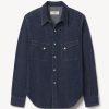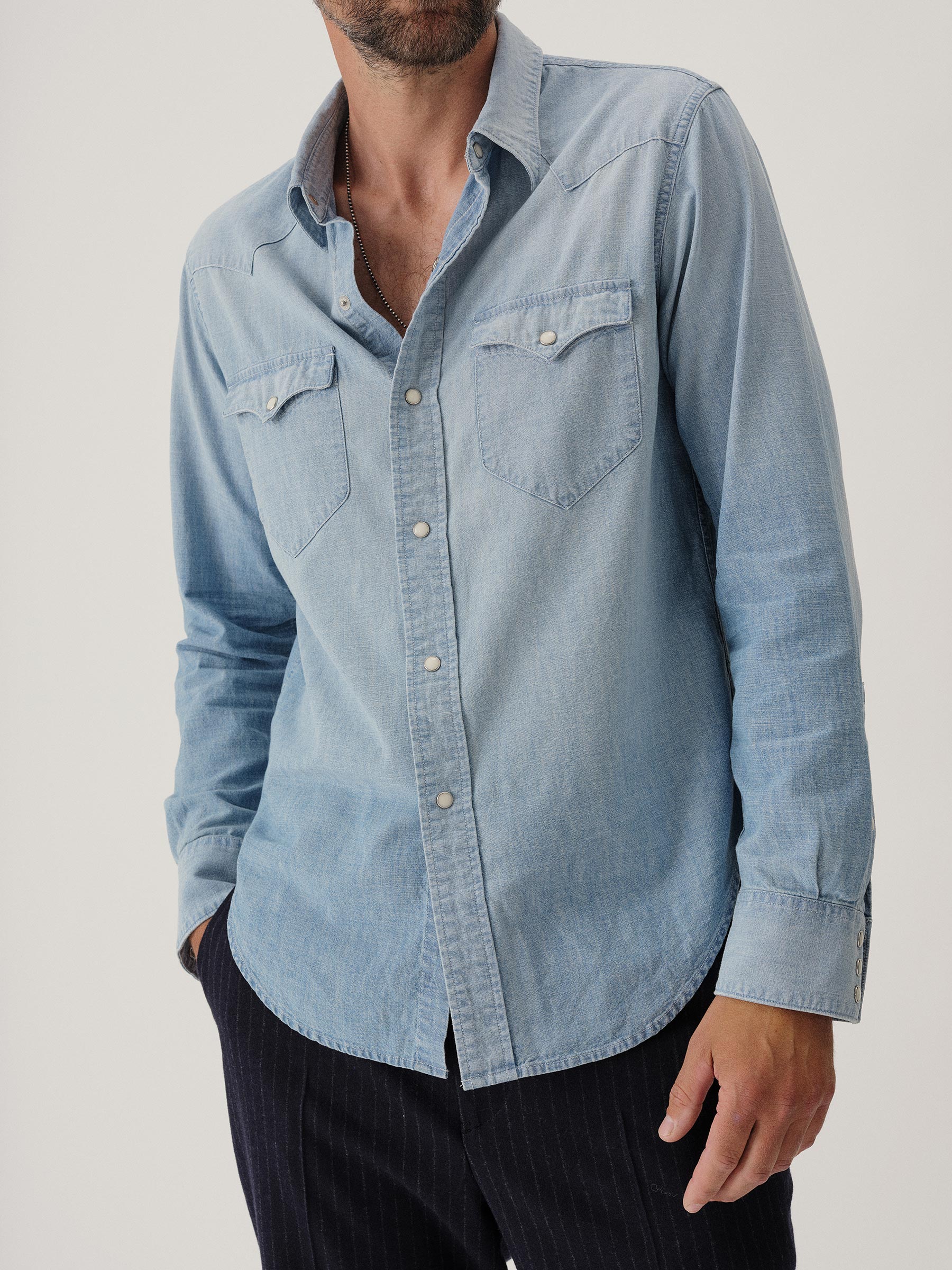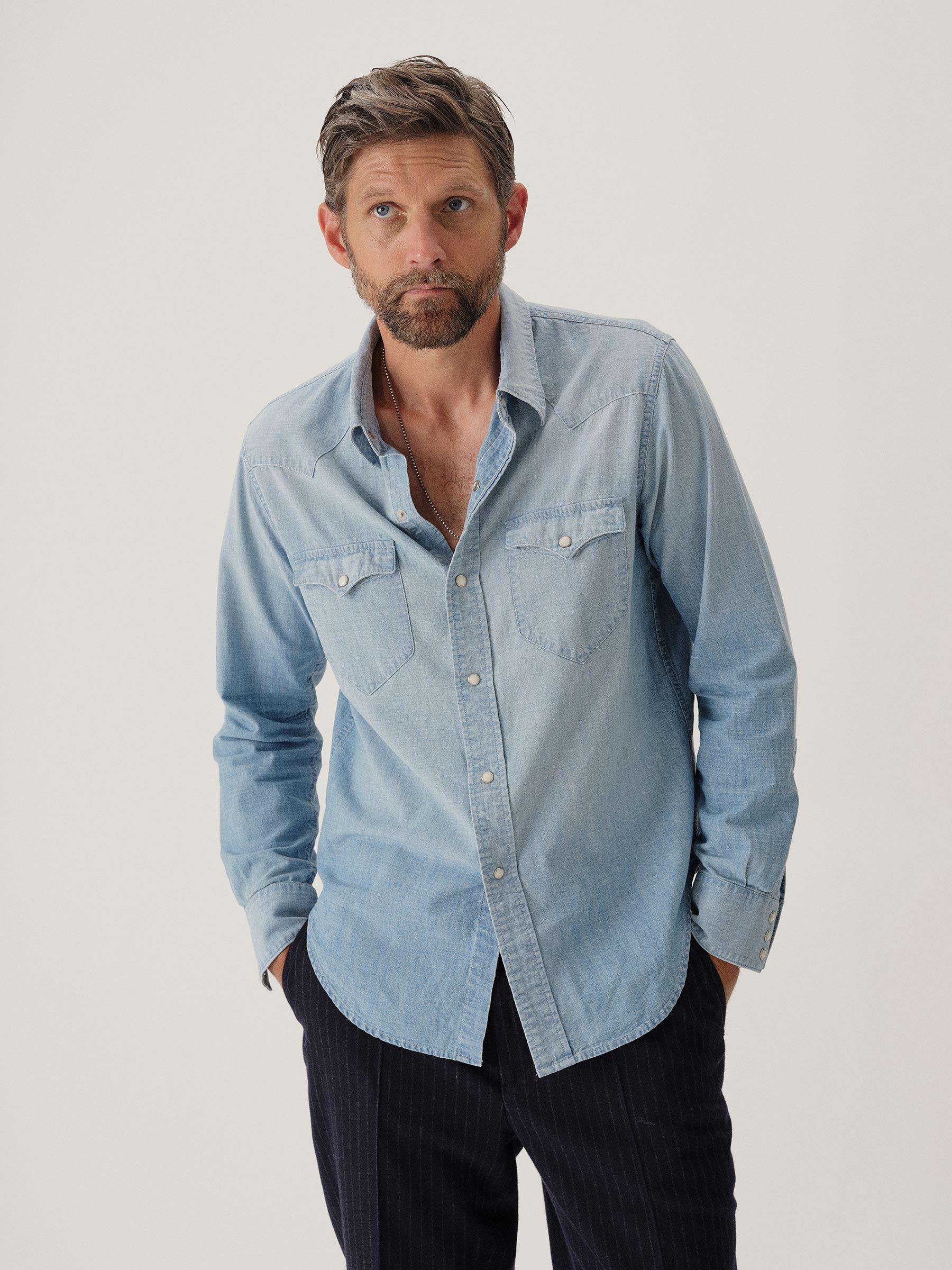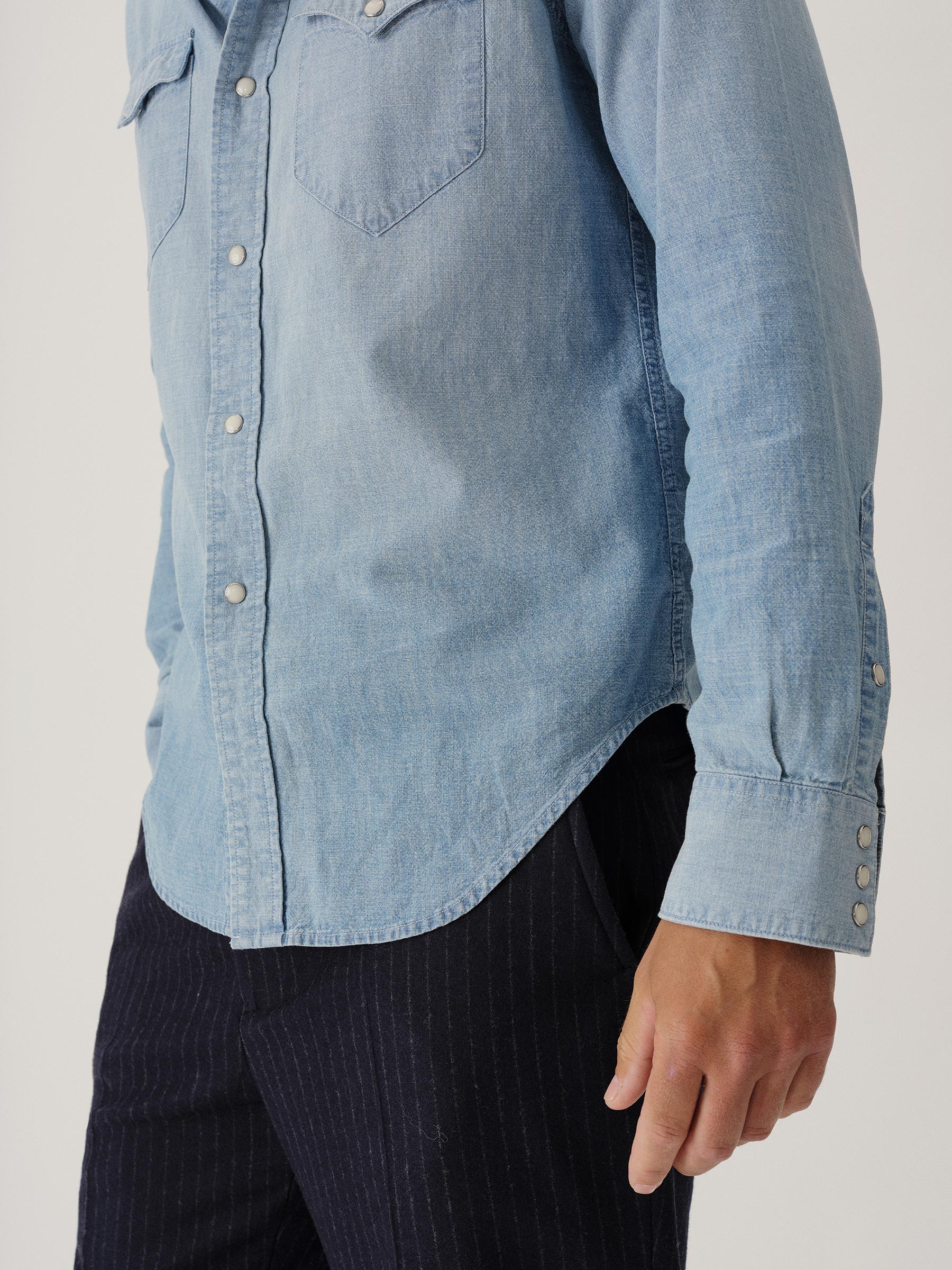 A classic western-style workshirt in a washed cotton chambray. The shirt has all cowboy details like pearl snap closures, curved western yoke, scalloped flap pockets, and three snaps along the cuffs. The blue chambray cotton has been washed for a lived-in feel.