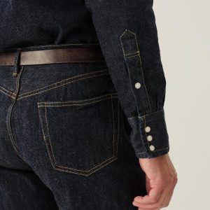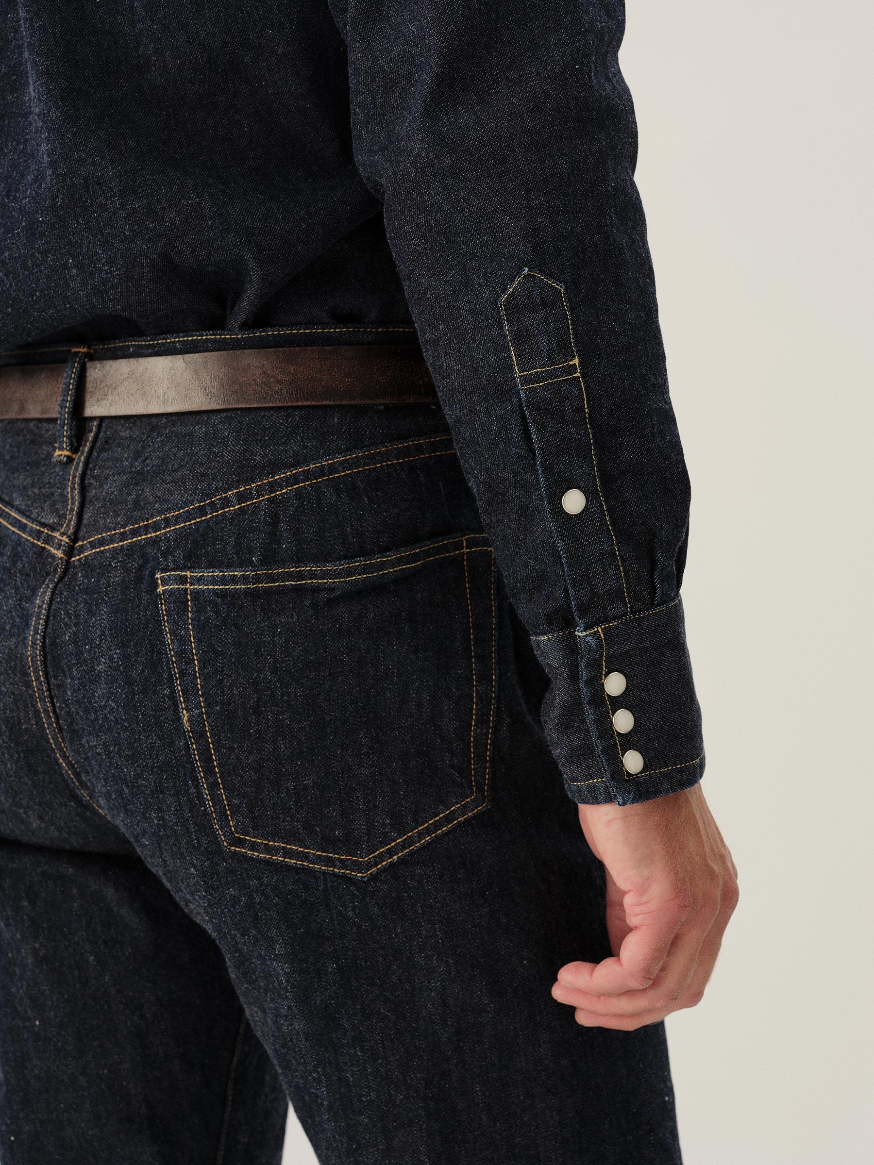 Distinct from single-point Western shirts, the sawtooth pocket style gets its name from the unique, double-point pocket flaps made popular in the 1950s. Cut in a comfortable, classic silhouette, our version is built from 100% cotton Japanese denim twill and features curved front yokes, a curved double-point back yoke, and Japanese U-rim pearl snaps. Fabric will crock/transfer indigo during intial wear- to subside as patina develops.