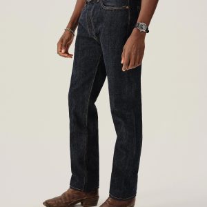 A classic 5-pocket jean in our Cowboy fit: Slightly higher rise with a tailored fit through the thigh and leg. Inspired by blue jeans from the 1940s through the 1960s, this shuttle loomed 14 oz. selvedge denim is unsanforized, and has an organic texture that develops more character with every wear. Garment rinsed for a lived-in feel. Details include copper rivets and a metal tack button fly.