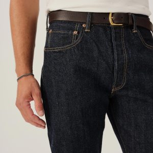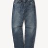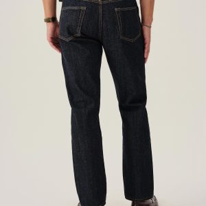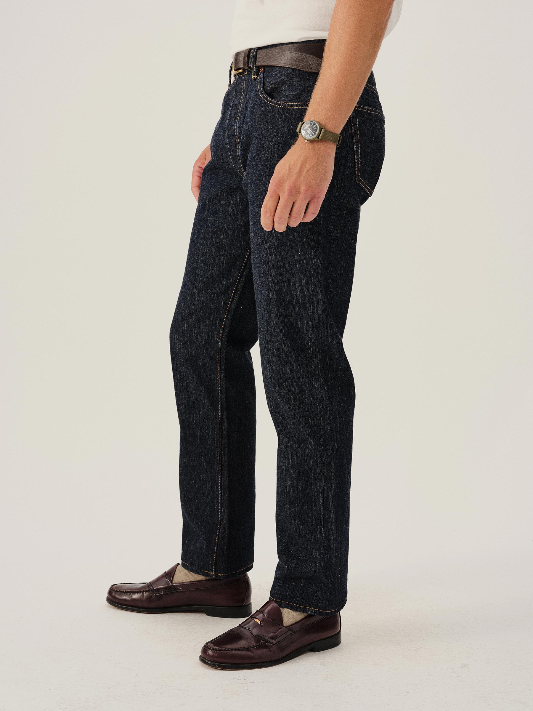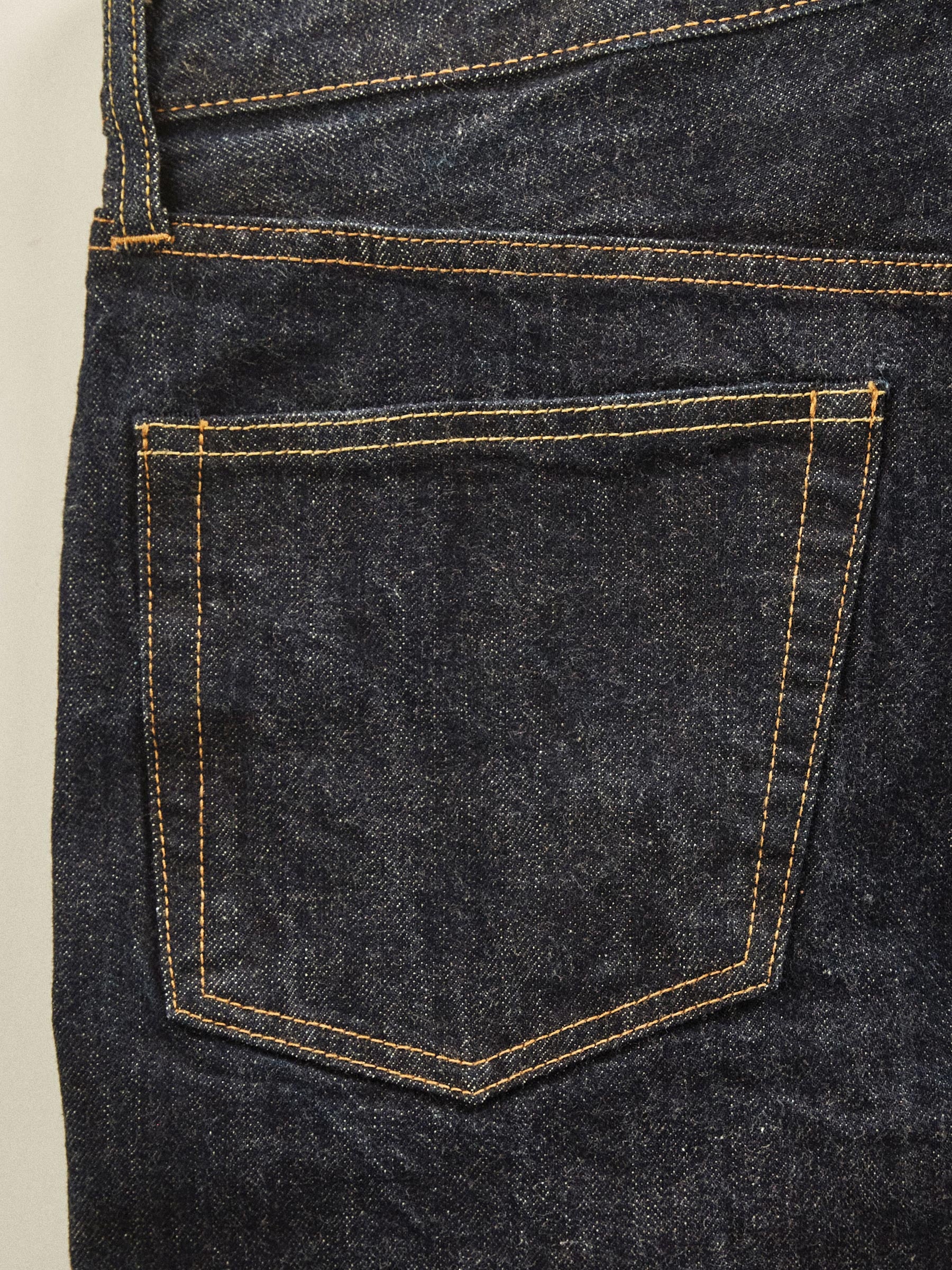 A classic 5-pocket jean in our Ford Standard fit: mid-rise, straight through the thigh with a taper below the knee. Inspired by blue jeans from the 1940s through the 1960s, this shuttle loomed 14 oz. selvedge denim is unsanforized, and has an organic texture that develops more character with every wear. Garment rinsed for a lived-in feel. Details include copper rivets and a metal tack button fly.