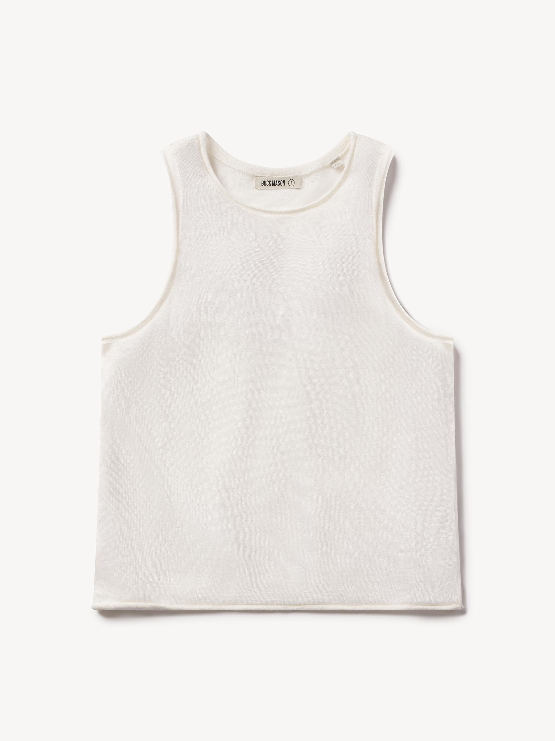 Oversized rollneck sweater-tank knit from textured linen, featuring a high neckline and a concealed thread-chain and snaps at each shoulder to hold bra straps in place. Garment washed for a soft, textured feel.