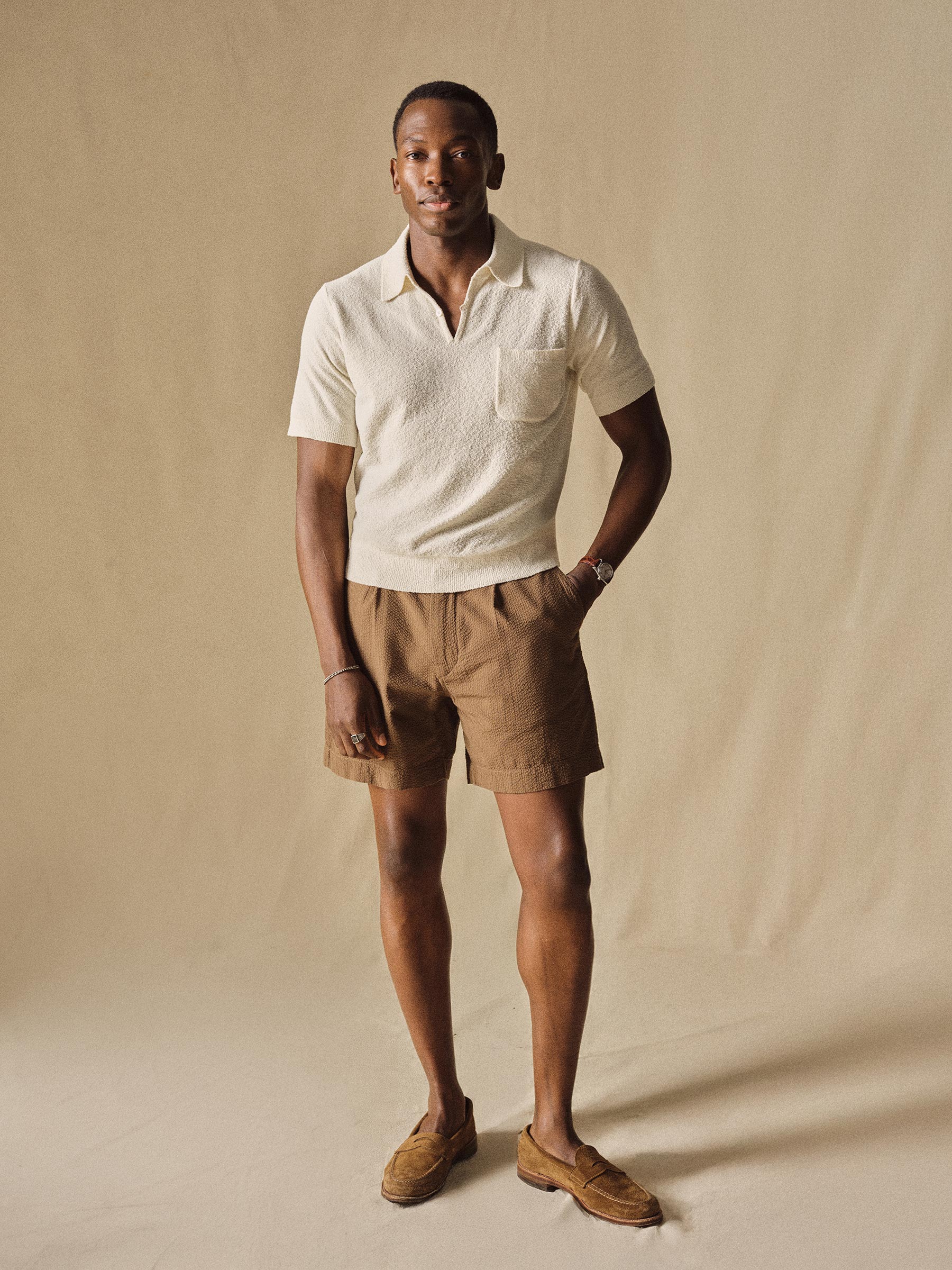 A single-pleat short named after the Parisian tailor who popularized pleated pants in the early 20th century. Cut in a relaxed, classic fit with a high rise, the single reverse pleat adds volume for a more comfortable silhouette. Made from 100% Japanese cotton herringbone. Features include two front slash pockets, two welt back pockets, and a buttoned coin pocket. 6” inseam. Washed for a lived-in feel.