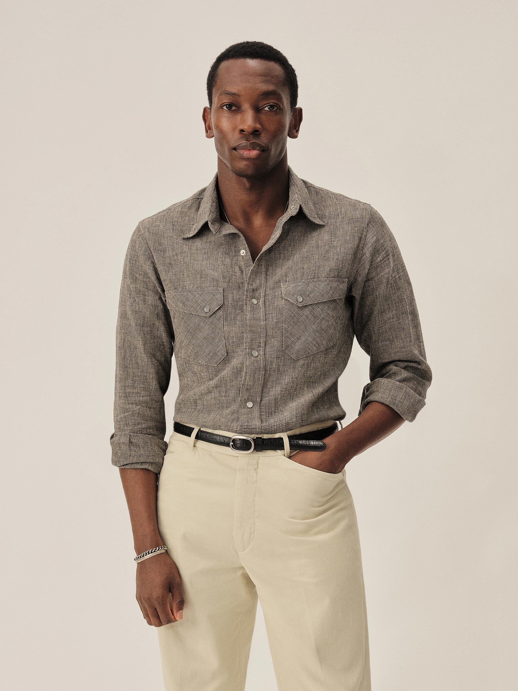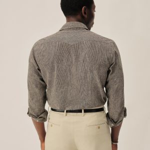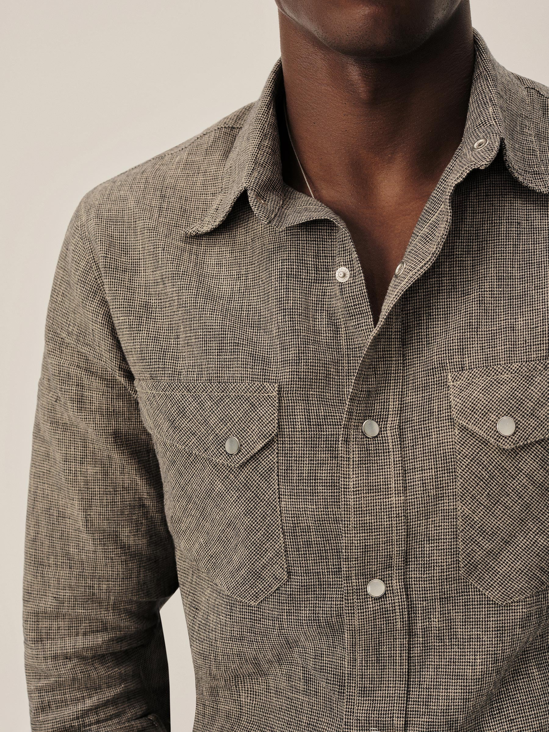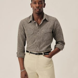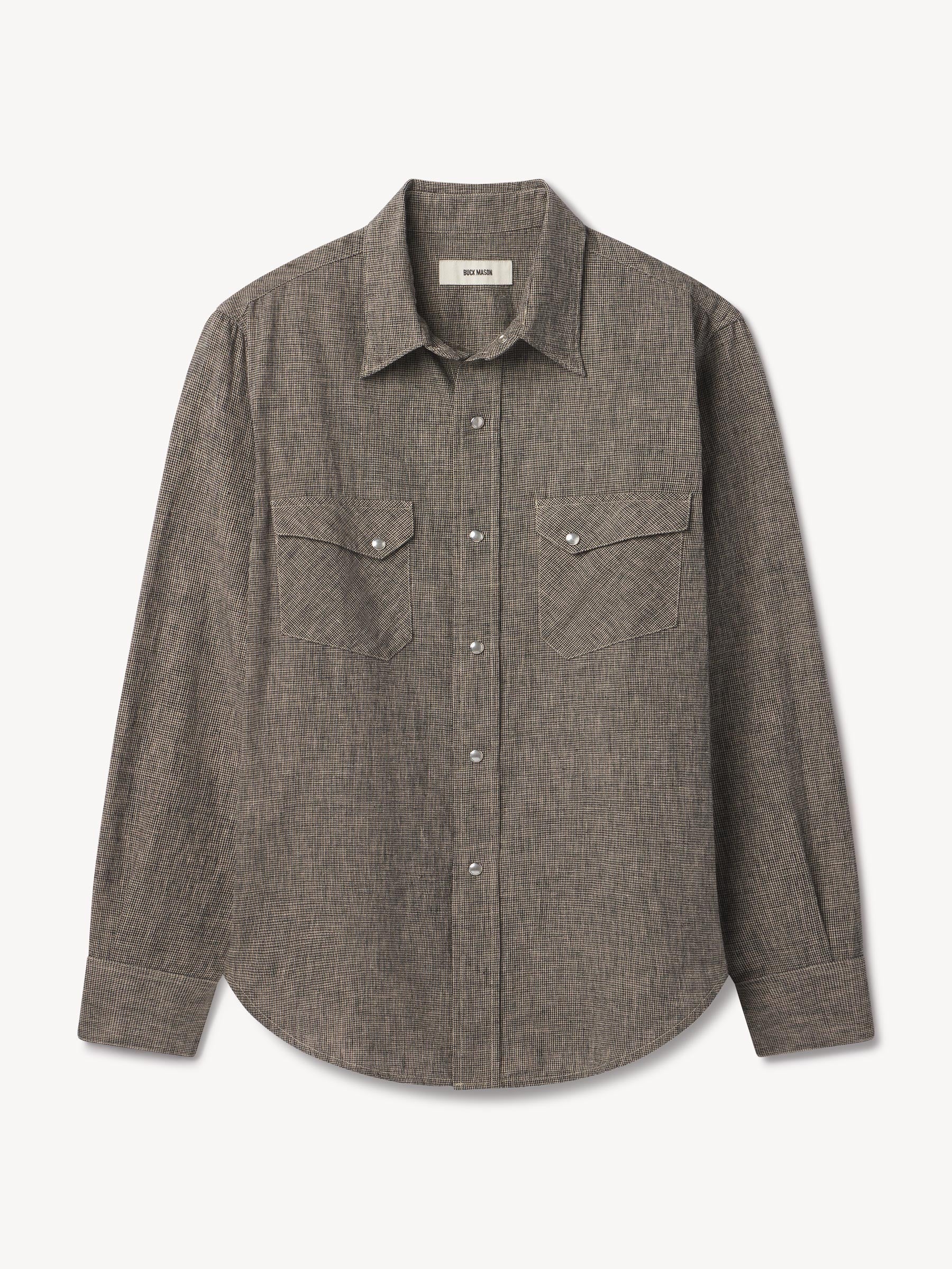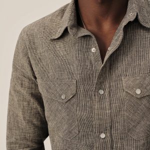 In the style of the 1940s, a classic fit western with no front yokes that lends itself to a more tailored style of dress, cut from a yarn-dyed blend of breezy linen and cotton. Featuring slanted pocket flaps, a pointed back yoke, and snap button fasteners.