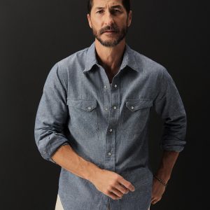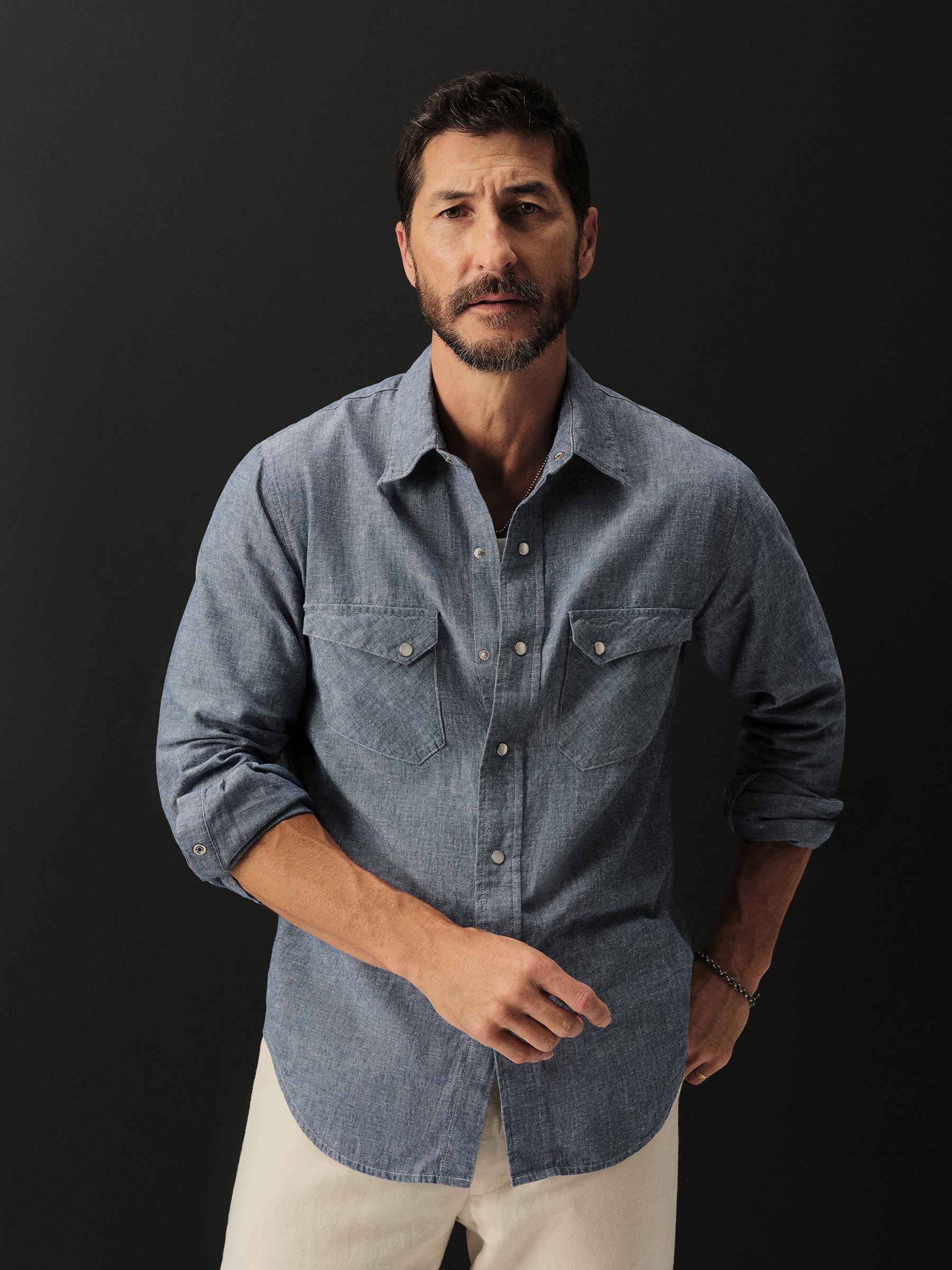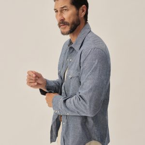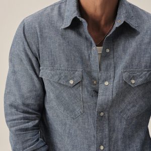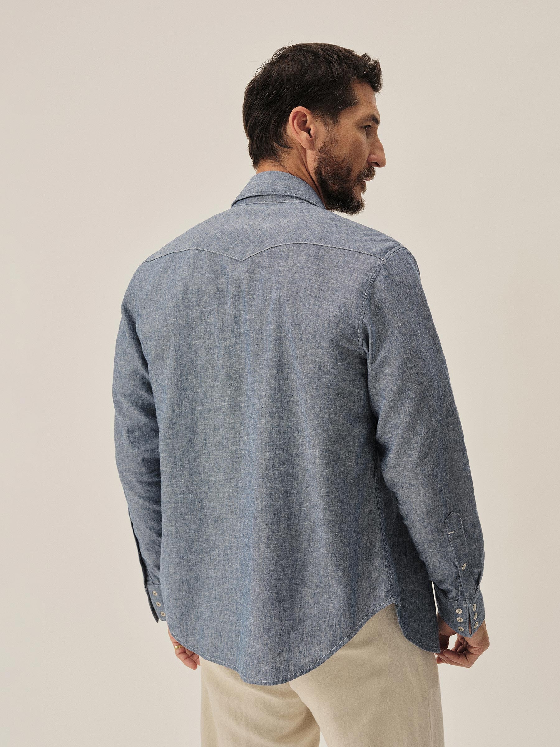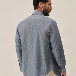 In the style of the 1940s, a classic fit western with no front yokes that lends itself to a more tailored style of dress, cut from a yarn-dyed blend of breezy linen and cotton. Featuring slanted pocket flaps, a pointed back yoke, and snap button fasteners.