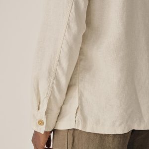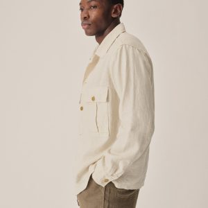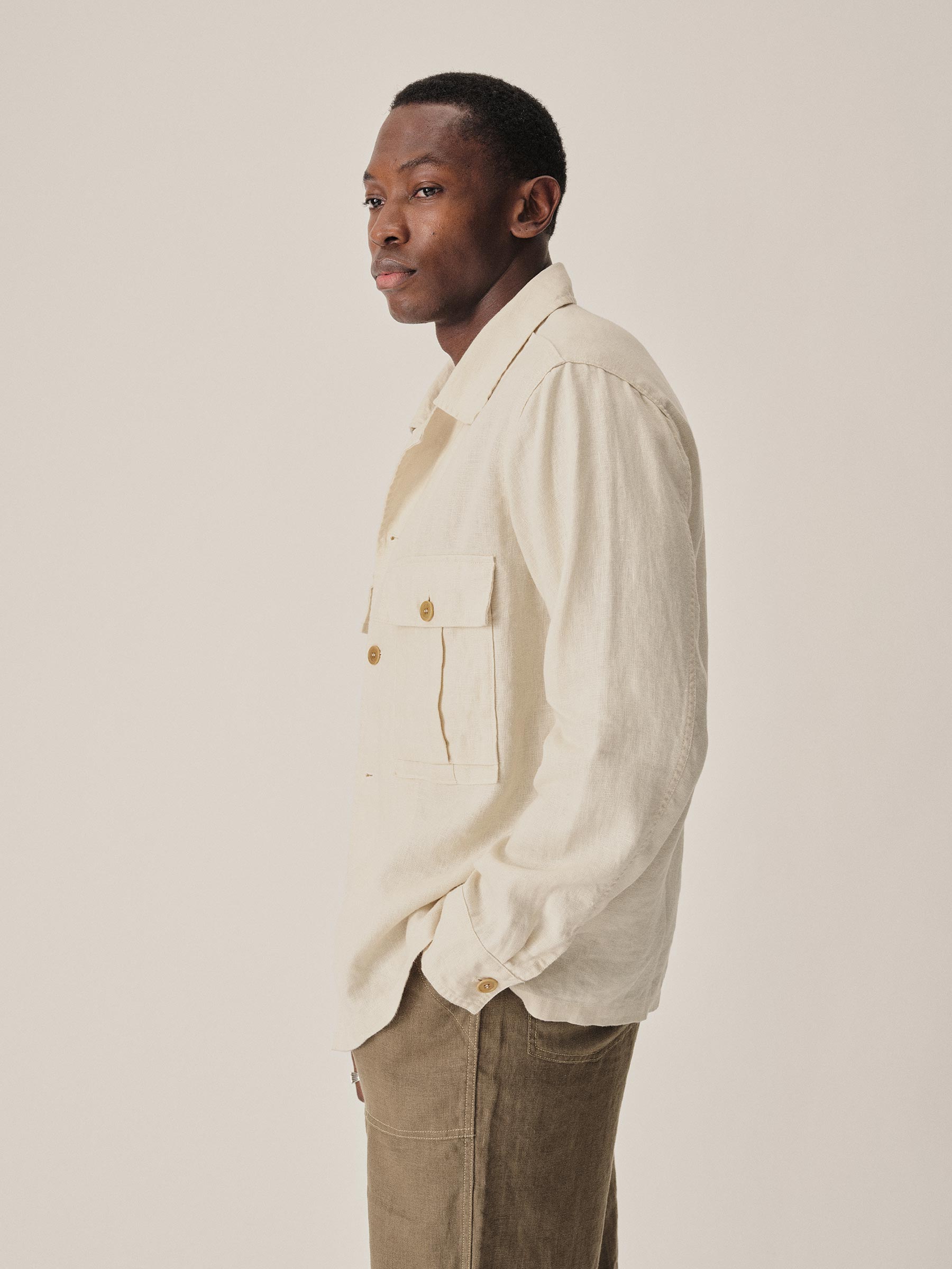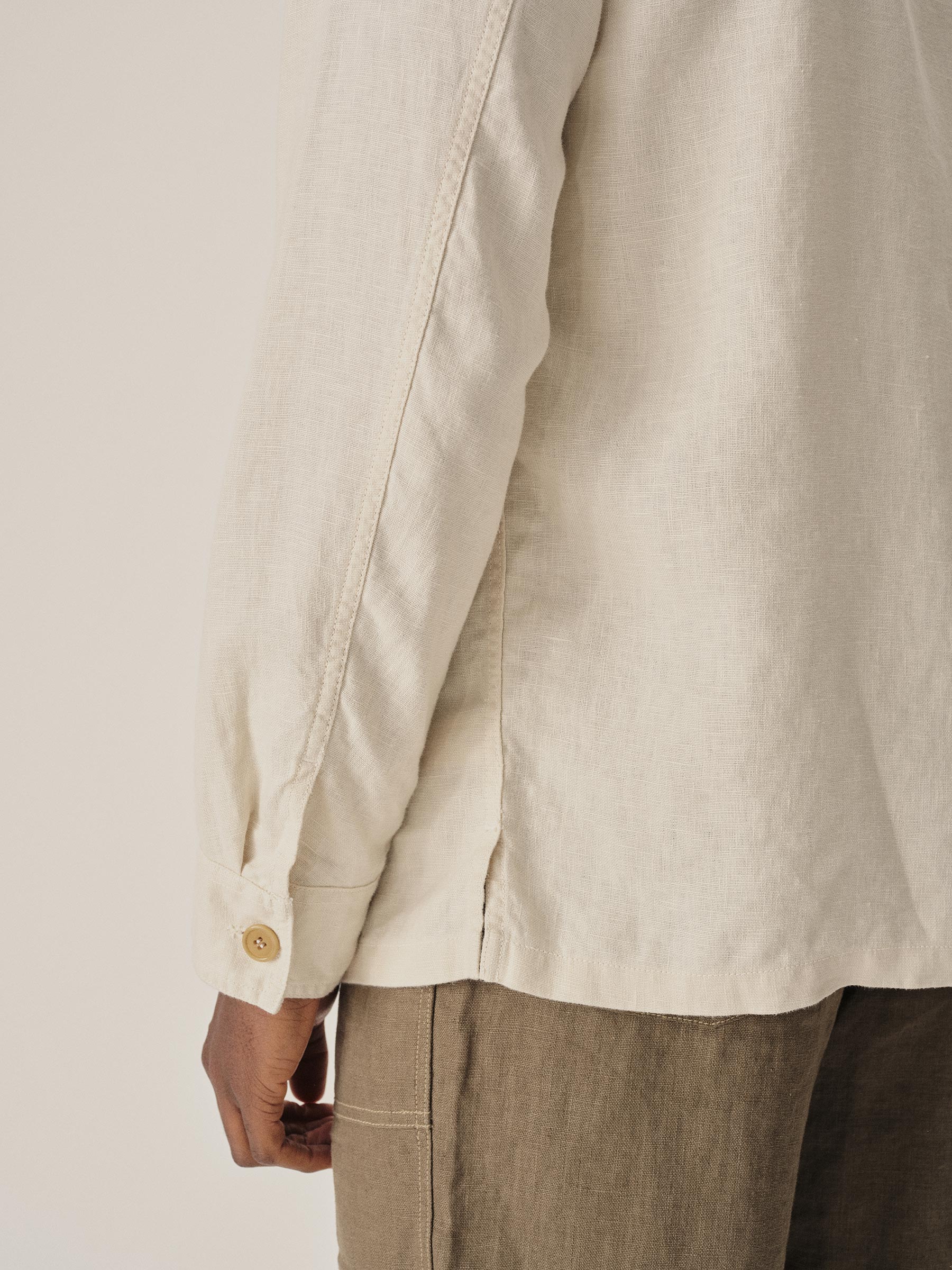 A full fitting fatigue overshirt cut from loose knit mid-weight linen. Details include a vintage-inspired point collar, bellows pocket, and flat-felled double needle seams, which is the same construction we use on our jeans. We sourced larger-than-average flax fibers configured in a loose weave, which gives this shirt a subtle grain and lightweight feel.