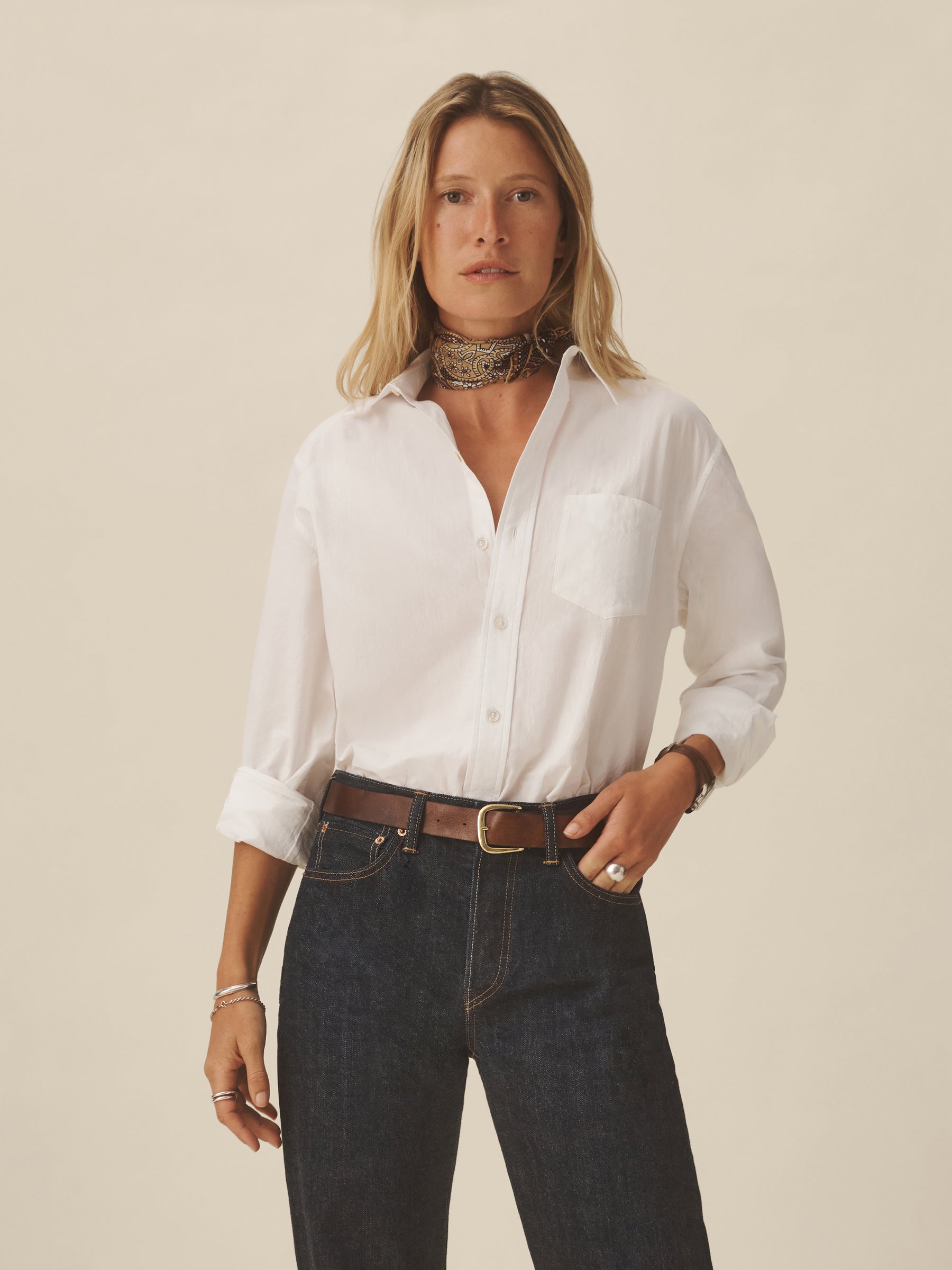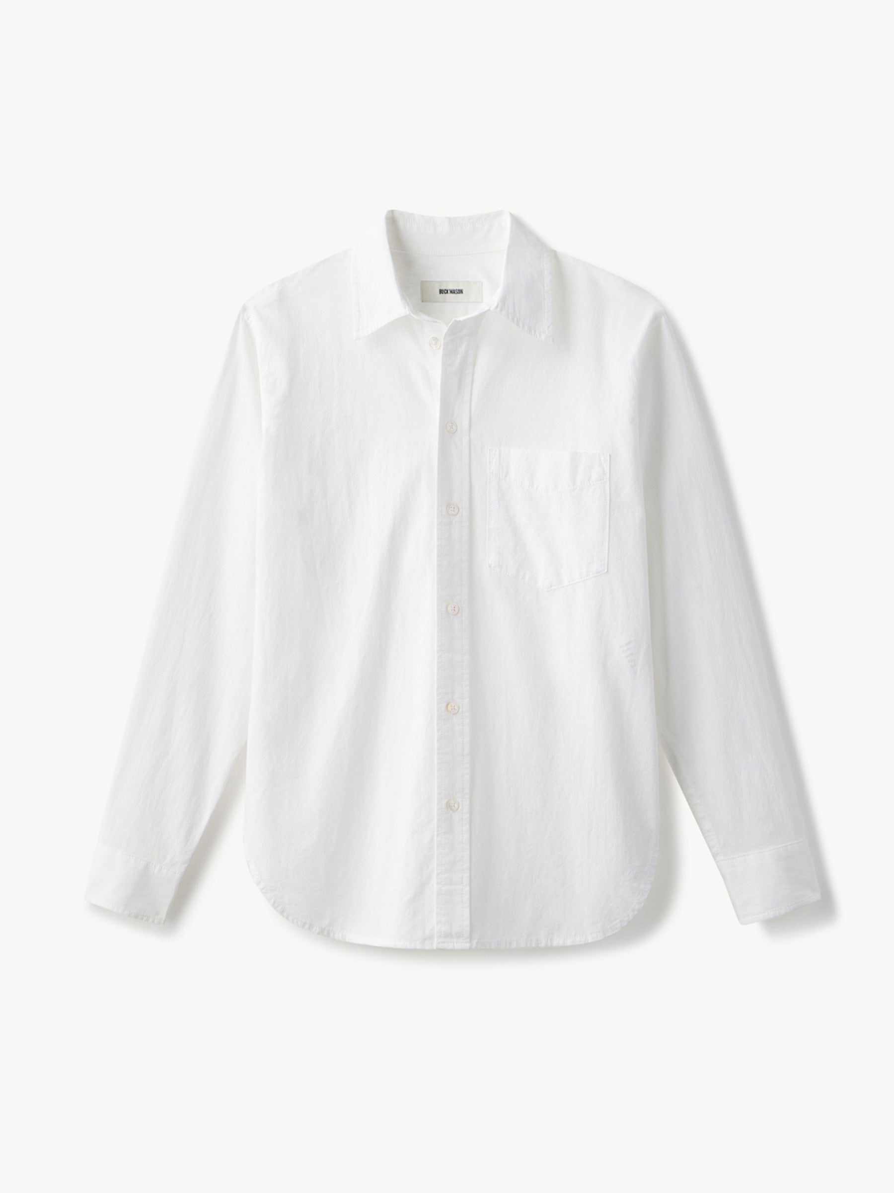 Relaxed button-down shirt in 3.7 oz. cotton plainweave. 29.5” length hits just below the hip. Details include a back yoke with box pleat, a single spade pocket, and pleated cuffs. Inspired by mid-century men’s shirting, this piece can be worn on its own, layered over a tee, or paired with our Rider Pant. Garment washed with softener for a lived-in feel.