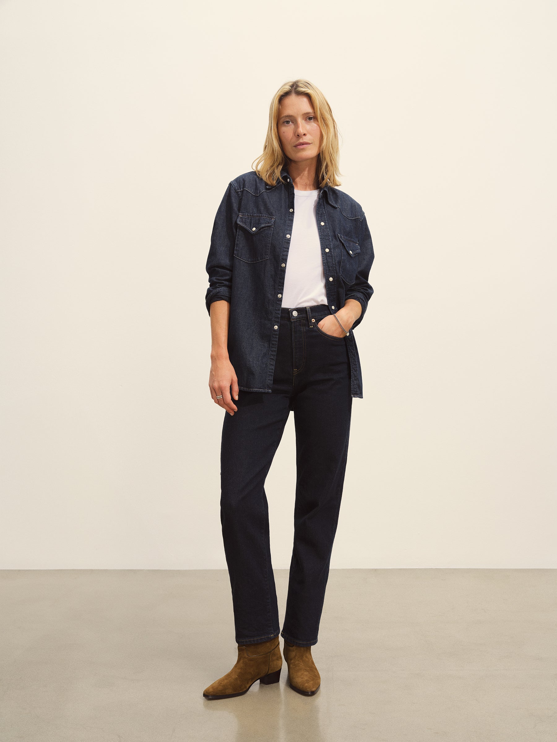 Inspired by vintage western shirting, our take has utility-style details like an angled front yoke, a back yoke, flap pockets, cuffs, and contrast stitching. Made from light and drapey 8 oz denim with an irregular raised nep texture, it’s finished with Japanese pearl snaps and garment washed for a lived-in feel.