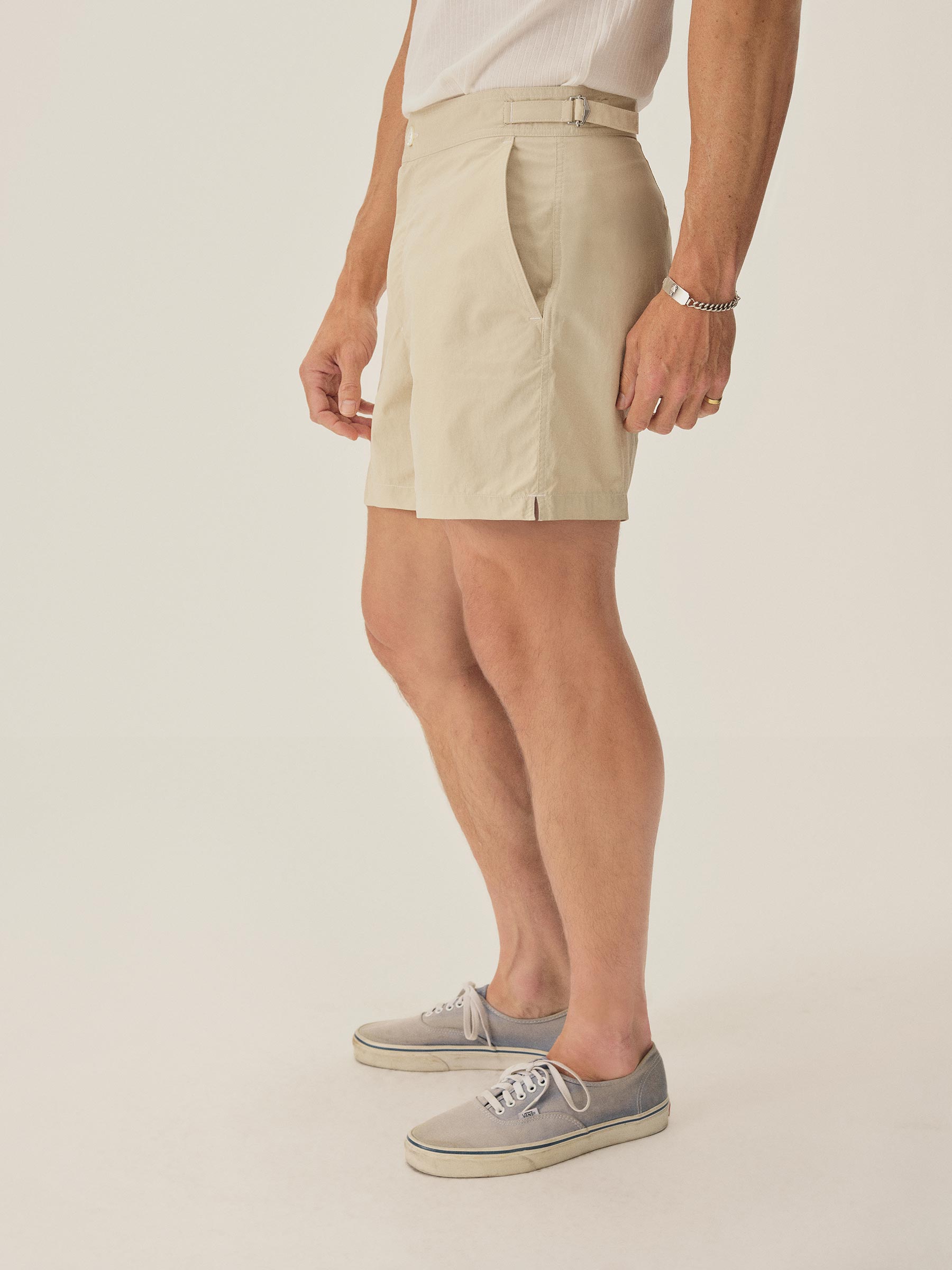 A classic-fit resort short made from sturdy nylon twill, cut with a slightly shorter inseam. Featuring a zipper fly, a button closure, waistband adjuster tabs with metal buckles, and a zippered back pocket.