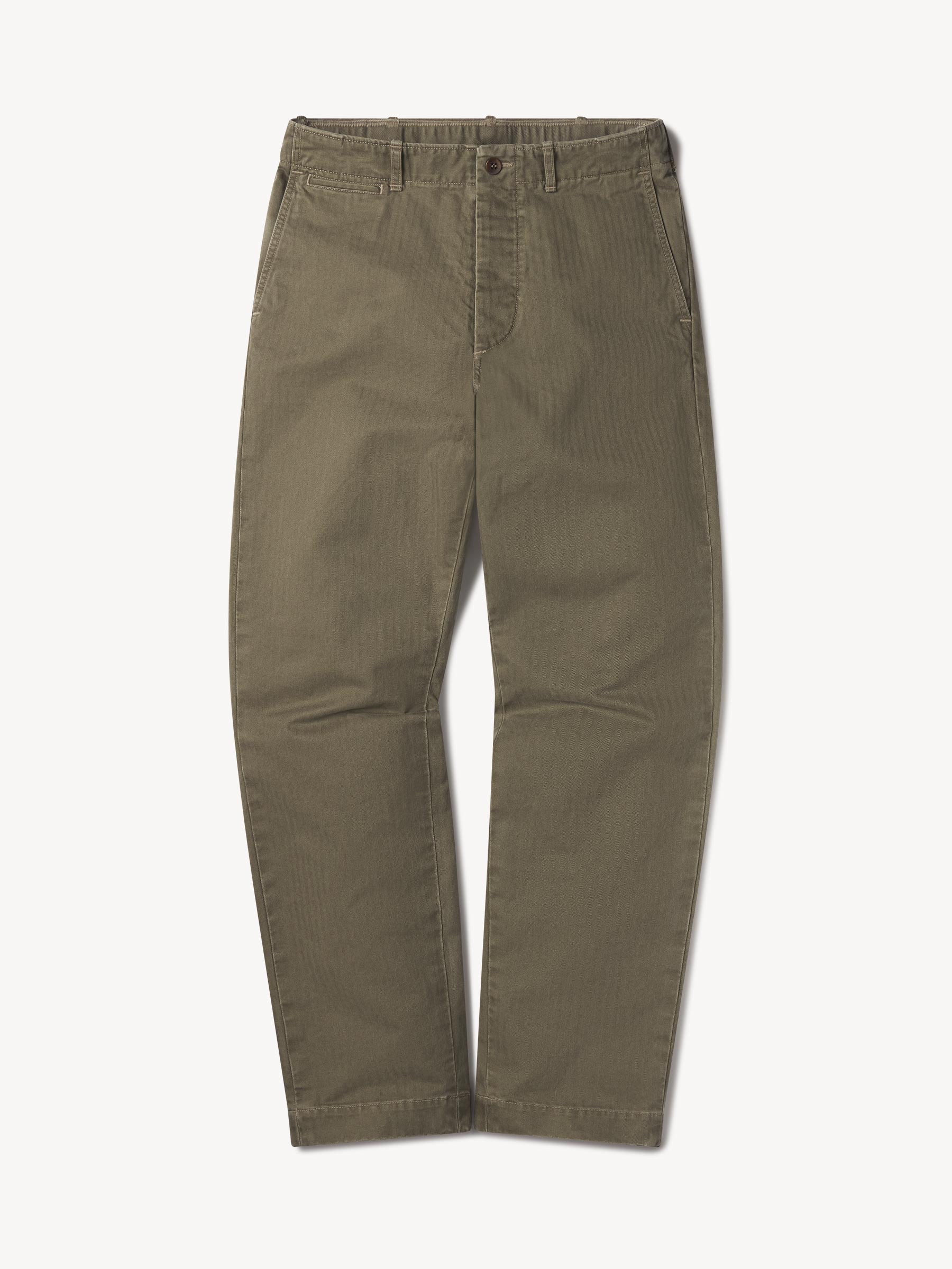 The classic officer’s pant in our Maverick Slim Fit: mid-rise, slim through the thighs with a taper below the knee. Cut from a midweight cotton HBT that’s been washed to achieve the same look and feel of vintage service uniforms. Featuring a one-piece “Hollywood” waistband, slash front pockets, welted back pockets, and a welted coin pocket. Finished with real corozo buttons. Garment washed for a lived-in feel. Button fly.