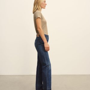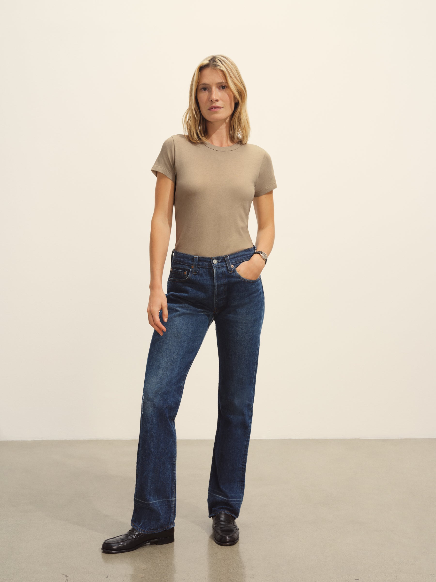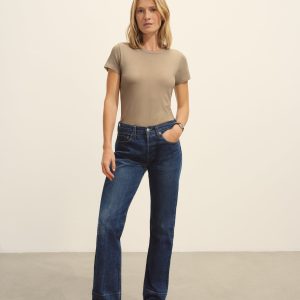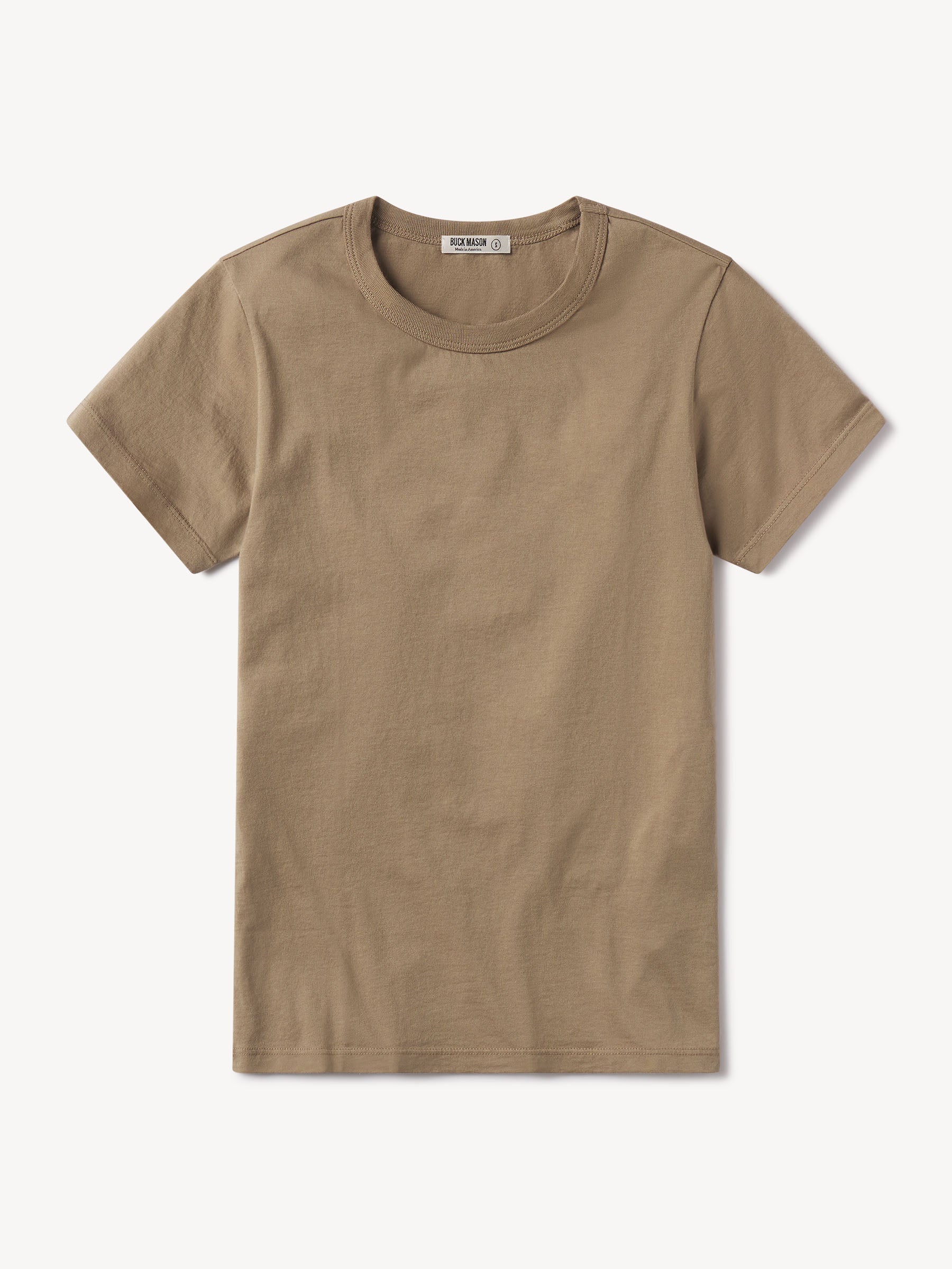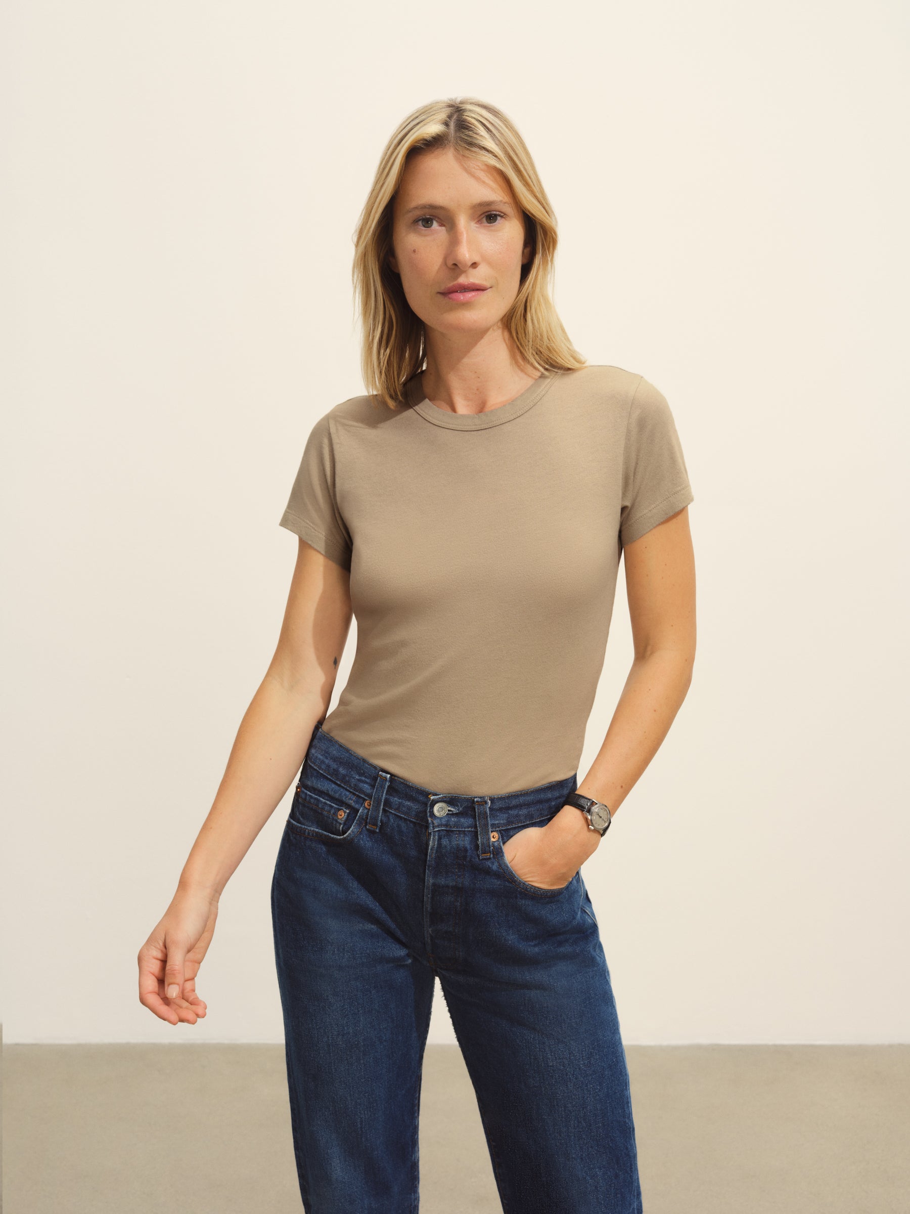 Slim fit short sleeve crewneck tee with a straight hem in 120 GSM jersey, knit from long-staple Supima cotton. Constructed with a durable rib stitch collar and double-needle cover stitch hem. Garment washed with softener for a lived-in feel.