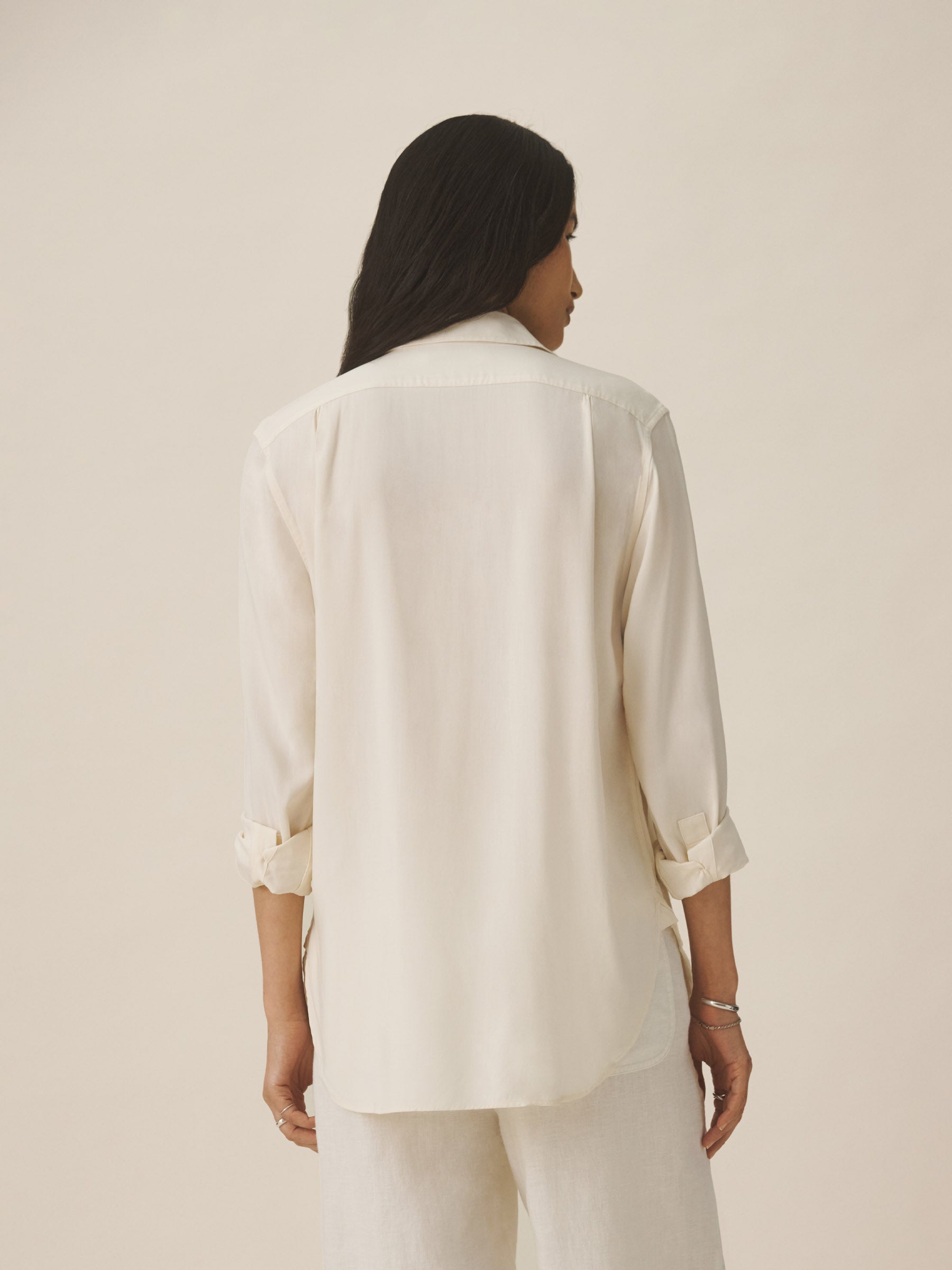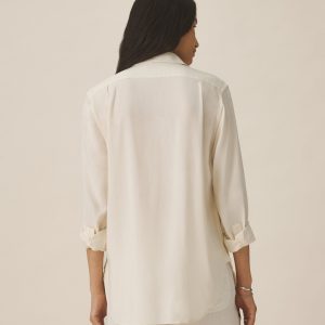 A modern take on men’s sportswear shirts from the 1940s, a relaxed button-down shirt in a silky rayon jacquard weave. Featuring a carved collar, side-seam gussets, button-through plackets along shirt front and sleeves, and pintuck detailing on back yoke and sleeve cuffs. Finished with side-seam gussets and mother of pearl buttons.
