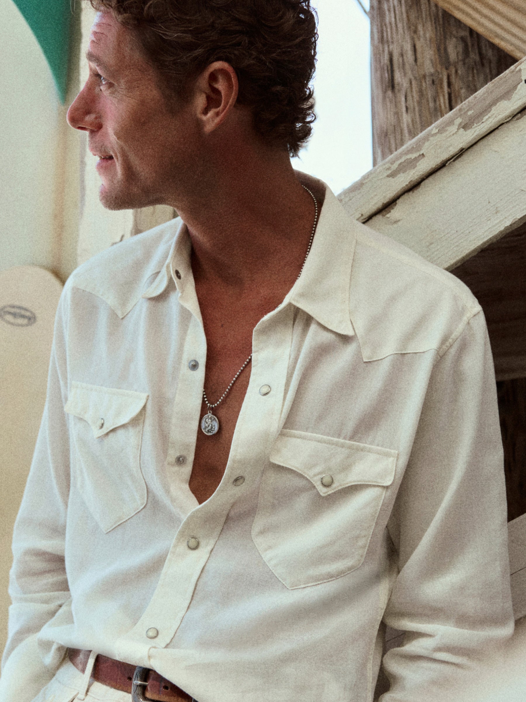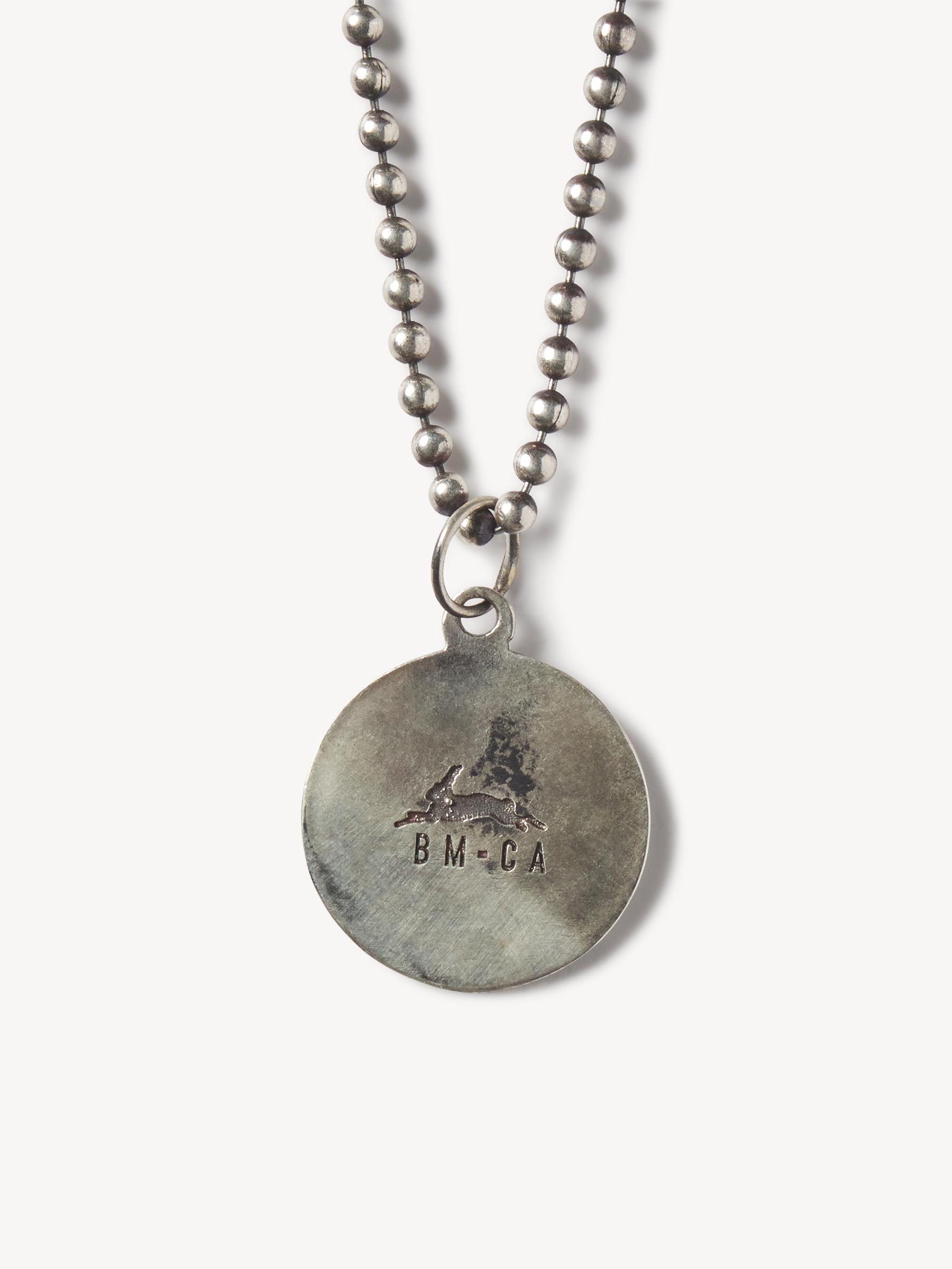 A nod to the road-worn keepsakes of mid-century wanderers, this necklace features a hand-stamped sterling charm suspended on a classic ball chain. Made in Texas. Finished with a Red Rabbit x Buck Mason co-branded stamp.
