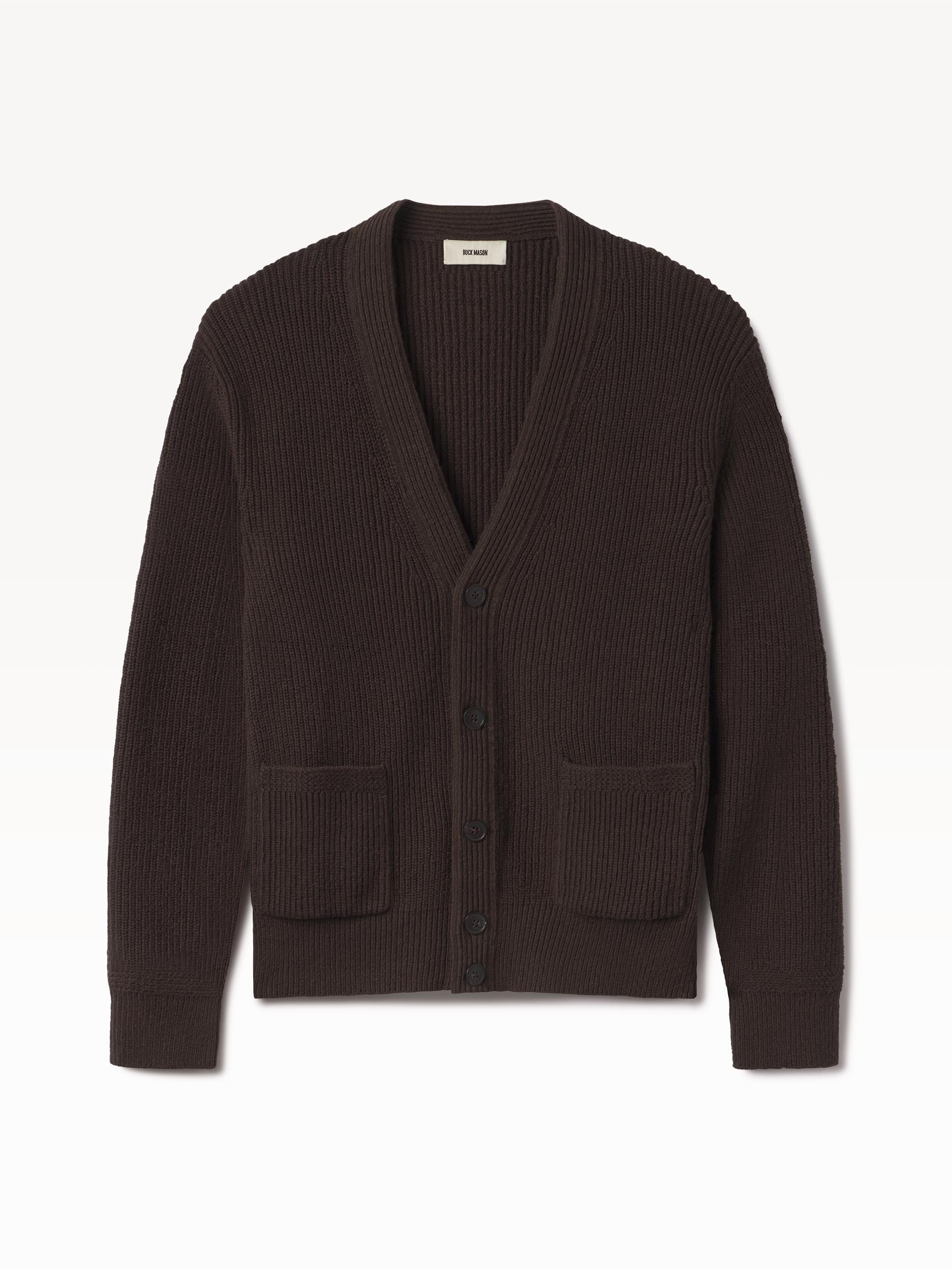Classic fit fisherman’s cardigan sweater in a homespun textured cotton rib with two patch front pockets and a 5-button front closure. Constructed with hand-linked seams, double layer ribbing at the front placket, and racking stitch detailing at the cuffs.