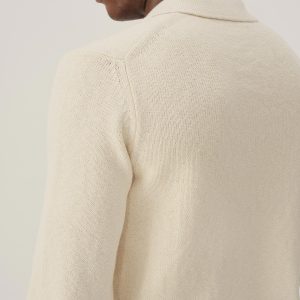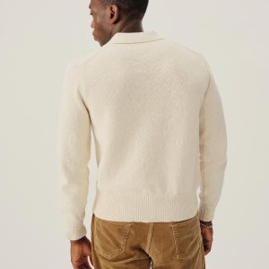 Classic fit polo sweater in a 7 gauge half cardigan rib knit from our homespun yarn-dyed cotton. Features a 3-button rib center front placket with nacre buttons and a rib collar designed to lay flat. Constructed with hand-linked seams and racking stitch detailing at the cuffs.