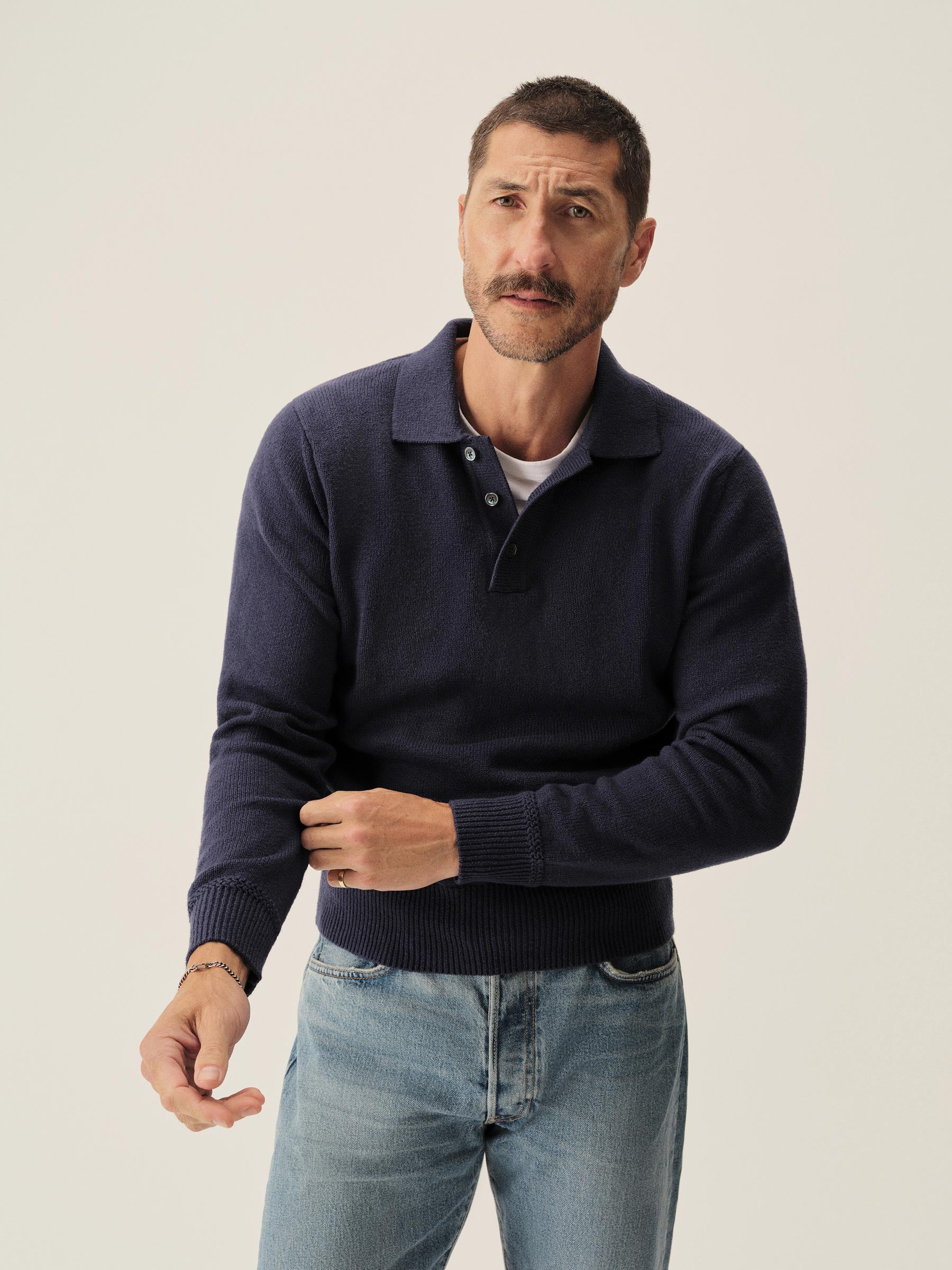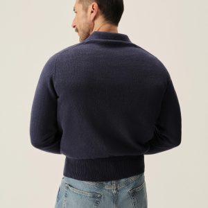 Classic fit polo sweater in a 7 gauge half cardigan rib knit from our homespun yarn-dyed cotton. Features a 3-button rib center front placket with nacre buttons and a rib collar designed to lay flat. Constructed with hand-linked seams and racking stitch detailing at the cuffs.