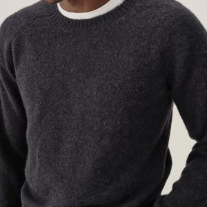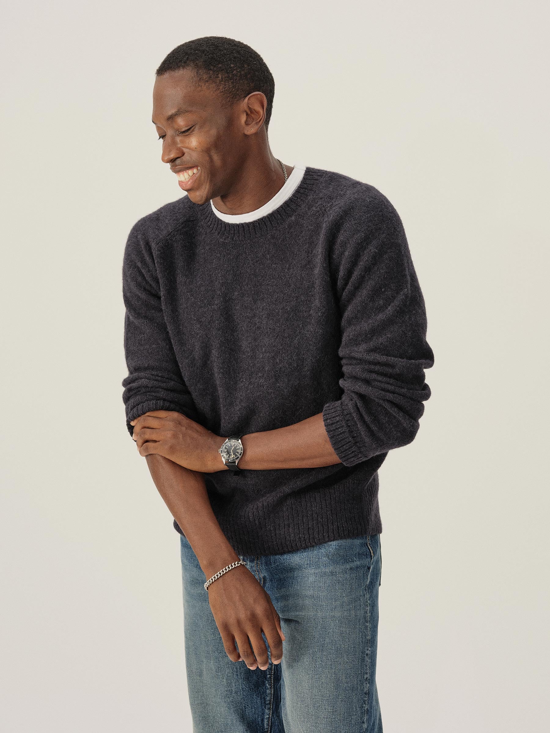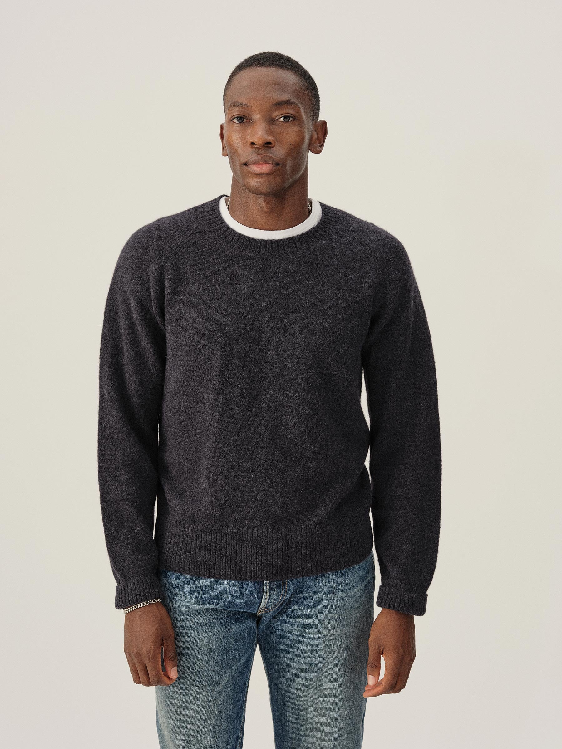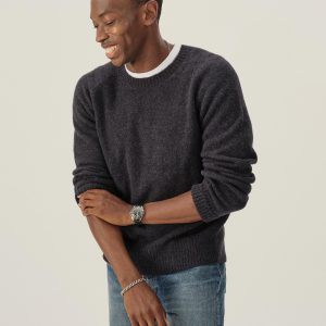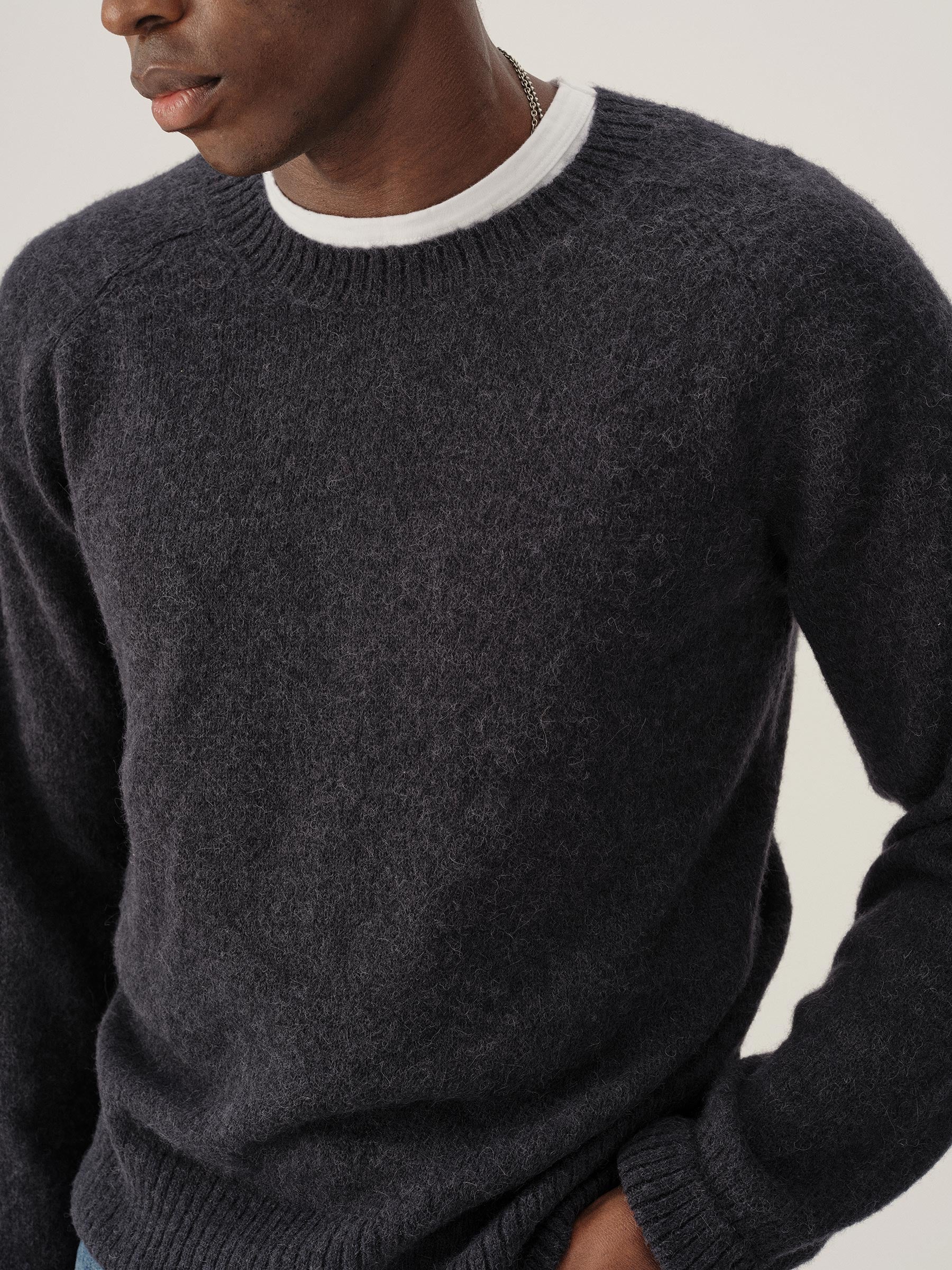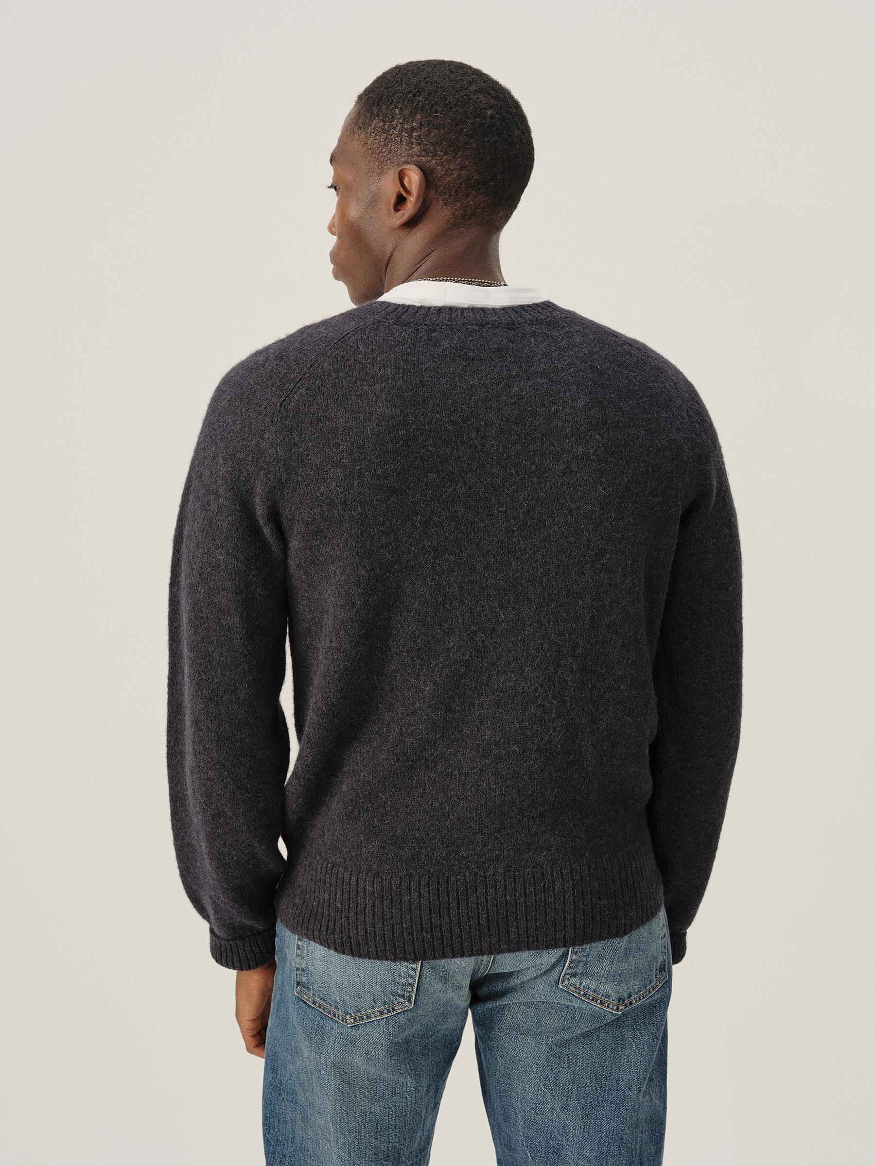 Our makers craft this sweater from a lofty blend of alpaca, recycled fibers, and wool, providing a plush, textured touch. The ribbed collar, cuffs, and hem are double-layered to help hold their shape.