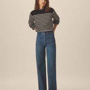 Inspired by classic French mariner sweaters, a knit in Italy Breton-striped crew from a yarn-dyed blend of extrafine merino wool and cotton. Knit with a subtly textured 12-gauge full-needle rib stitch. Designed with a slightly shrunken fit and finished with functional buttons at the shoulder.