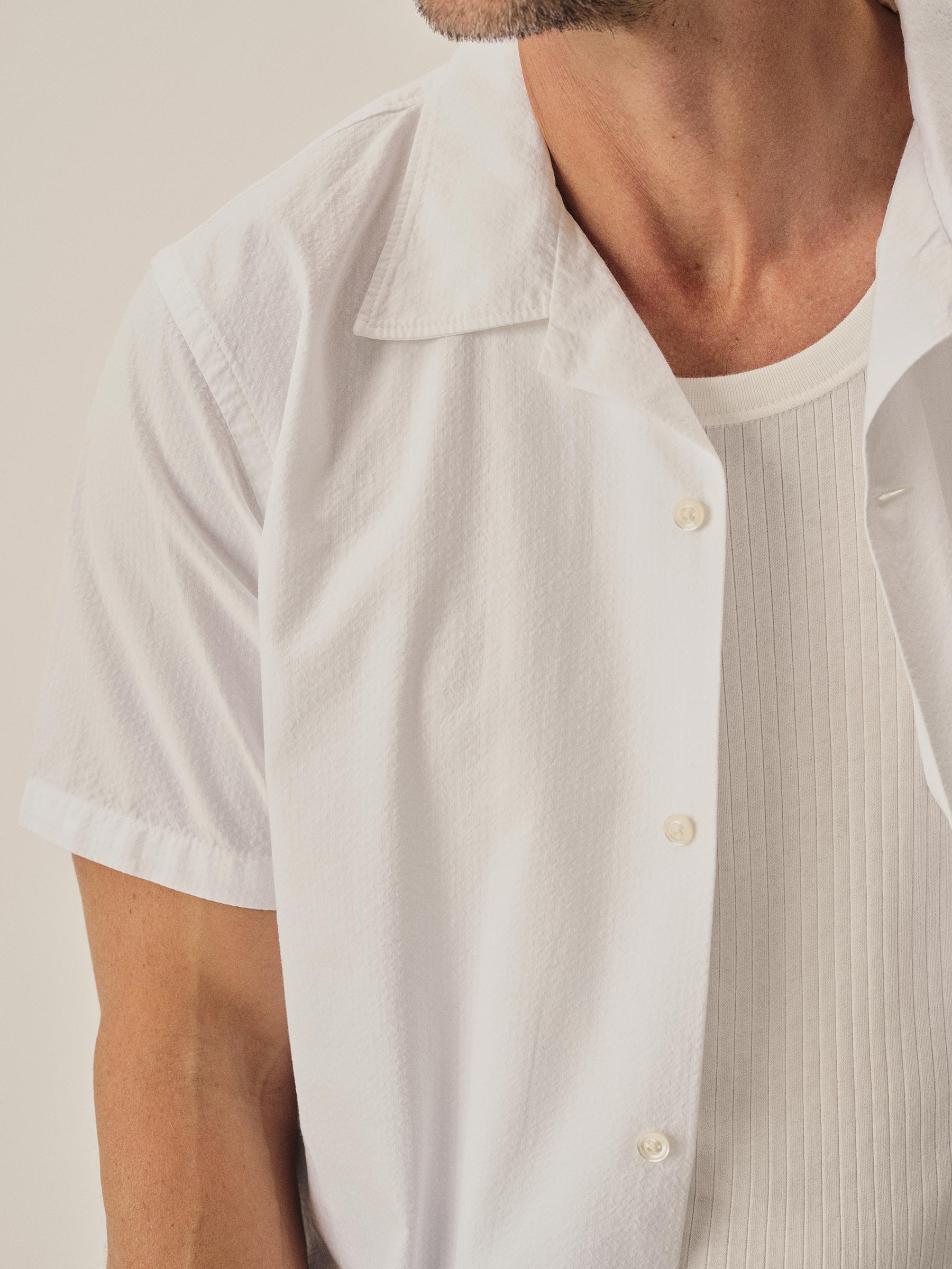 A light, airy seersucker camp shirt cut in a boxy fit with a straight hem. Features a one pocket construction and Mother of Pearl buttons.