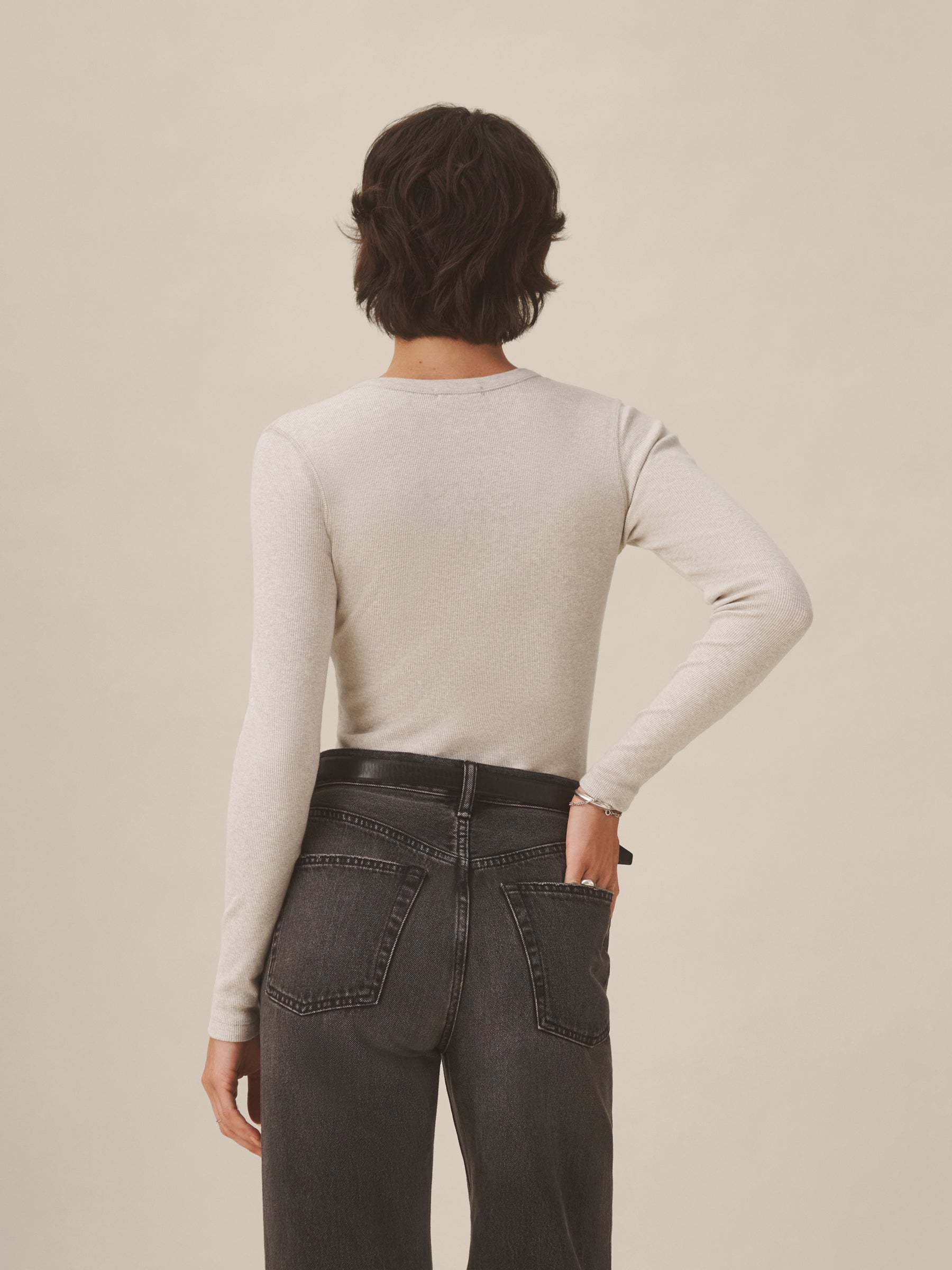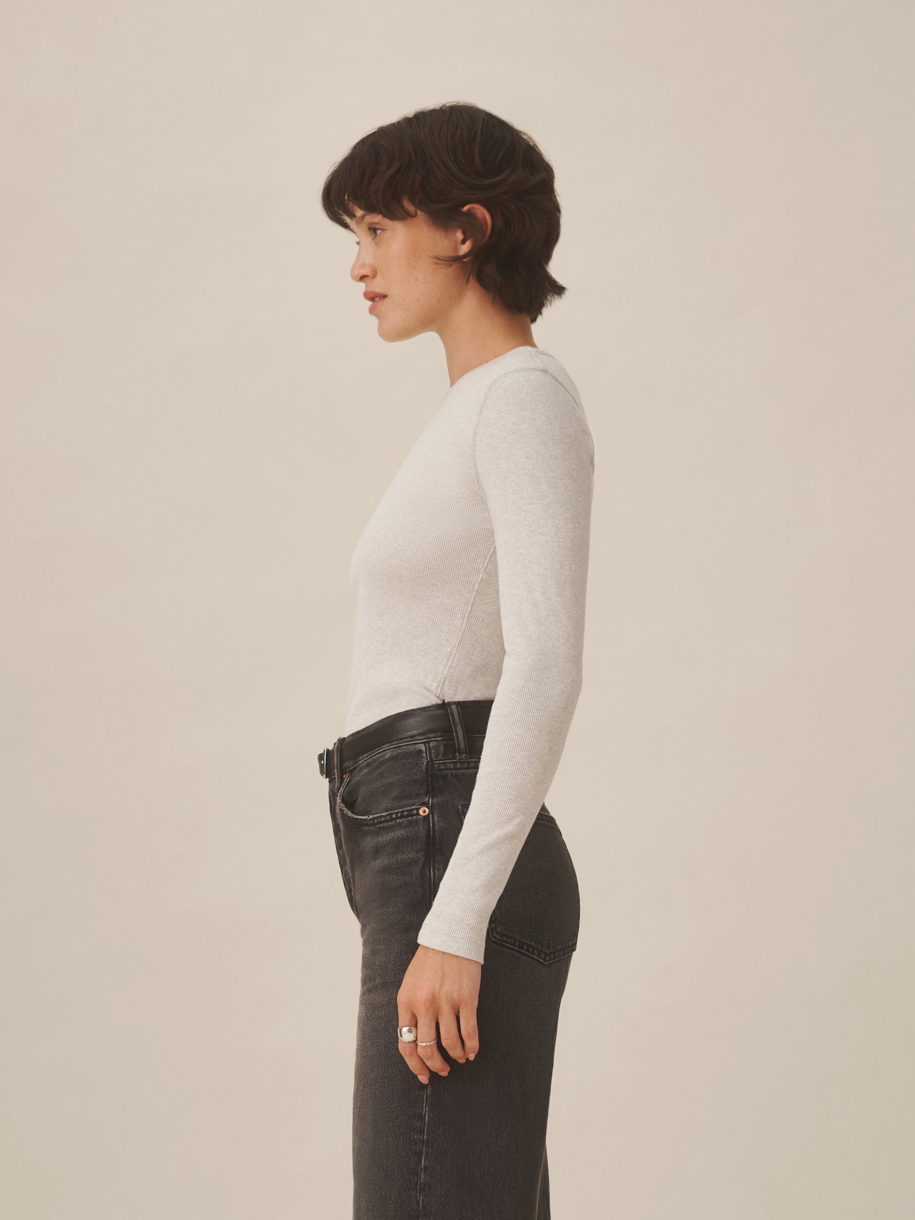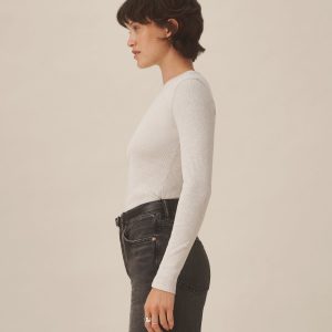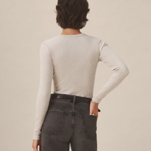 Slim fit ribbed long sleeve tee cut from 295 GSM stretch cotton that holds its shape. 2×2 rib structure—two rows of rib stitch, two rows of jersey stitch—is offset by contrast 1×1 rib at the neck. Constructed with coverstitching throughout and flatlock stitching at the side seams. Garment washed for a lived-in feel.