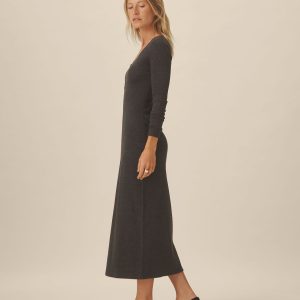 An ankle-length Henley dress made from a military-inspired rib knit with subtle stretch. Designed with a slim fit through the body, it’s designed with a scoop neckline, full-length sleeves, and a center front placket with real mother-of-pearl shell buttons. Finished with clean lines and an open neckline.