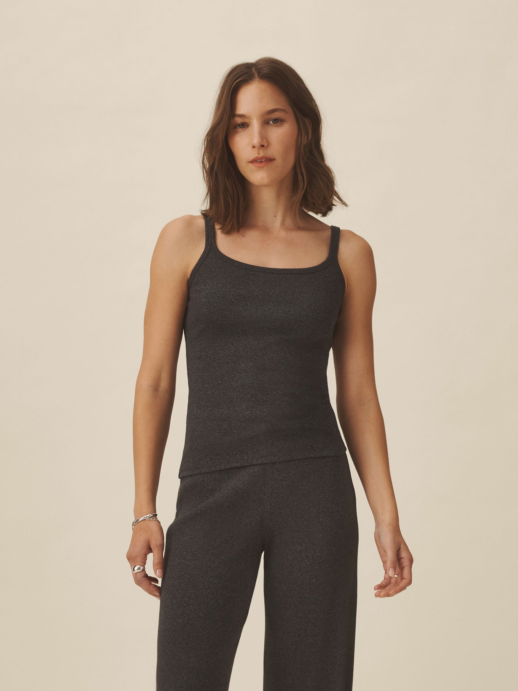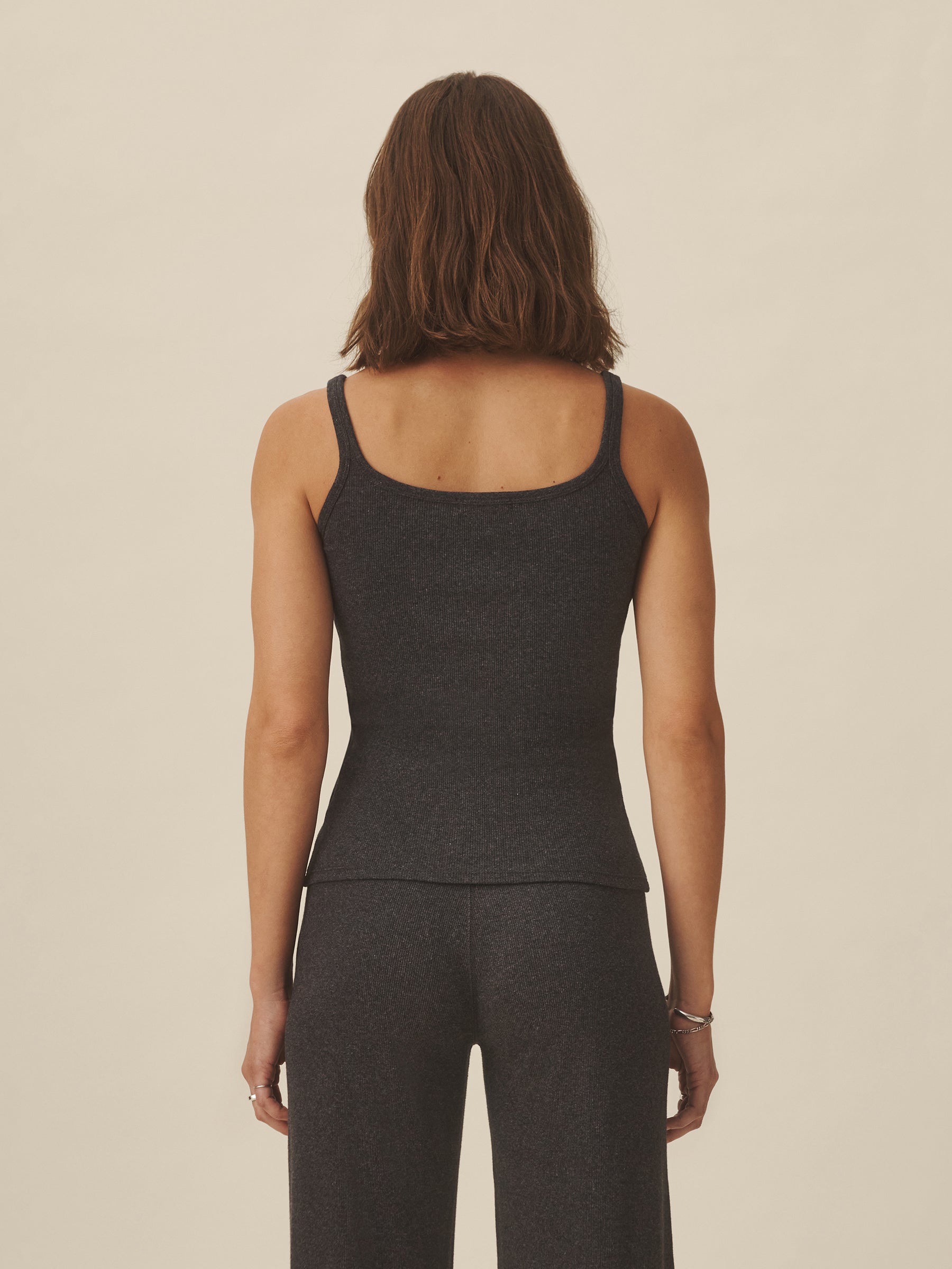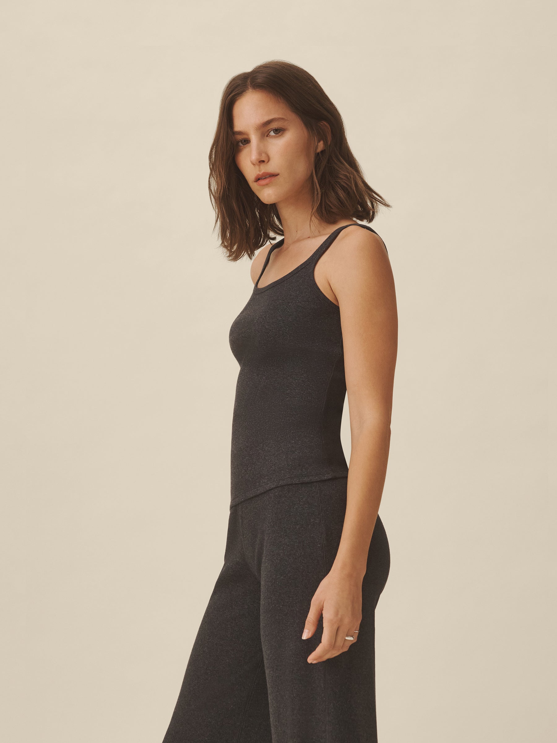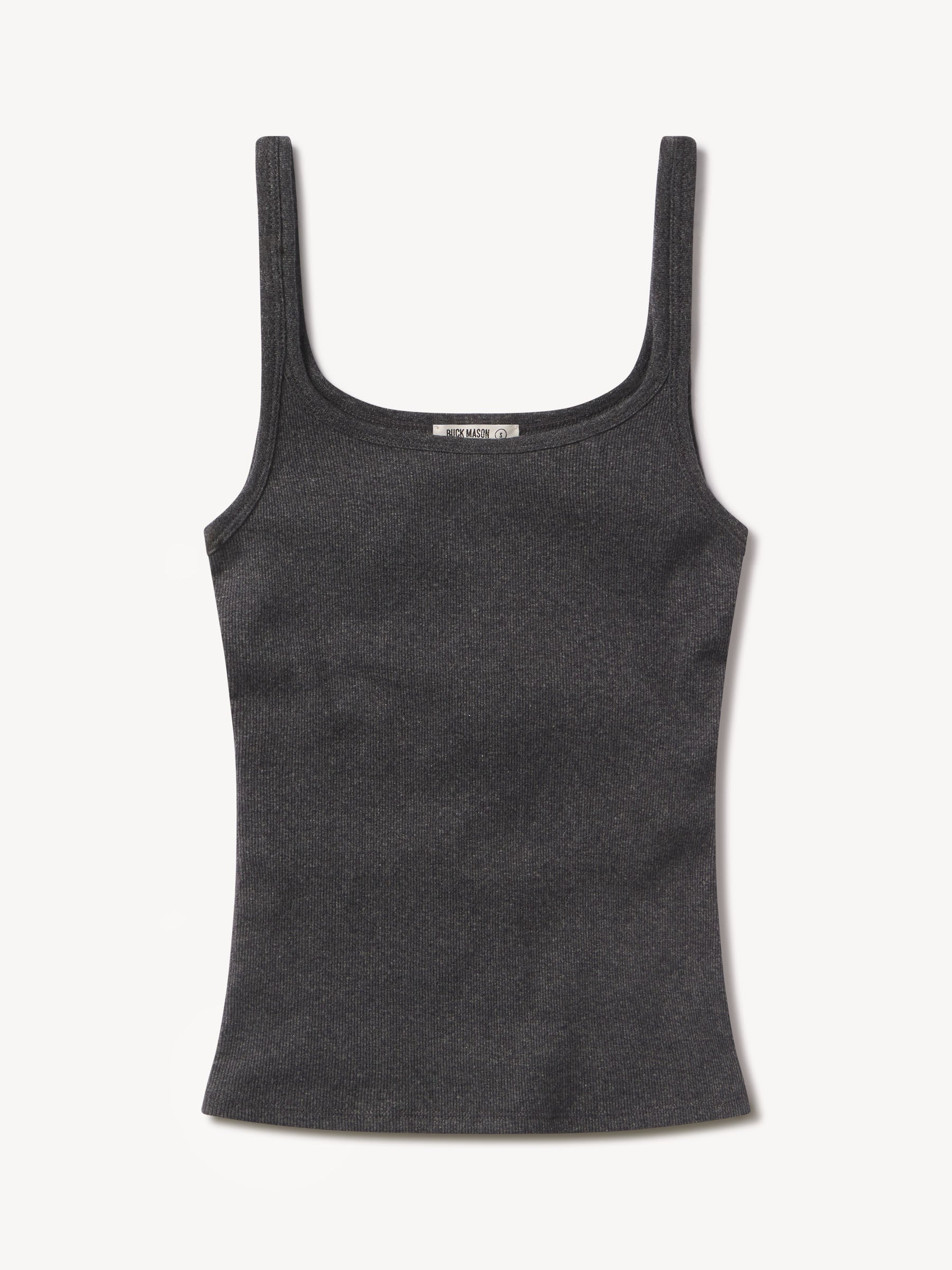 Slim fit ribbed scoop neck tank cut from 295 GSM stretch cotton that holds its shape. 2×2 rib structure—two rows of rib stitch, two rows of jersey stitch—is offset by contrast 1×1 rib at the neck. Constructed with coverstitching throughout and flatlock stitching at the side seams. Garment washed for a lived-in feel.