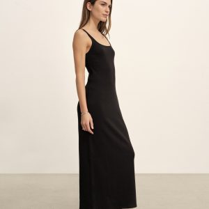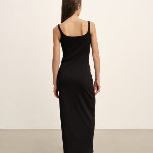 Slim fit ribbed scoop neck tank dress that’s fitted to the waist, then relaxes to hit below the calf in a 54” length. An easy, flattering silhouette in 295 GSM stretch cotton that holds its shape. 2×2 rib structure—two rows of rib stitch, two rows of jersey stitch—is offset by contrast 1×1 rib at the neck. Constructed with coverstitching throughout and flatlock stitching and godets at the side seams for extra volume. Garment washed for a lived-in feel.