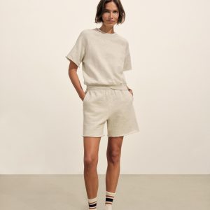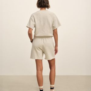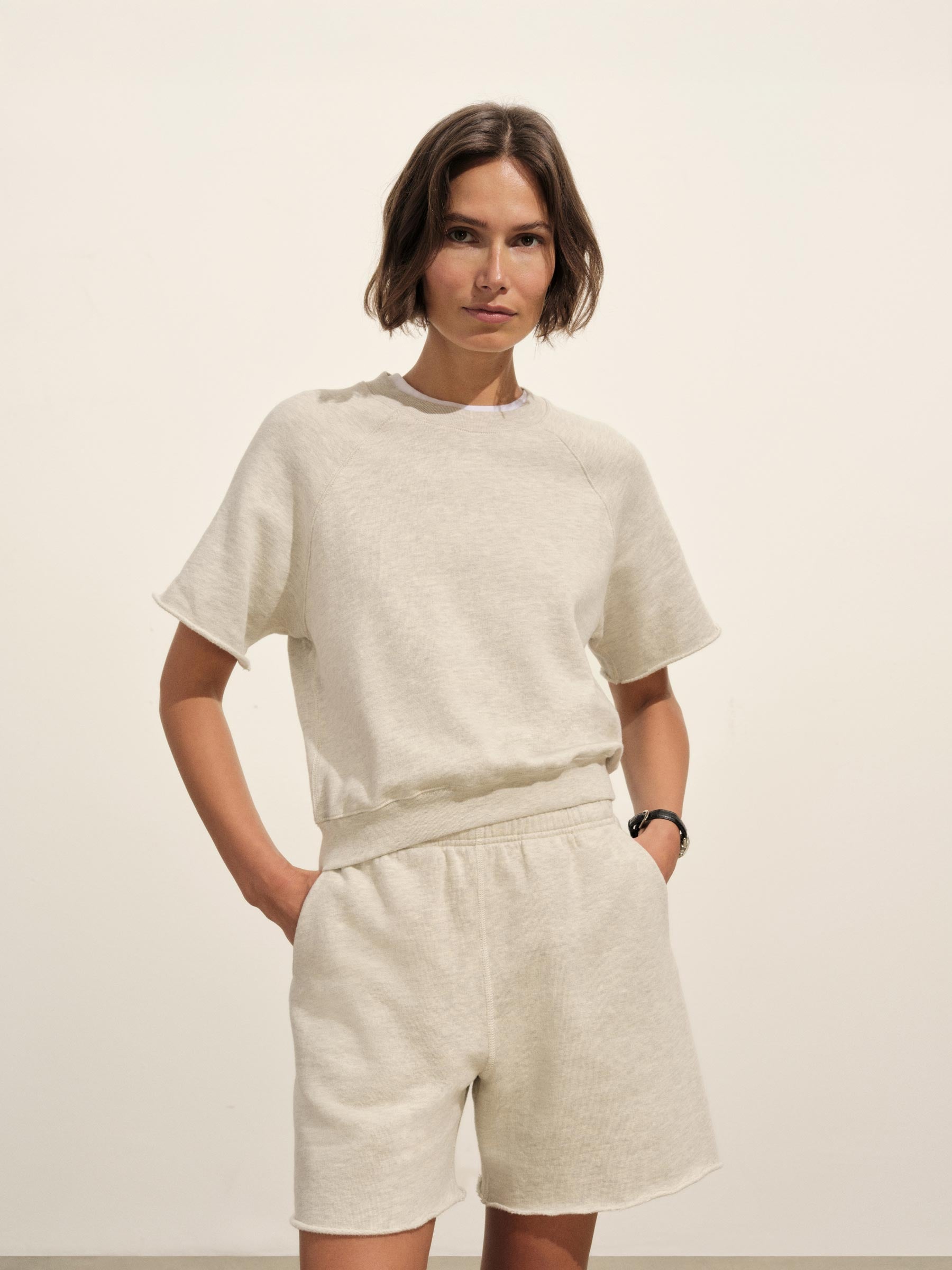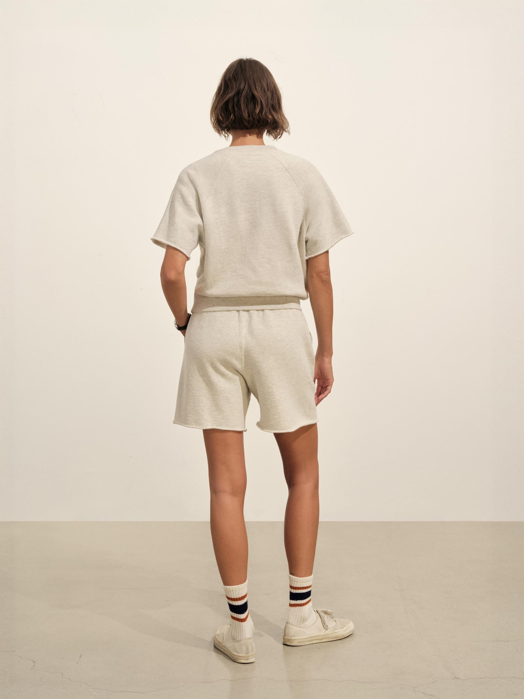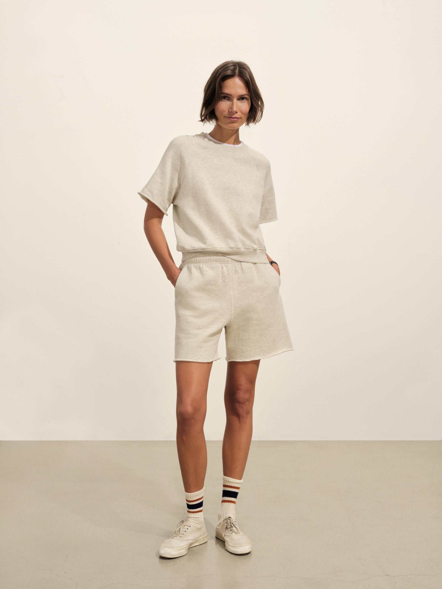 Relaxed crewneck sweatshirt with cut-off sleeves in 290 GSM yarn-dyed cotton French terry with a semi-brushed back. Features a “Dorito” insert at the neckline for shape retention, drop shoulders, and 1×1 ribbing at the collar and waistband. Garment washed for a lived-in feel. Pair it with the Interloop Cut Off Sweatshort to complete the look.