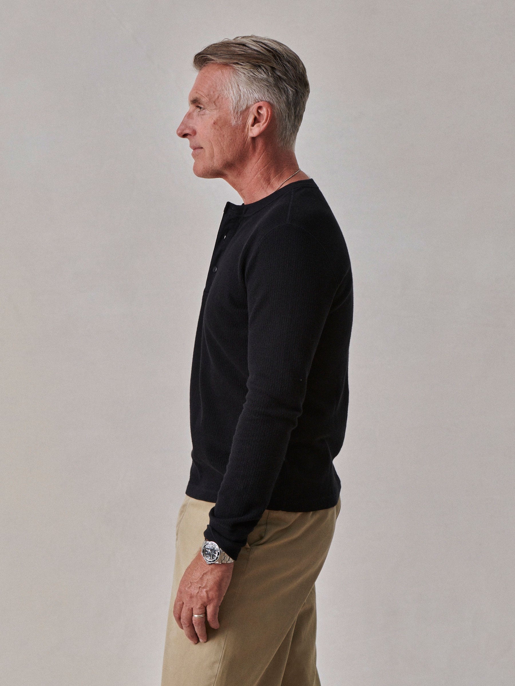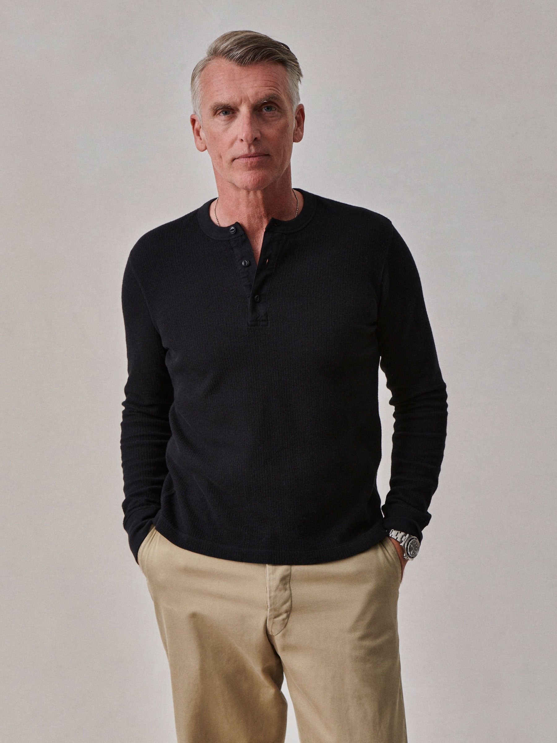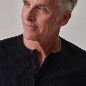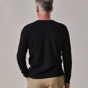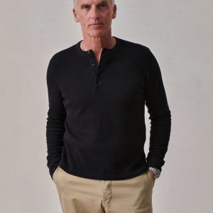 Classic fit thermal long sleeve henley with a straight hem. This 250 GSM French rib cotton double knit features a waffle-knit face and a smooth jersey back. Details include a woven three-button placket and corozo buttons. Constructed with ribbed cuffs and flat-lock stitching throughout for improved comfort and durability. Garment washed with enzymes and softener for a lived-in feel.